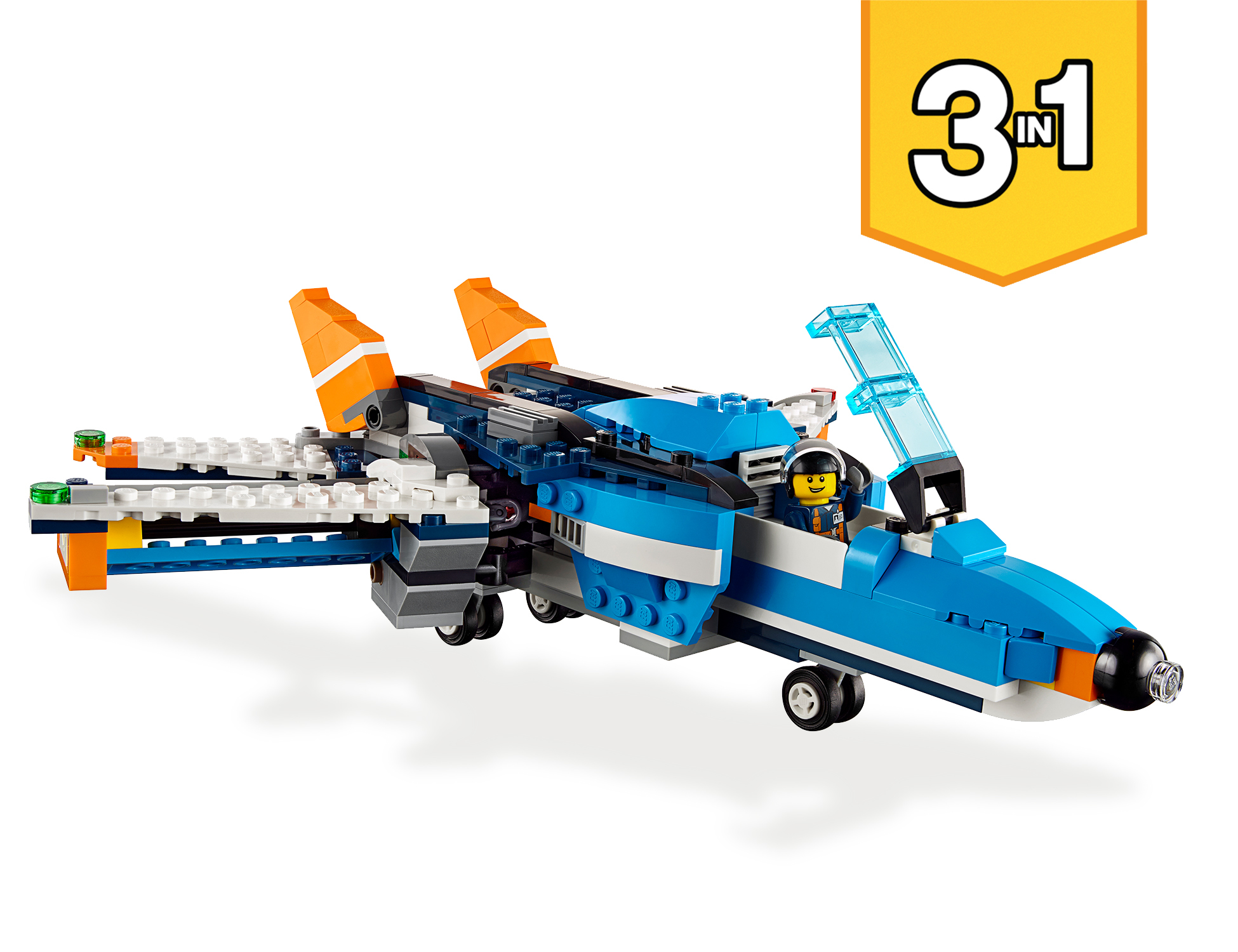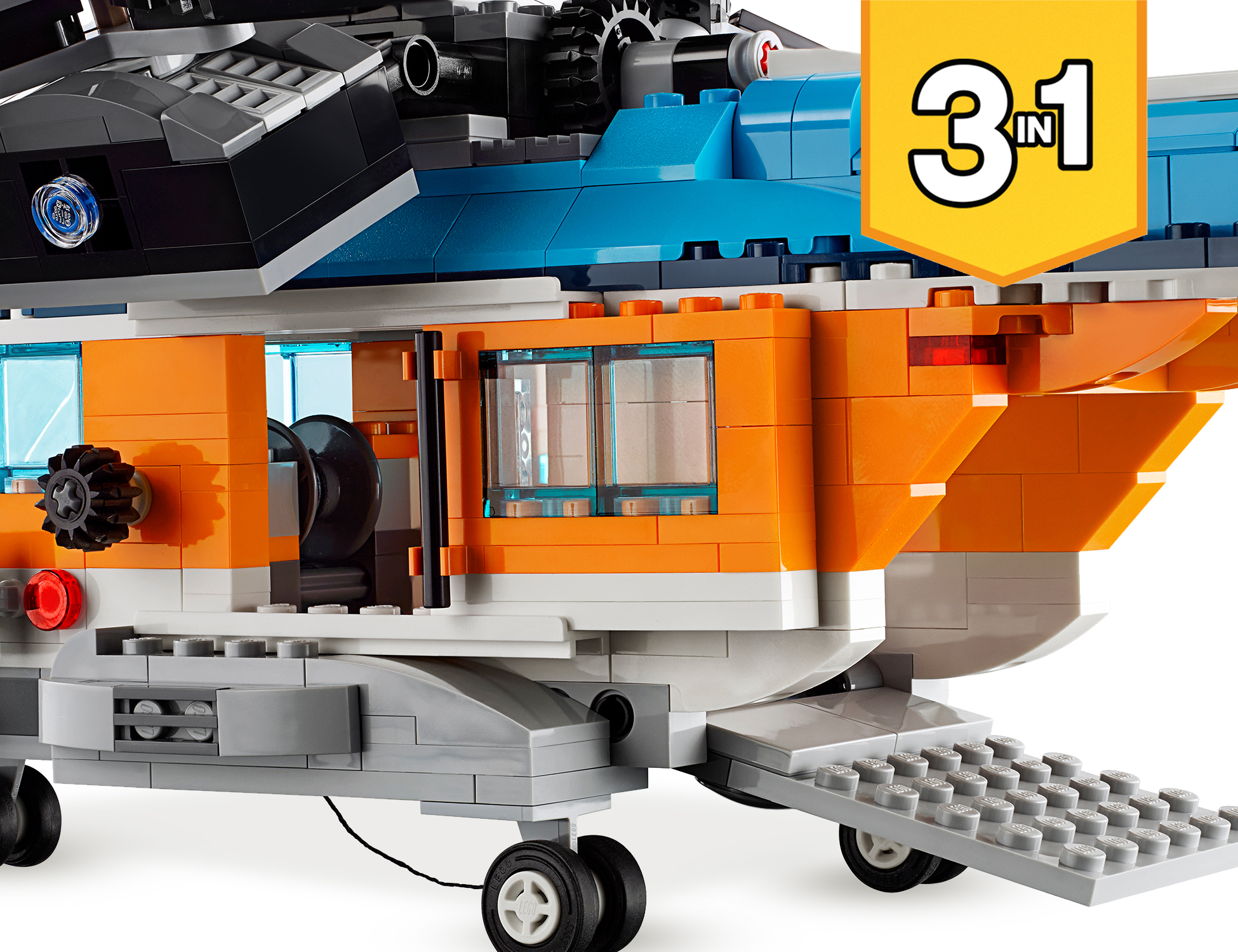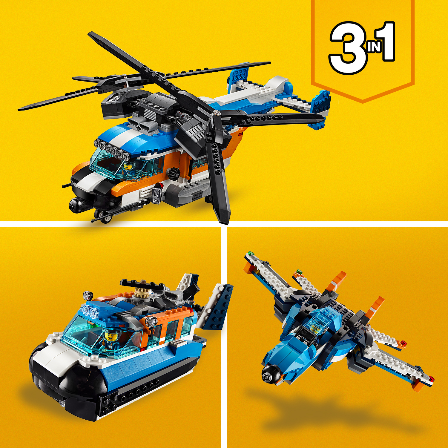 | La boîte contient | • 3 possibilités de construction avec cet ensemble LEGO® Creator 3-en-1 : les enfants peuvent construire l'hélicoptère à double hélice, puis le transformer en super jet ou en aéroglisseur pour vivre d'autres aventures à pleine vitesse.• L'hélicoptère à double hélice comprend d'immenses hélices synchronisées, un cockpit aux vitres teintées avec 2 sièges, une porte latérale qui coulisse et une soute qui s'ouvre, ainsi qu'un treuil à actionner, plus un sous-marin robot qui peut être chargé dans la soute.• L'actionnement de la molette permet de faire tourner les grandes hélices synchronisées de l'hélicoptère.• À l'arrière de l'hélicoptère, la porte de la soute s'ouvre pour pouvoir y charger le sous-marin robot inclus.• La porte latérale de l'hélicoptère coulisse et le treuil peut être actionné au moyen de la molette.• L'hélicoptère est décoré de couleurs vives : orange, bleu, blanc, noir et gris.• Inclut une figurine de pilote, prêt pour l'aventure. • L'hélicoptère à double hélice mesure plus de 17 cm de haut, 37 cm de long et 33 m de large.• Le jet mesure plus de 8 cm de haut, 26 cm de long et 27 cm de large.• L'aéroglisseur mesure plus de 9 cm de haut, 20 cm de long et 8 cm de large. |