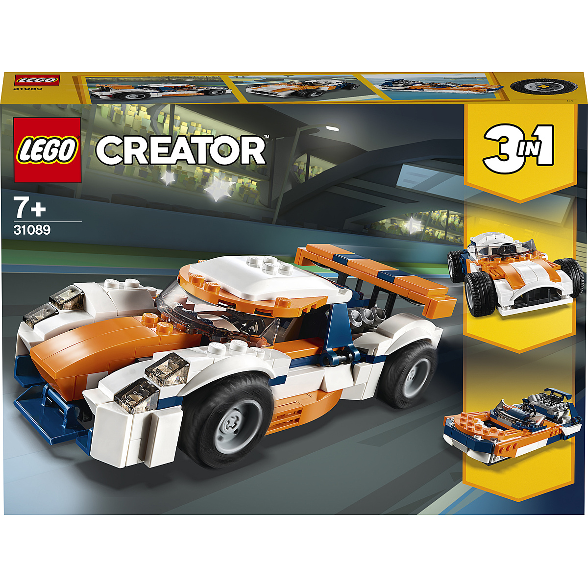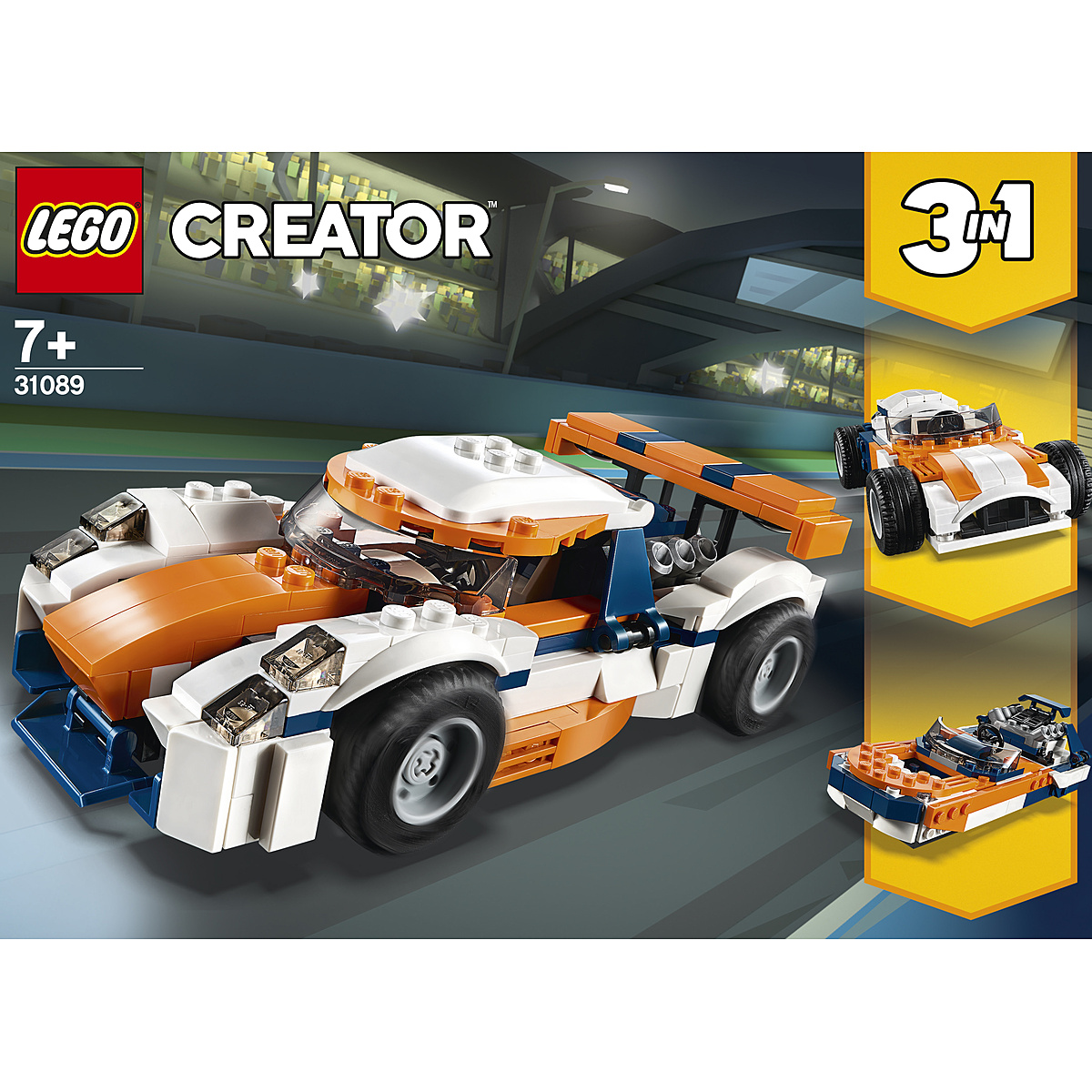 La boîte contient • 3 possibilités de construction avec cet ensemble 3-en-1 LEGO® Creator. Permet de construire la voiture de course puis de la transformer pour vivre des aventures sportives ultra-rapides au volant d’une voiture de course décapotable ou au volant d'un puissant hors-bord LEGO.• La voiture de course comprend une carrosserie aérodynamique avec de grandes prises d’air, un pare-brise arrondi et teinté, un cockpit accessible, un moteur visible monté à l’arrière, un aileron arrière et des pneus adhérents.• Des coloris sportifs orange, blancs et bleu foncé de la voiture de course.• Possibilité de soulever le toit pour accéder au cockpit de la voiture de course.• Une suite de virages serrés à grande vitesse pour gagner la course !• Le cockpit peut accueillir une figurine avec casque de course (non inclus).• La voiture de course mesure plus de 5 cm de haut, 16 cm de long et 7 cm de large.• La voiture de course classique mesure plus de 4 cm de haut, 14 cm de long et 7 cm de large• Le bateau de course mesure plus de 4 cm de haut, 14 cm de long et 7 cm de large.