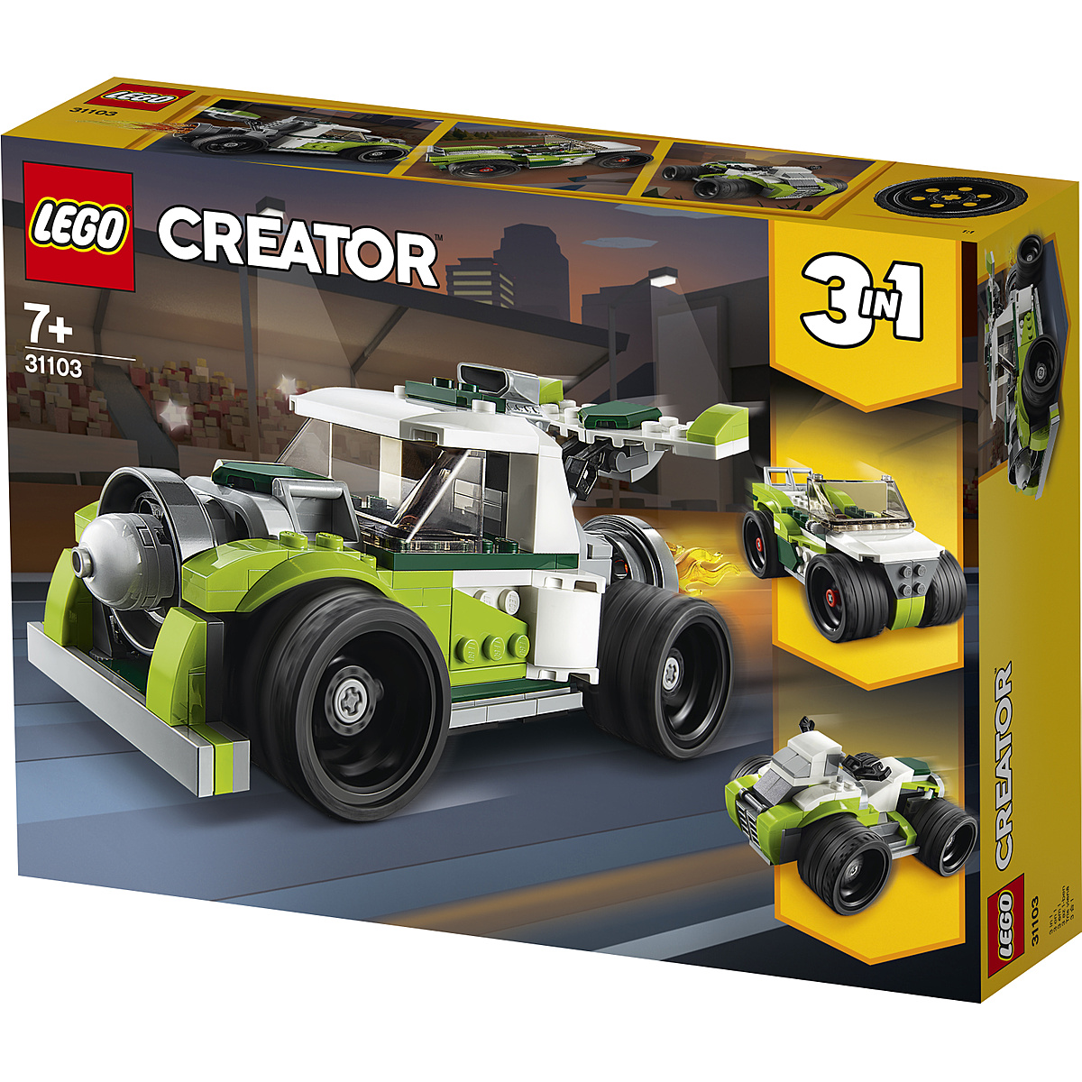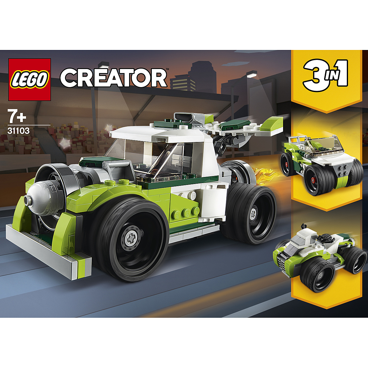 La boîte contient • Le jeu de rôle créatif est encouragé avec ce set passionnant qui inclut 3 modèles en 1 : un camion-fusée, un tout-terrain et un quad. Formidable cadeau pour les enfants ; de plus, le fait de construire et de transformer prolonge le jeu à l’infini.• Les enfants développent leurs capacités de construction avec ce jouet Creator 3-en-1 (31103), à bord du camion-fusée, en escaladant des rochers avec le tout-terrain, en faisant la course sur le quad, ou en construisant ce qu'ils aiment.• Ce set propose 3 options de construction en 1, pour créer des véhicules à utiliser seuls ou à combiner avec d’autres sets LEGO®. Les enfants améliorent leurs capacités de construction et leurs talents créatifs à chaque fois qu'ils jouent.• Les fans de véhicules et de construction créative adoreront ce set. Le camion-fusée, le robuste tout-terrain et le quad rapide sont de formidables cadeaux en toutes occasions pour les garçons et les filles de 7 ans et plus.• Détaillé et conçu pour l'action. Avec le camion-fusée qui mesure plus de 8 cm de haut, 22 cm de long et 7 cm de large, ce formidable jouet est suffisamment petit pour être emporté partout et assez grand pour accueillir une figurine (non incluse).• Les jouets qui fonctionnent sans piles contribuent à stimuler la capacité des enfants à jouer seuls et à résoudre des problèmes. De plus, ils leur procurent la joie d’inventer eux-mêmes de nouvelles histoires.• Le jeu démarre dès l’ouverture de la boîte, lorsque les enfants commencent à construire l'un des 3 modèles, ou à créer les leurs. Les instructions permettent aux enfants d’assembler les jouets vite, ce qui leur procure une grande satisfaction.• Les sets LEGO® Creator 3-en-1 inspirent des possibilités infinies aux plus jeunes. Ce set de jeu sur les camions permet aux enfants d’adapter leur créativité et leur imagination aux nouvelles histoires qu’ils imaginent.• Les briques LEGO® sont conformes aux normes industrielles les plus élevées, elles sont compatibles entre elles et peuvent toujours être parfaitement assemblées et séparées, et cela depuis 1958.• Le groupe LEGO soumet les briques et pièces LEGO® à des tests de chute, pression, torsion, chaleur pour s'assurer que chaque set respecte les normes de qualité et de sécurité les plus élevées au monde.
