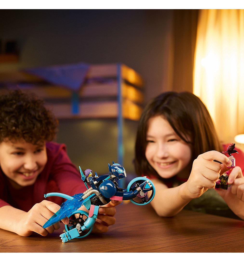 Stimulez l’imagination des enfants avec Le chat-moto de Zoey LEGO DREAMZzz (71479). Inspiré de la passionnante série TV, ce chat à construire et transformer invite les garçons et les filles dès 7 ans à voyager dans le monde des rêves avec un incroyable véhicule LEGO. Le corbeau de la Sorcière des cauchemars a volé un souvenir à Zoey et les enfants doivent l’aider à le récupérer ! Les jeunes rêveurs commencent par construire un chat articulé, puis le transforment en un superbe chat-moto doté de roues ou en un chat rapide avec des propulseurs. Le chat-moto poursuit le corbeau, et le chat rapide dans le combat. Ce set LEGO DREAMZZZ parfait pour stimuler la créativité prend vie grâce à 2 minifigurines, dont celle de Zoey qui se fixe sur le dos du chat et possède un arc fonctionnel. Les instructions de montage basées sur une histoire invitent les enfants à devenir des héros du monde des rêves à travers 2 aventures et à plonger dans le jeu de rôle avec ce jouet créatif sur le thème des chats. Les filles et les garçons à partir de 7 ans pourront développer leur imagination et jouer ensemble, afin de raconter des histoires surprenantes grâce à ce jouet interactif.