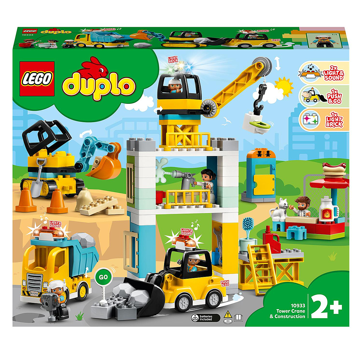 | La boîte contient | Piles;• Le set LEGO® DUPLO® Construction La grue et les engins de construction (10933) met en scène un chantier de construction animé, plein de véhicules fascinants, d’activités passionnantes et de personnages source de jeu de rôle, pour développer les compétences des tout-petits. • Inclut 5 personnages contemporains et 4 véhicules (un bulldozer, une pelleteuse, un camion à benne basculante et une grue) intégrant des fonctions amusantes, telles qu'un moteur actionné par poussée, des sons, des lumières et un treuil fonctionnel. • Les sons et les lumières donnent vie à ce chantier animé lorsque les enfants soulèvent le bâtiment des toilettes avec la grue, livrent les matériaux et enlèvent les gravats dans la rue. Et lorsque sonne l’heure de la pause, direction le stand de hot-dogs ! • Pour ceux qui recherchent le meilleur cadeau répondant à l'évolution des besoins d'un tout-petit, ce set de construction regorgeant de fonctions propose tout ce qu'un petit ouvrier de chantier de 2 ans et plus peut attendre d’un set à manipuler avec des engins fonctionnels. • Le modèle principal avec la grue mesure plus de 40 cm de haut, 20 cm de large et 25 cm de profondeur, pour un jeu grand format plein d’imagination, avec des pièces parfaitement adaptées aux petites mains qui peuvent ainsi facilement les saisir et les assembler. • Le jeu est alimenté par l'imagination des enfants ; les lumières et les sons par 3 piles LR41 (piles bouton) et 3 piles LR44 (piles bouton), toutes incluses dans le set. • Des instructions claires et simples sont incluses pour permettre aux parents et aux enfants de construire, jouer et profiter au maximum de toutes les fonctionnalités de ce set polyvalent dès l’ouverture de la boîte. • Les sets de jeu LEGO® DUPLO® aux possibilités infinies sont conçus pour amuser, stimuler et inspirer l'imagination des enfants d'âge préscolaire avec des scènes familières, des personnages amusants et des pièces adaptées aux petites mains. • Les sets de construction LEGO® DUPLO® sont faciles à saisir, assembler et démonter par les petites mains, parce qu’ils sont conformes aux normes industrielles les plus élevées – et cela depuis 1969. • Le groupe LEGO soumet toutes les briques et pièces LEGO® DUPLO® à des tests de chute, de chaleur, d'écrasement et de torsion, puis les analyse afin de vérifier que chaque jouet pour petits constructeurs est conforme aux normes de sécurité les plus élevées au monde. |