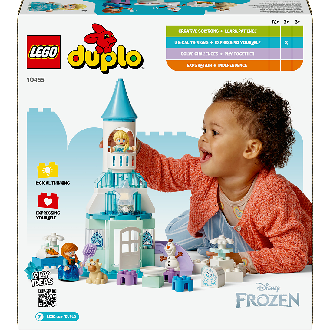 Les tout-petits dès 2 ans découvrent le jeu créatif, tout en prenant soin de bébé Sven avec le jeu de construction LEGO DUPLO │ Disney La fête d’Anna et Elsa au château de glace (10455). Incluant les personnages LEGO DUPLO │ Disney d’Elsa, d'Anna, de Bébé Sven et d'Olaf, cette maquette inspire un jeu de rôle créatif dans le château de La Reine des neiges. Grâce aux nombreuses expériences d’apprentissage, ce château à construire aide les enfants en bas âge à exercer leur motricité fine et regorge d’accessoires inspirants. Les constructeurs en herbe et leur famille peuvent prendre soin du bébé renne et imaginer des activités portées sur la bienveillance. Ce jouet de construction et d’apprentissage regorge de détails qui stimulent les sens. Elsa et Anna portent des jupes en tissu doux à toucher et les petits doigts peuvent ouvrir la porte et explorer l’intérieur du château de La Reine des neiges. Une brique lumineuse multicolore permet de recréer des aurores boréales.