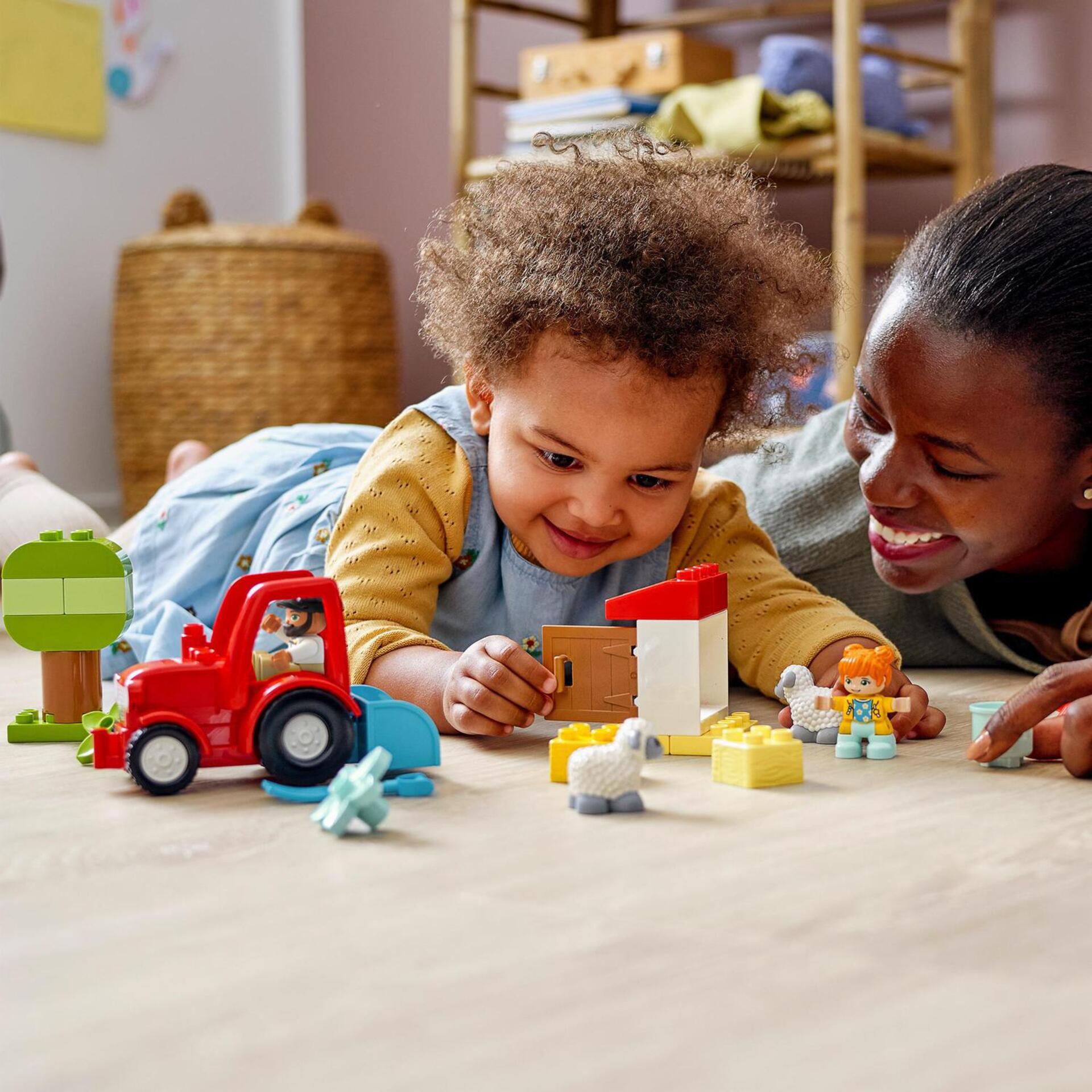 Faites découvrir aux tout-petits le bonheur de jouer avec un tracteur, de soccuper danimaux et dimaginer sans fin avec le set Le tracteur et les animaux LEGO® DUPLO® Town (10950). Ce jouet polyvalent inspirera des heures de jeu et dapprentissage ludique.Apprendre en samusant avec une fermeLes parents et les enfants dâge préscolaire vont partager des moments magiques à la ferme. Ce set inclut un tracteur qui tire une remorque pleine doutils, 2 adorables moutons, un fermier et un enfant. En jouant à transporter et à nourrir les moutons, les tout-petits développent leur motricité fine et leurs aptitudes sociales et émotionnelles.Jouets éducatifs à manipuler pour les tout-petitsLes jouets LEGO DUPLO placent entre les mains des jeunes enfants un univers infini de jeu, dexpression personnelle et dapprentissage ludique. Avec les sets DUPLO, parents et enfants partagent de précieuses étapes déveil en jouant ensemble.