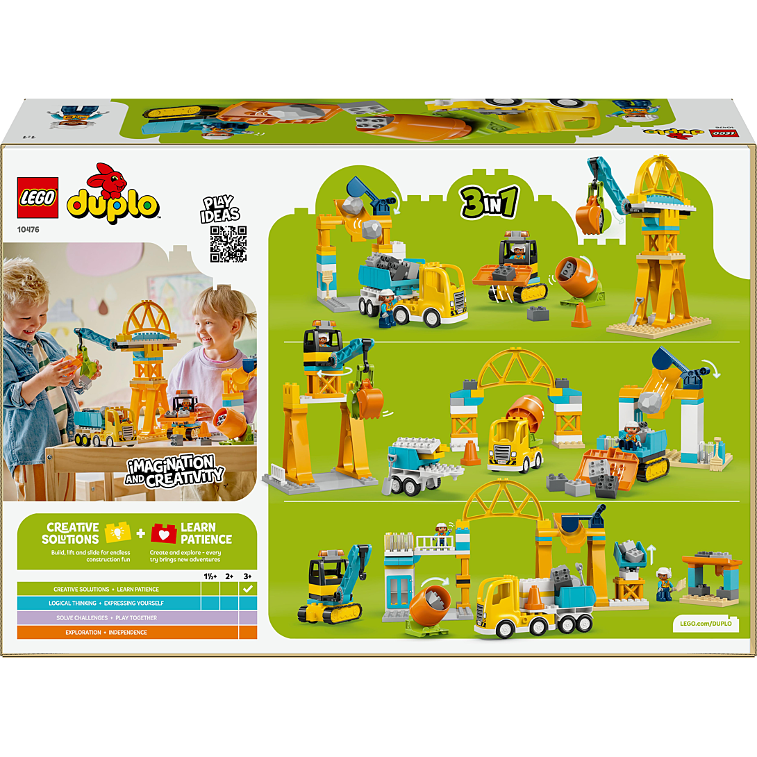 Grâce au jouet interactif Le chantier et les véhicules de construction 3-en-1 (10476), la création est infinie ! Les enfants dès 3 ans s’immergent dans un chantier animé avec des camions à charger et décharger, ou des rochers et des briques à déplacer avec différents engins de chantier LEGO DUPLO. Ils peuvent construire un bulldozer avec un godet articulé, un camion à benne basculante, une bétonnière avec une cuve rotative et une grue à bras et godet articulés. Les briques permettent également de construire une grande grue, une station de chargement, ainsi qu’un pont sous lequel les véhicules peuvent passer. Ce jeu LEGO aux multiples options permet aux tout-petits d'acquérir de précieuses compétences. Les enfants qui aiment résoudre des problèmes exercent leur esprit critique en cherchant comment construire des bâtiments. Ils développent leur perception spatiale en utilisant les 2 figurines d’ouvriers pour déplacer les briques sur le chantier à l’aide des fonctionnalités des véhicules.