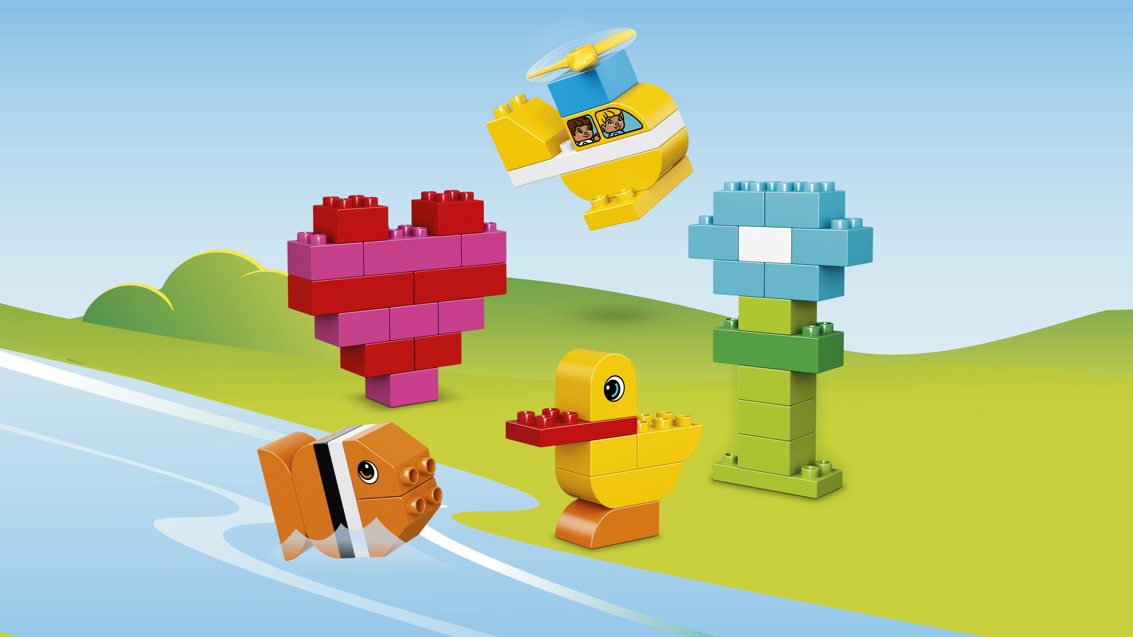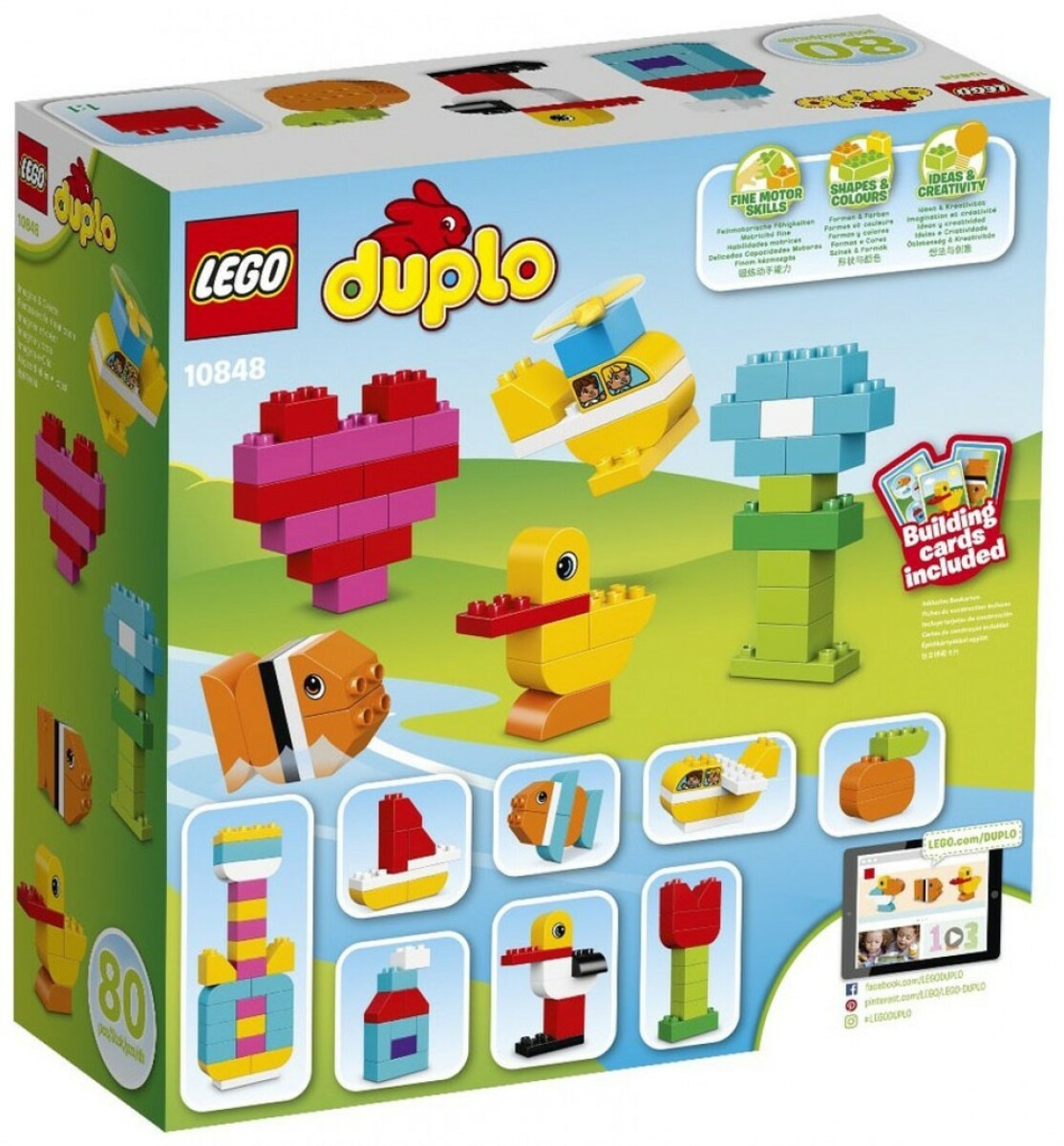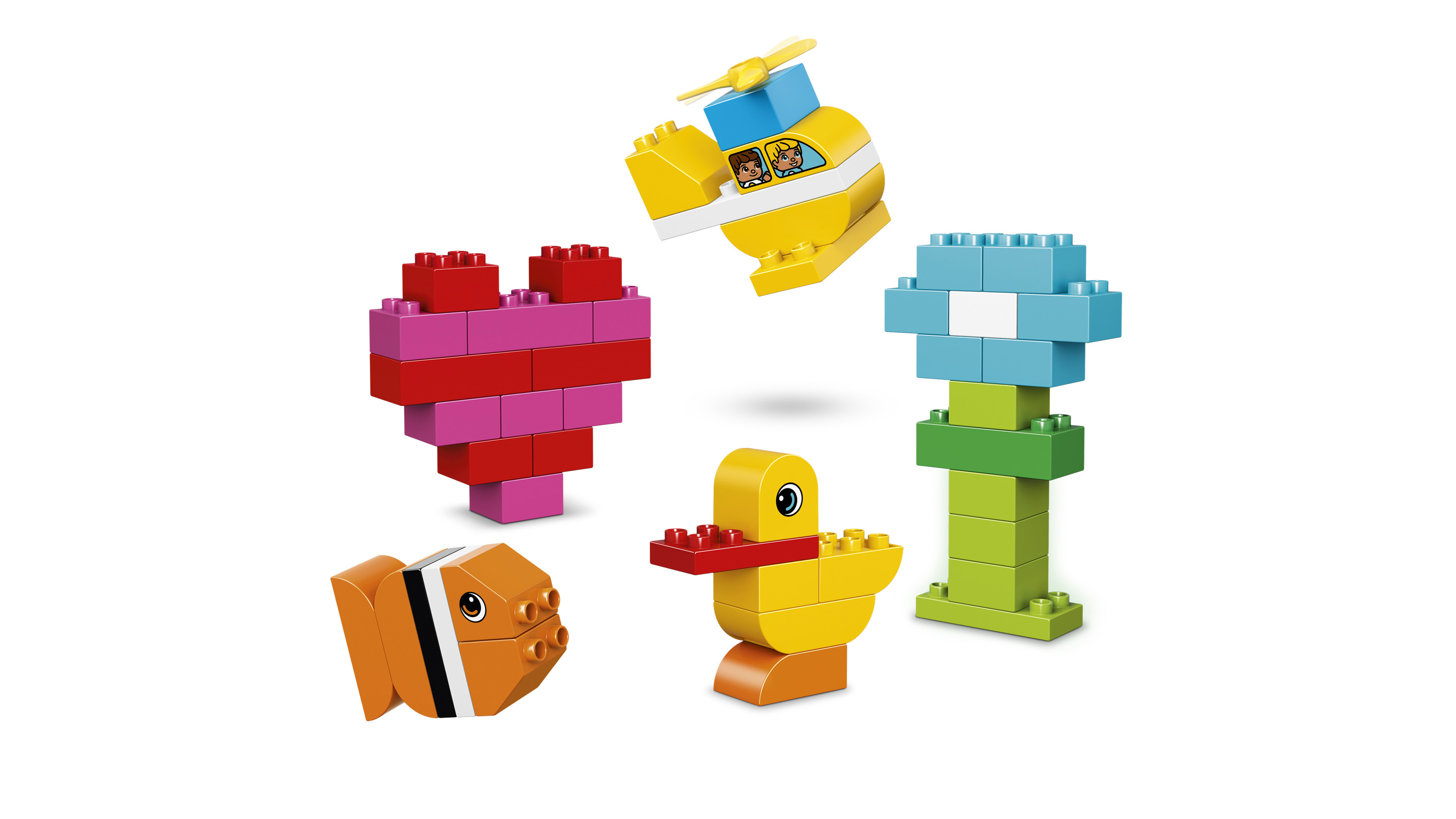 La boîte contient • Comprend 80 pièces LEGO® DUPLO® colorées, aux formes et aux dimensions différentes. • Inclut des briques décorées des deux côtés et une hélice. • Cet ensemble fournit des options de construction infinies pour aider les imaginations en herbe à s'épanouir. • Aidez votre jeune enfant à construire un hélicoptère, un poisson, une fleur...ou tout ce qu’il imagine ! • Des cartes de construction sont incluses pour stimuler la construction précoce. • Un formidable complément pour toute collection LEGO® DUPLO® ! • Les produits LEGO® DUPLO® sont amusants et sûrs pour les jeunes enfants. • Cet ensemble offre une expérience de construction et de jeu adaptée aux enfants de 18 mois à 3 ans.