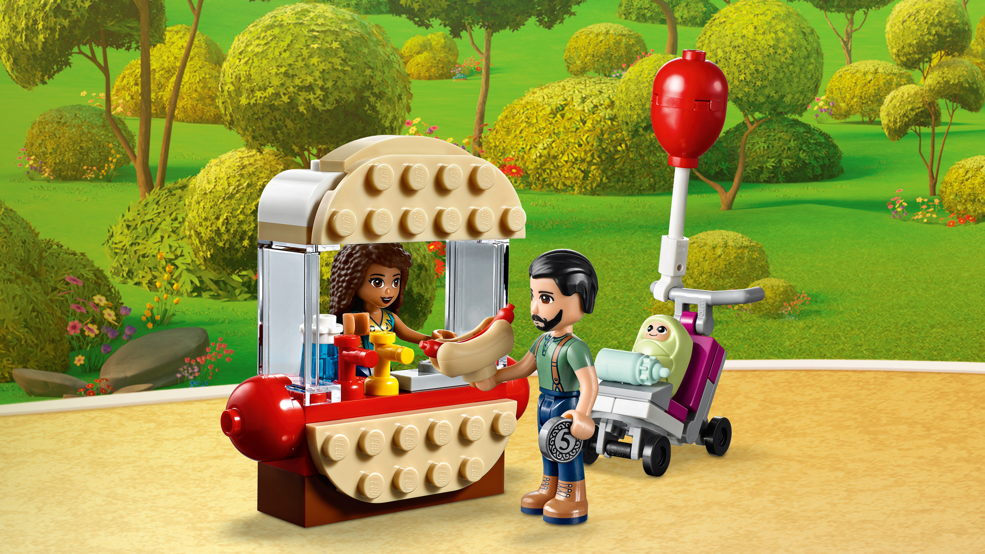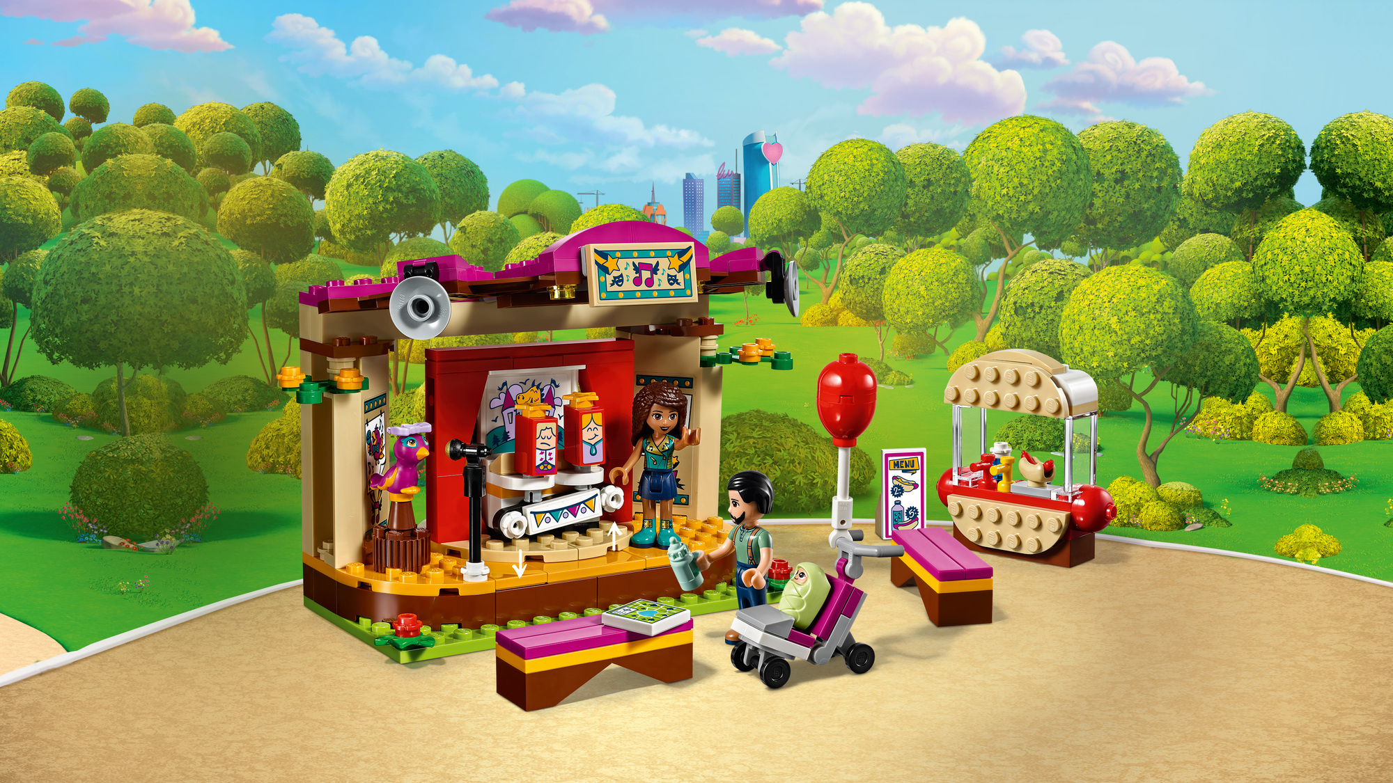 Occupe le devant de la scène pour une après-midi de spectacles dans le parc d'Heartlake City en commençant par une représentation de marionnettes ! Aide le papa et son bébé à s'asseoir sur un banc pour regarder le spectacle, puis appuie sur les touches du piano à l'arrière de la scène pour aider les marionnettes à se déplacer ! Ensuite, fais pivoter le fond de la scène pour aider Andréa et son oiseau Pepper à offrir une magnifique représentation musicale. Enfin, va au stand de hot-dogs pour savourer un en-cas après le spectacle.