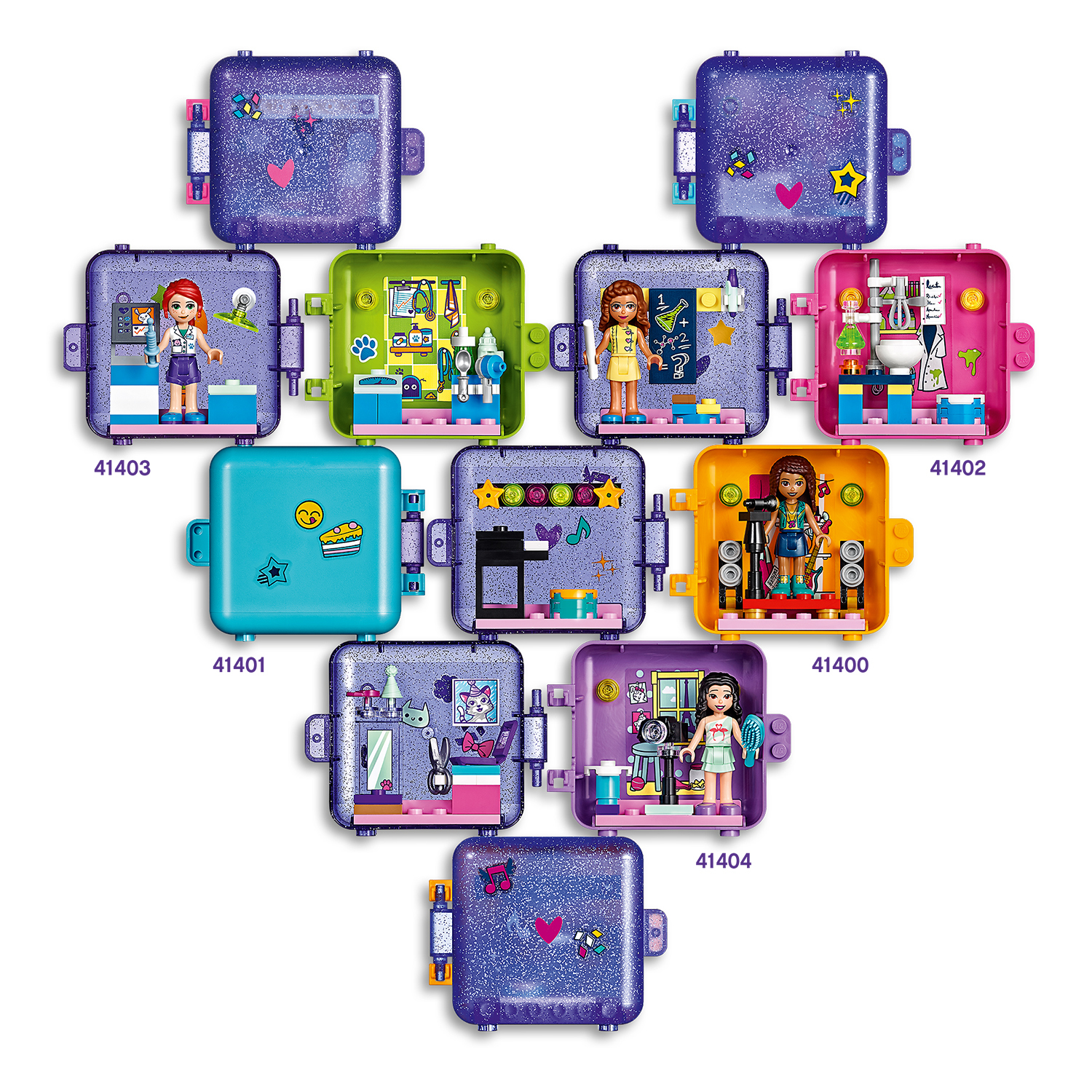 Chaque cube donne aux enfants un avant-goût du monde LEGO Friends. Et ils peuvent collectionner les 4 autres cubes. Chaque jouet renferme un animal mystère de couleur aléatoire, révélé uniquement à l'ouverture du cube. Les enfants peuvent assembler les cubes pour créer des formes amusantes. Les enfants découvrent le monde de Heartlake City, un lieu où réaliser leurs rêves avec de fabuleux amis.