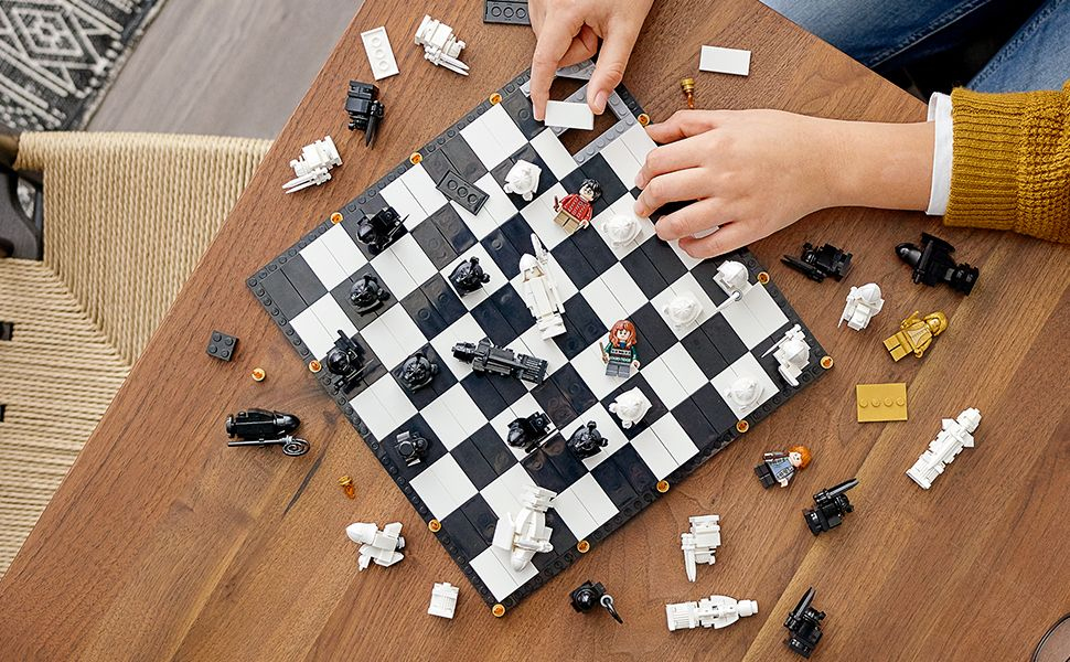 Super jeu d'échecs en briques. Les figurines qui accompagnent le produit correspondent parfaitement aux versions des personnages vues à l'écran dans le premier film.