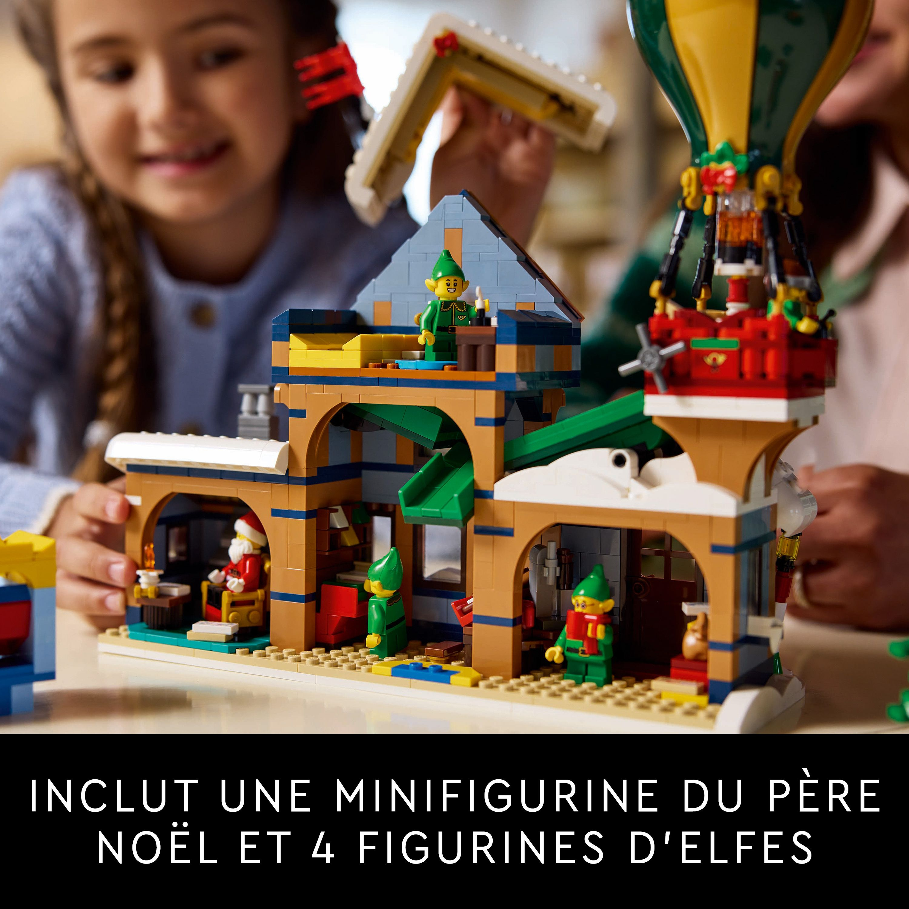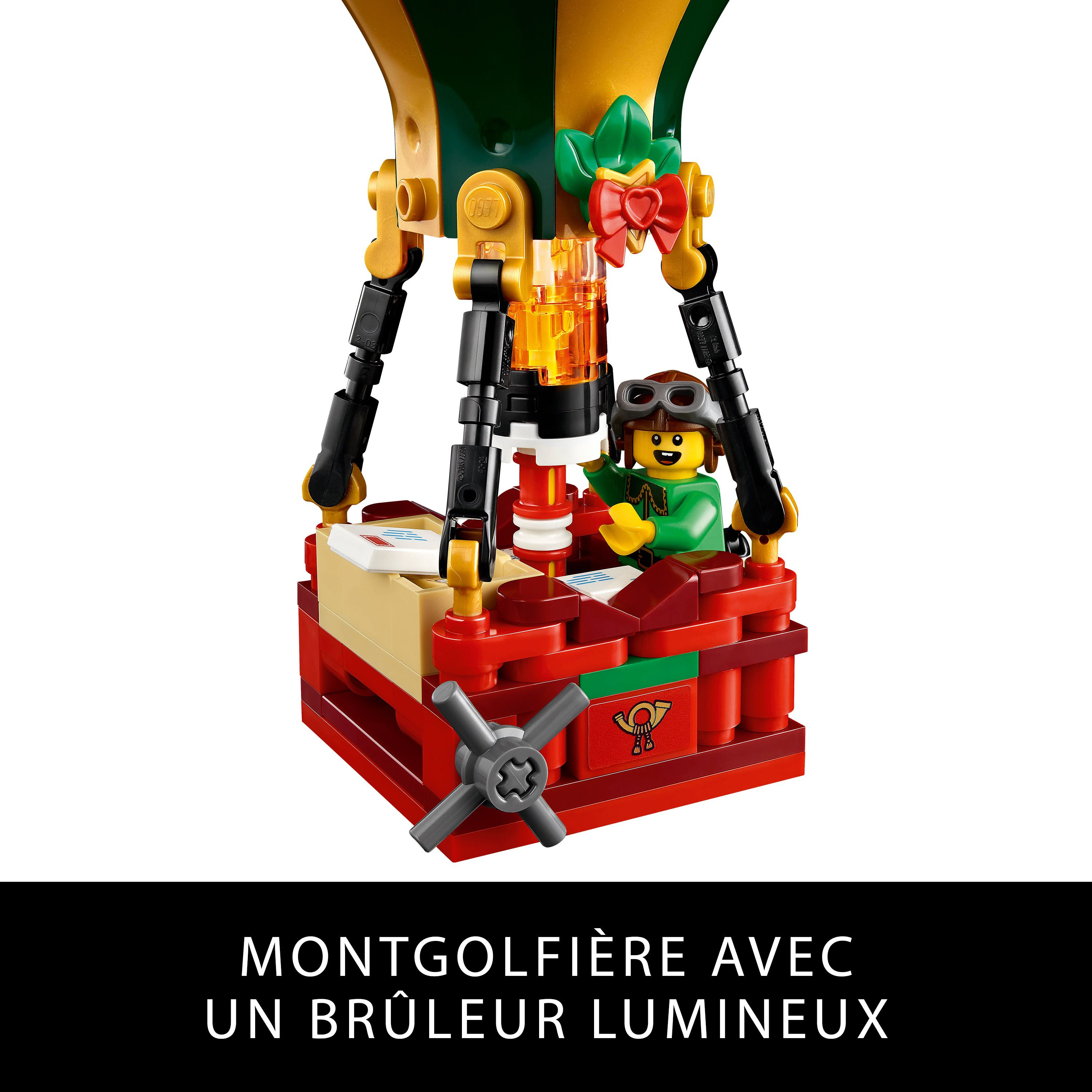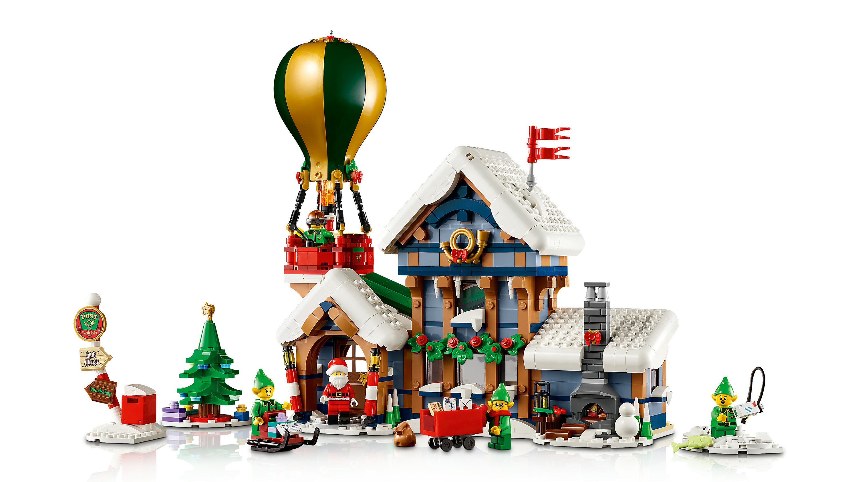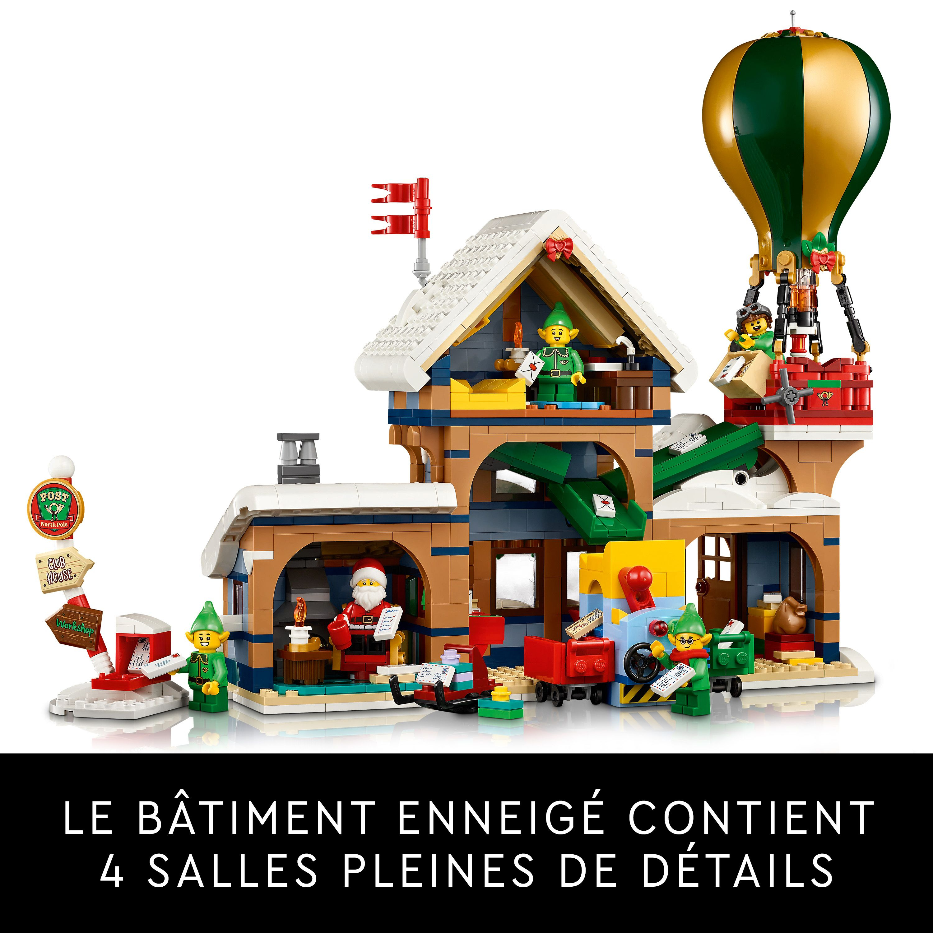 Le bureau de poste enneigé abrite le bureau du Père Noël avec un feu de bois, un centre de tri du courrier, un hall d’entrée avec une machine à café et un espace d’écriture au deuxième étage avec un toboggan pour le courrier. Le set inclut également une montgolfière avec un brûleur lumineux, un trieur de courrier, une scène de pêche sur la glace, un sapin de Noël, un panneau, une boîte aux lettres, un traîneau, une minifigurine de Père Noël et 4 lutins.