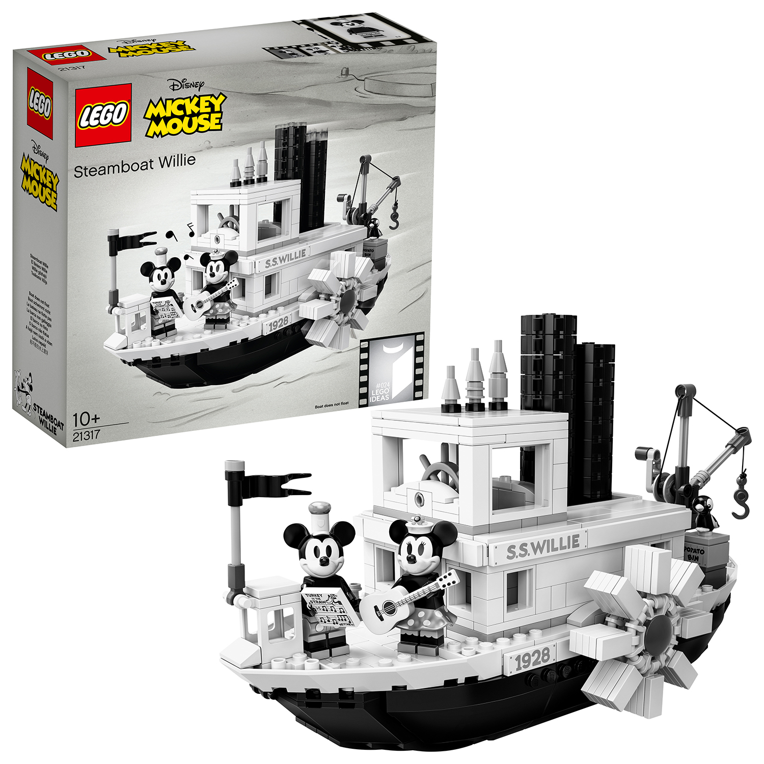 Les fans de Mickey Mouse et de Disney vont adorer ce jouet de construction Steamboat Willie LEGO® Ideas 21317 qui marque le 90e anniversaire du plus célèbre personnage de dessin animé de lhistoire. Mickey Mouse fait ses débuts à lécran avec Disney dans un dessin animé en noir et blanc de 1928 intitulé « Steamboat Willie », le premier film Disney à avoir une bande-son synchronisée. Cette version en briques LEGO du S.S. Willie comprend des tuyaux de vapeur qui montent et descendent et des roues qui pivotent lorsque le bateau est poussé. Le pont du bateau peut accueillir une figurine et inclut des détails nautiques inspirant le jeu, tels que le gouvernail du bateau, une bouée de sauvetage et une cloche à construire. Sur le pont, une grue permet de hisser la cargaison de pomme de terre. Cet ensemble de construction unique est livré avec les figurines de Mickey Mouse et Minnie (nouveautés davril 2019), chacune avec une décoration argentée spéciale, ainsi quun perroquet. Un ensemble LEGO idéal pour qu'enfants et adultes recréent les scènes du dessin animé Mickey Mouse original, ou simplement construisent et exposent ce modèle monochrome remarquable.