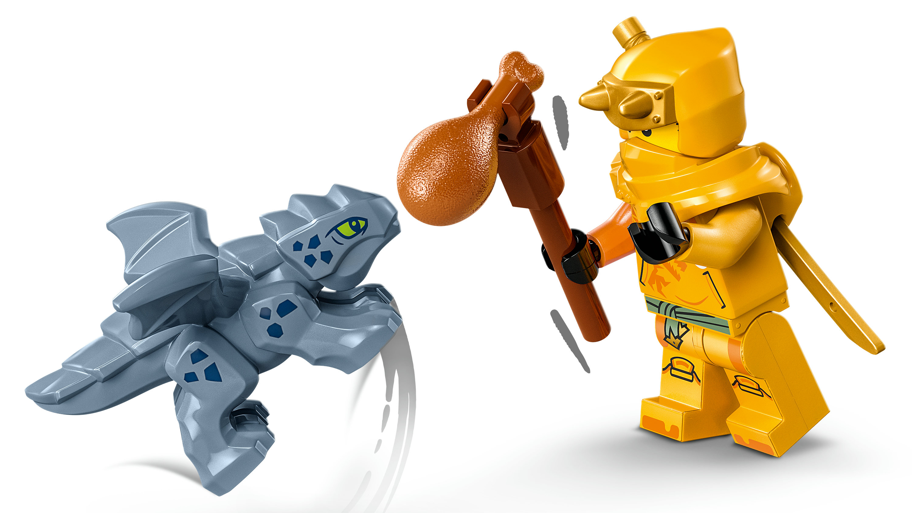 2 dragons – Le dragon d’énergie peut bouger la tête, les ailes et la queue et porte une selle pour transporter une minifigurine. Bébé Riyu se tient dans une grotte secrète contenant des cristaux d’énergie