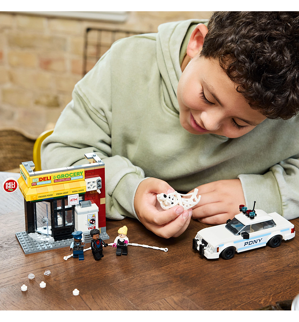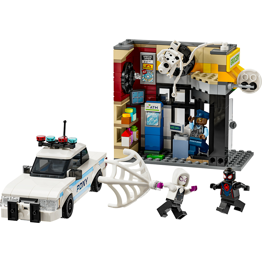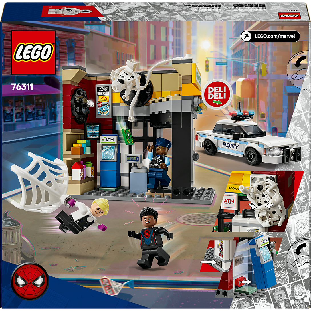Spider-Verse : Miles Morales contre La Tache (76311) est un jouet de construction d’exception pour les fans du film Spider-Man : Across the Spider-Verse de Marvel Studios dès 9 ans. Ce set de construction et de jeu LEGO® est une belle idée de cadeau pour les jeunes super-héros, notamment les fans de Marvel et les enfants qui aiment les jouets à manipuler. Le set Spider-Man contient 4 minifigurines : Miles Morales, La Tache, Gwen Stacy et l’officier Jefferson. L’épicerie est dotée d’une fonction Explosion de mur qui permet le retrait du distributeur automatique. Le modèle inclut une longue corde souple et une toile flexible suffisamment grande pour piéger une minifigurine. La voiture de police s’ouvre pour accueillir 2 minifigurines. Pour s’amuser davantage encore, les constructeurs peuvent zoomer, faire pivoter les modèles en 3D et suivre leur progression avec l’appli numérique LEGO Builder ludique et intuitive. Jouet à construire de 375 pièces – L’épicerie mesure plus de 11 cm de haut, 15 cm de large et 9 cm de profondeur