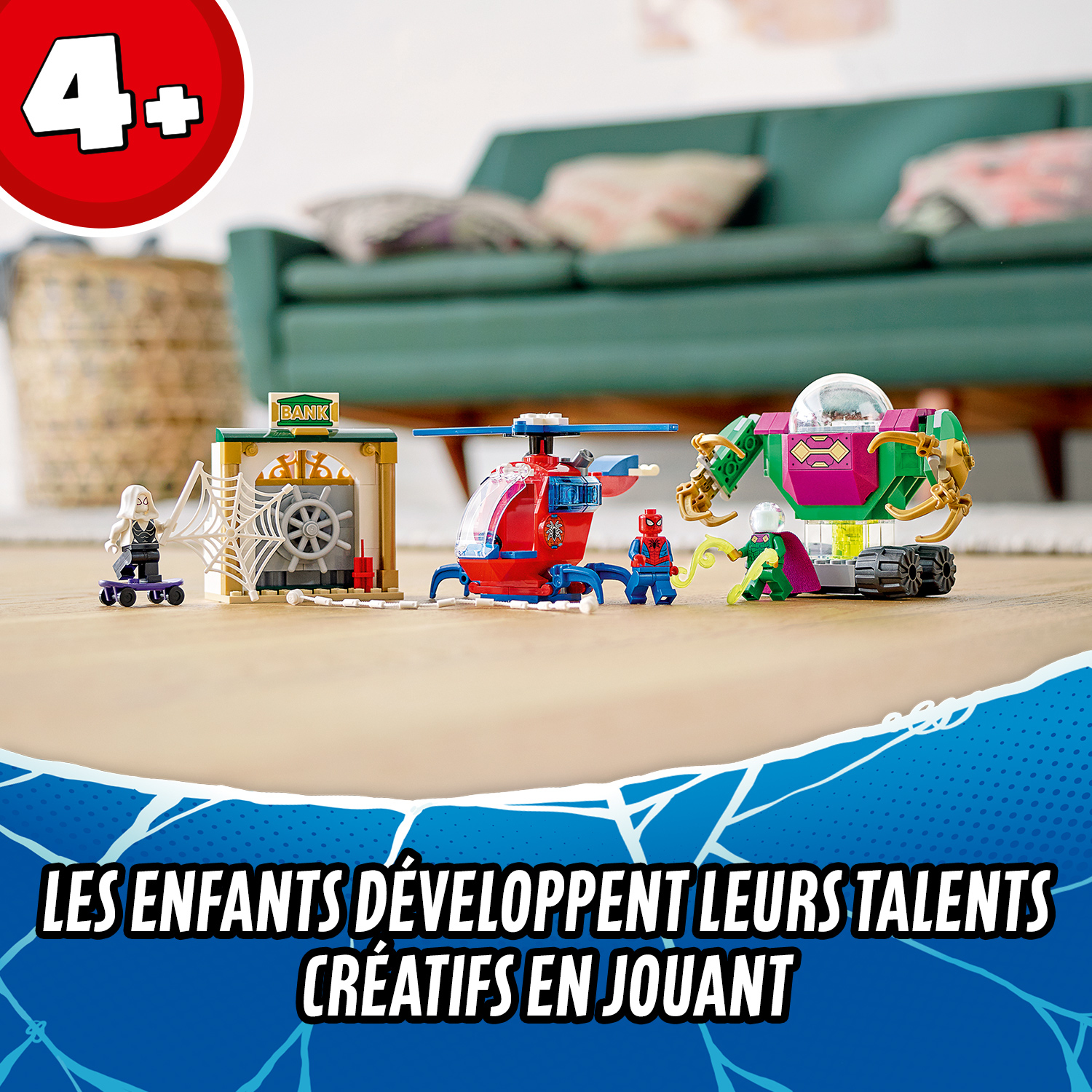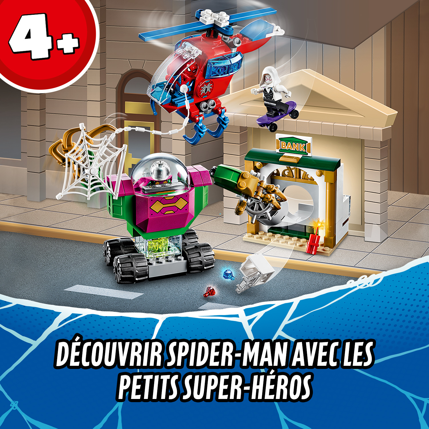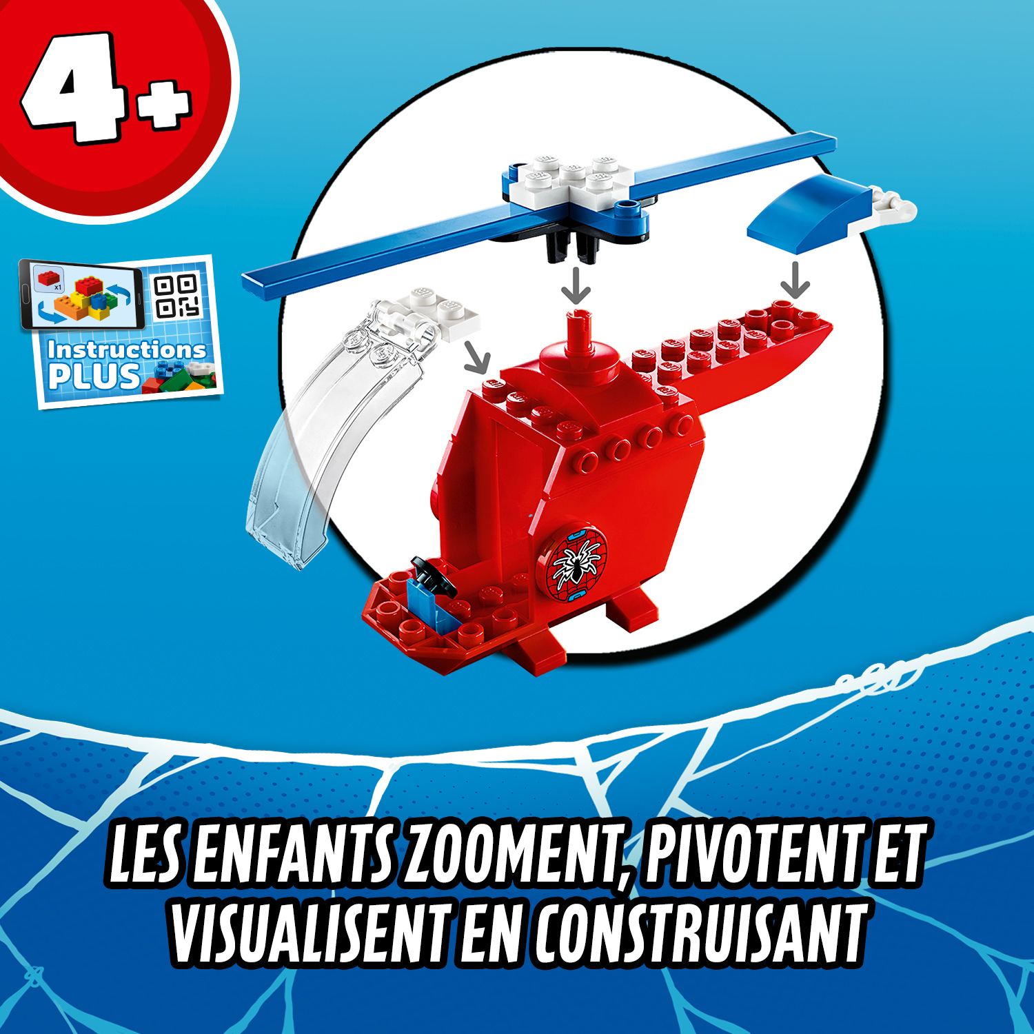 En plus des figurines LEGO de Spider-Man, Ghost Spider et Mystério, ce set sur le thème des super-héros inclut le Spider-coptère et le robot de Mystério ! Le robot possède des roues et des bras mobiles. Les enfants peuvent utiliser les « griffes » de l'hélicoptère de Spider-Man pour attraper Mystério, et détruire son robot. Un guide de construction simple explique lobjectif de chaque étape et l'appli LEGO Life gratuite inclut un zoom interactif et une fonction de rotation.