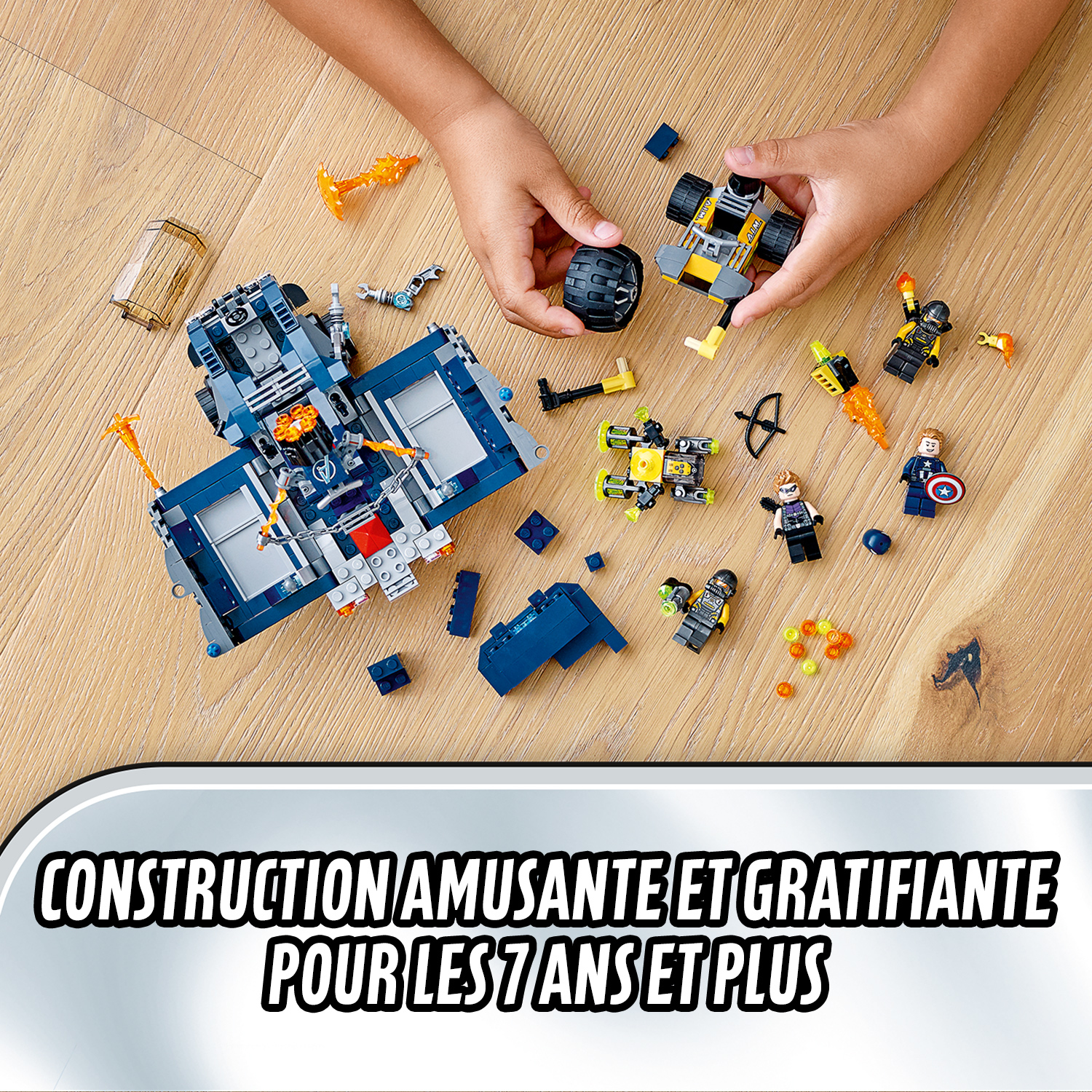 Ce set place l'action Marvel entre les mains des jeunes super-héros. Deux sales types font une embardée devant le camion des Avengers, puis lancent une attaque avec un drone. Les enfants vont adorer dévoiler l'arme secrète... une arbalète à 6 coups ! Avec 4 figurines (janvier 2020), un camion Avengers, une moto à trois roues, un drone et des armes, ce jouet LEGO Marvel Avengers est source dinspiration infinie.