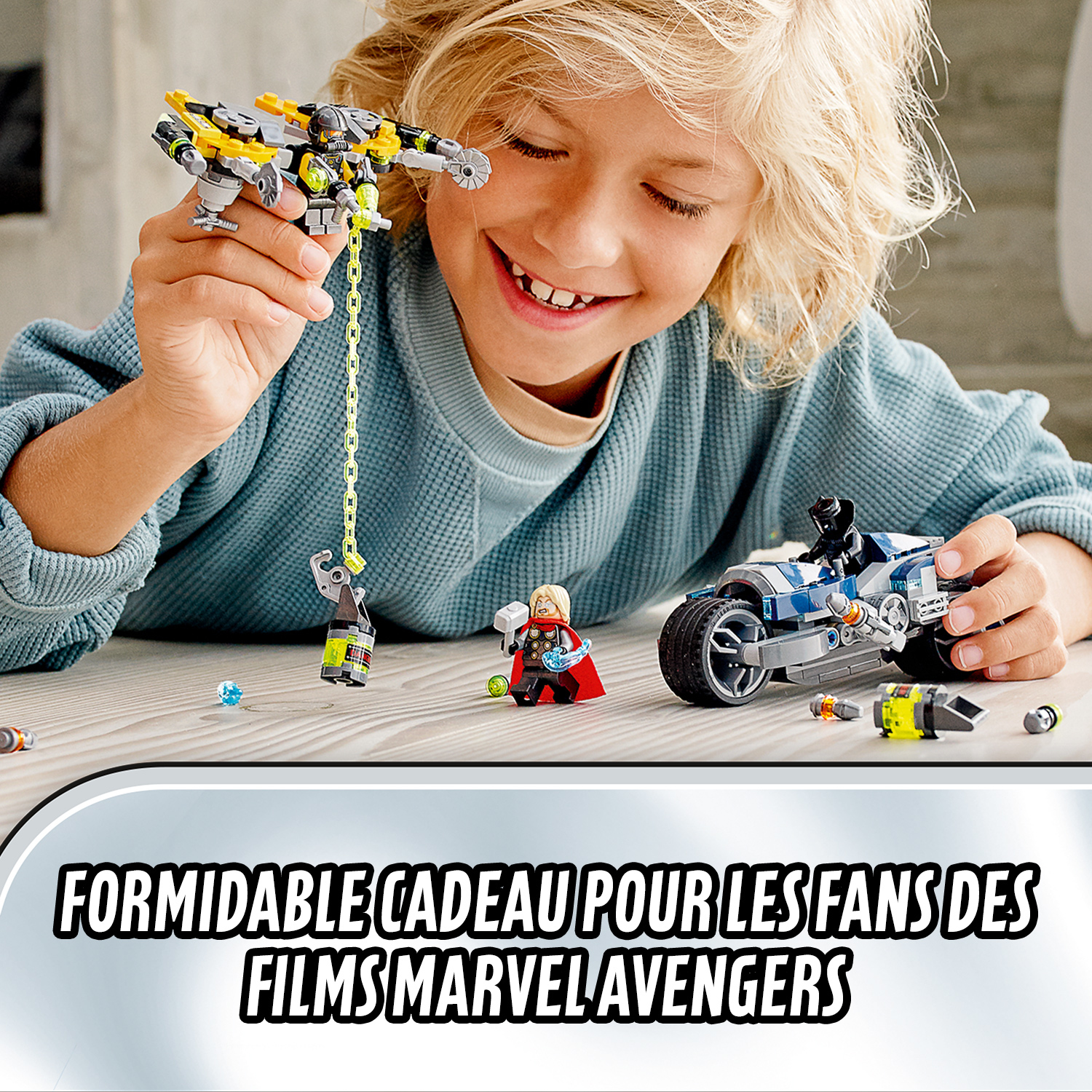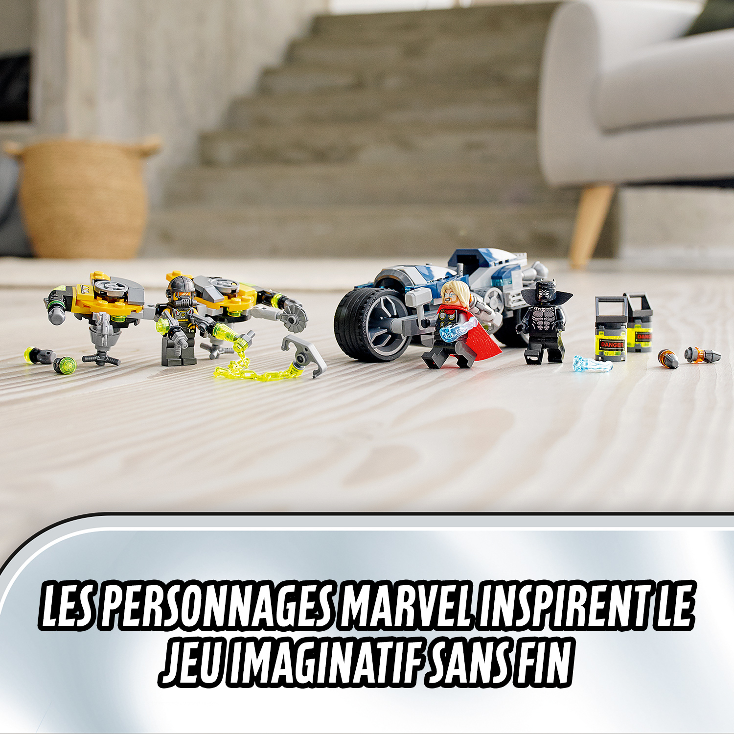 Lorsque les enfants découvrent ce set Marvel Avengers, ils sont transportés dans un univers survolté. Un méchant armé descend du ciel avec un réacteur dorsal équipé de fusils, de scies, d'un crochet et d'un canon, pour voler 2 cartouches mortelles. Black Panther fonce sur lui sur sa moto. Thor apparaît, brandissant son marteau. Avec 3 figurines, une moto et de nombreuses armes, ce set LEGO Marvel Avengers constitue un cadeau idéal pour les super-héros en herbe.