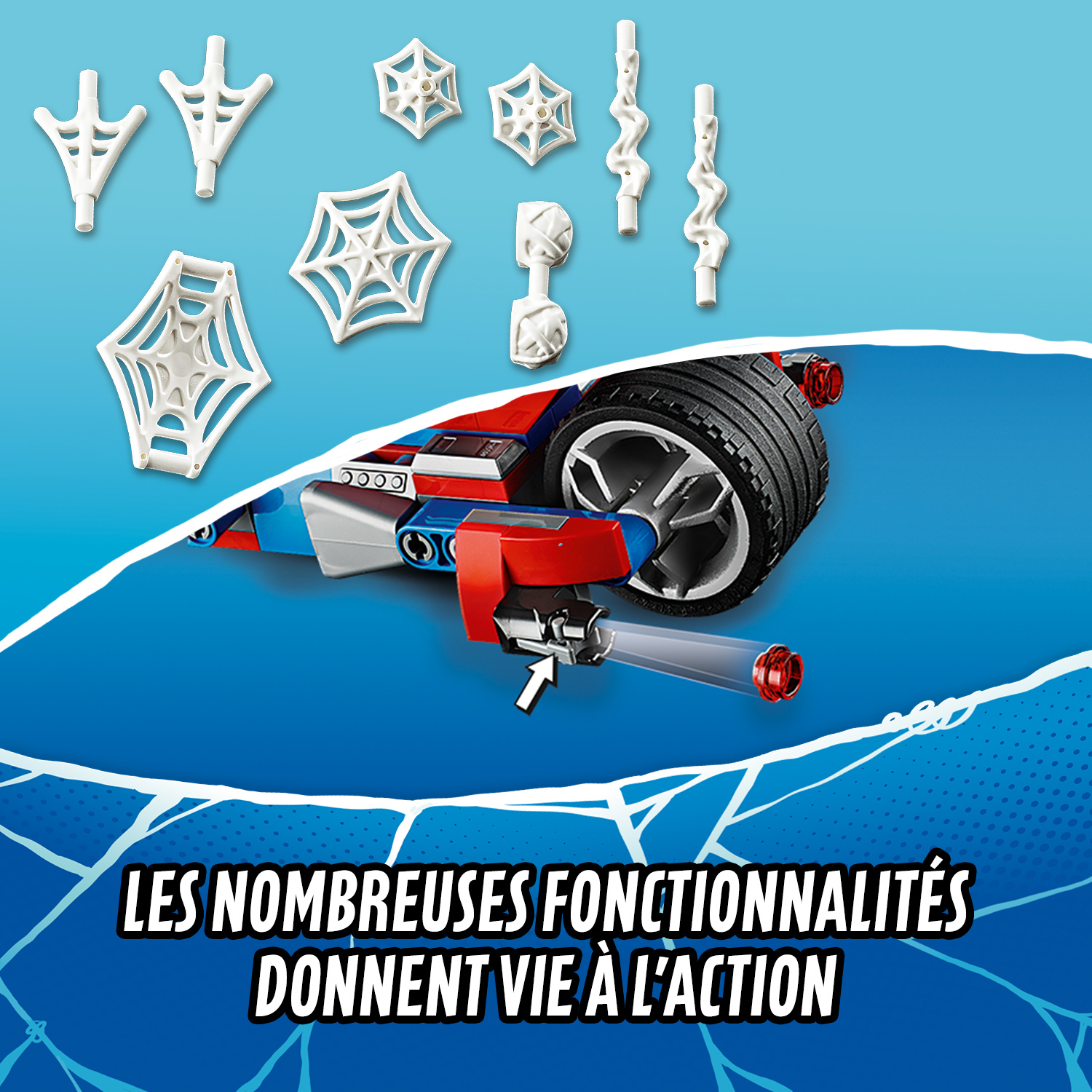 Docteur Octopus, alias Doc Ock, possède 4 bras robotiques. Mais Spider-Man et son énergique fille Spider-Girl disposent de la Spider-moto. Les enfants vont adorer séparer la moto en 2 véhicules : la moto hyper rapide de Spider-Man et la gigantesque « araignée qui marche » ! Inclut des fusils à tenons, des toiles à lancer et des possibilités infinies de jeu.