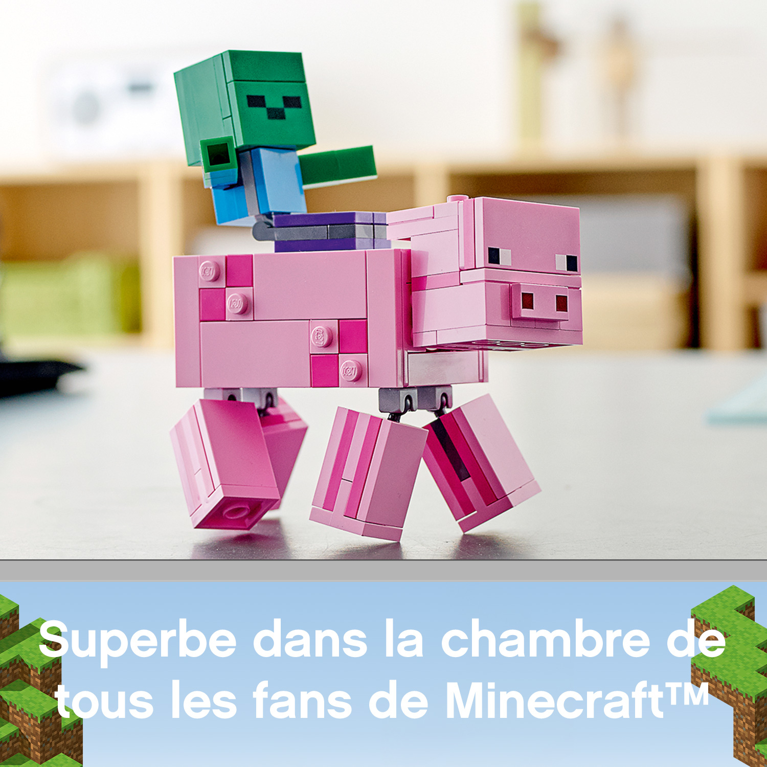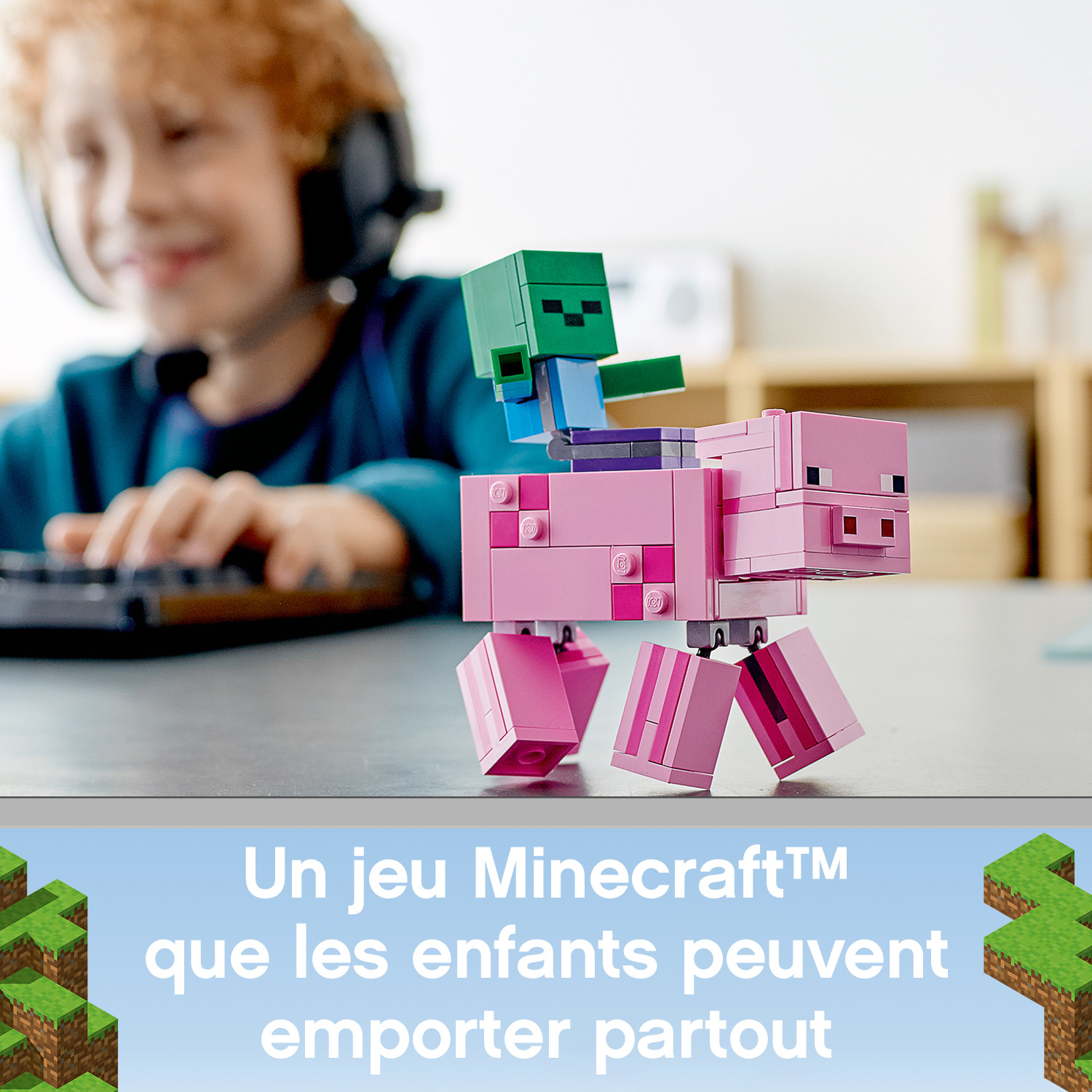 Les joueurs de Minecraft peuvent transposer le jeu en ligne dans la réalité avec une bigfigurine de cochon et un bébé zombie LEGO® Minecraft. Ce set inspire le jeu et constitue une formidable décoration Minecraft !L'expérience du jeu Minecraft en 3D !Les enfants âgés de 7 ans et plus vont adorer prolonger leurs aventures Minecraft dans le monde réel. Le cochon et le bébé zombie sont des jouets à construire, conçus pour permettre de manipuler les personnages Minecraft. La tête et les pattes du cochon rose sont mobiles, comme la tête, les jambes et les bras du bébé zombie. Le cochon est ravi de permettre au bébé zombie de monter sur son dos !Minecraft atteint des sommets avec les sets de bigfigurines LEGO® !Les sets de bigfigurines LEGO® Minecraft sont très tendance, ils constituent de superbes objets de collection et sont de formidables cadeaux. Les bigfigurines sont conçues pour plus damusement, et placent un univers de jeu entre les mains des joueurs Minecraft !