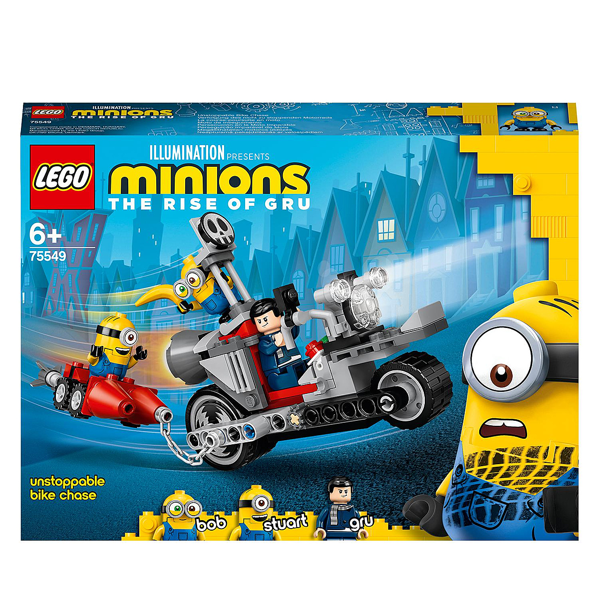 | La boîte contient | • Ce set amusant offre de nombreuses façons de jouer. Gru est en mission et les enfants peuvent l’aider en installant les Minions à l’avant de la moto, en les tirant sur le skate-fusée ou en leur donnant une délicieuse banane.• Set de construction riche en action sur le thème des Minions et de la moto (75549), avec les personnages de Gru, Stuart et Bob. Les enfants vont apprécier l’action à toute vitesse en créant leurs propres histoires de Minions.• Ce set comprenant une moto facilite le jeu de rôle. Avec 3 personnages, dont la figurine LEGO® exclusive de Gru, uniquement disponible dans ce set, les enfants vont adorer imaginer leurs propres histoires de Minions.• Ce set est le choix idéal pour ceux qui recherchent un cadeau ou une belle surprise pour les fans des Minions de 6 ans et plus. Parfait pour créer, ce jouet est formidable pour les enfants qui aiment construire et s’évader avec les Minions.• La moto mesure plus de 10 cm de haut, 13 cm de long et 5 cm de large - des dimensions idéales pour un jeu créatif.• Tous ceux qui veulent inspirer des histoires créatives seront ravis : Ce set sur le thème des Minions est alimenté par l’imagination des enfants - pas par des piles.• Avec le guide Instructions PLUS, disponible dans l’application gratuite LEGO® Life, les enfants de 6 ans et plus peuvent apprendre à construire de façon autonome et développent un sentiment de réussite en apprenant de nouvelles compétences.• Grâce à des personnages amusants et à des histoires imaginatives à raconter, chaque set de jeu LEGO® Minions encourage les enfants à découvrir le plaisir du jeu de rôle.• Les briques de construction LEGO® sont conformes aux normes industrielles les plus élevées et aux critères de qualité du groupe LEGO. Elles sont donc compatibles entre elles et s’assemblent et se séparent toujours facilement.• Les pièces et les briques LEGO® Minions sont soigneusement testées afin de garantir que chaque set de jeu est conforme aux normes de sécurité les plus élevées au monde. |