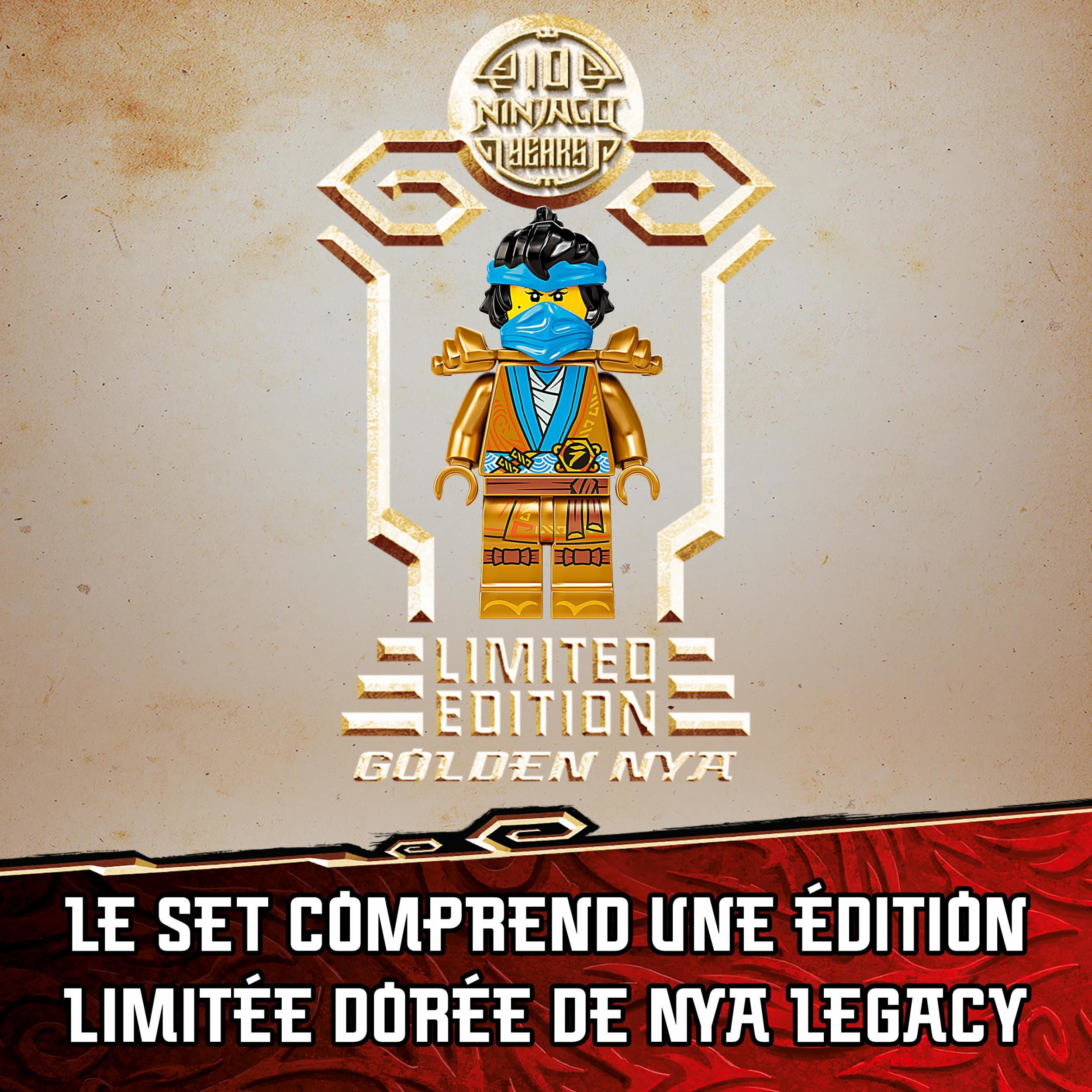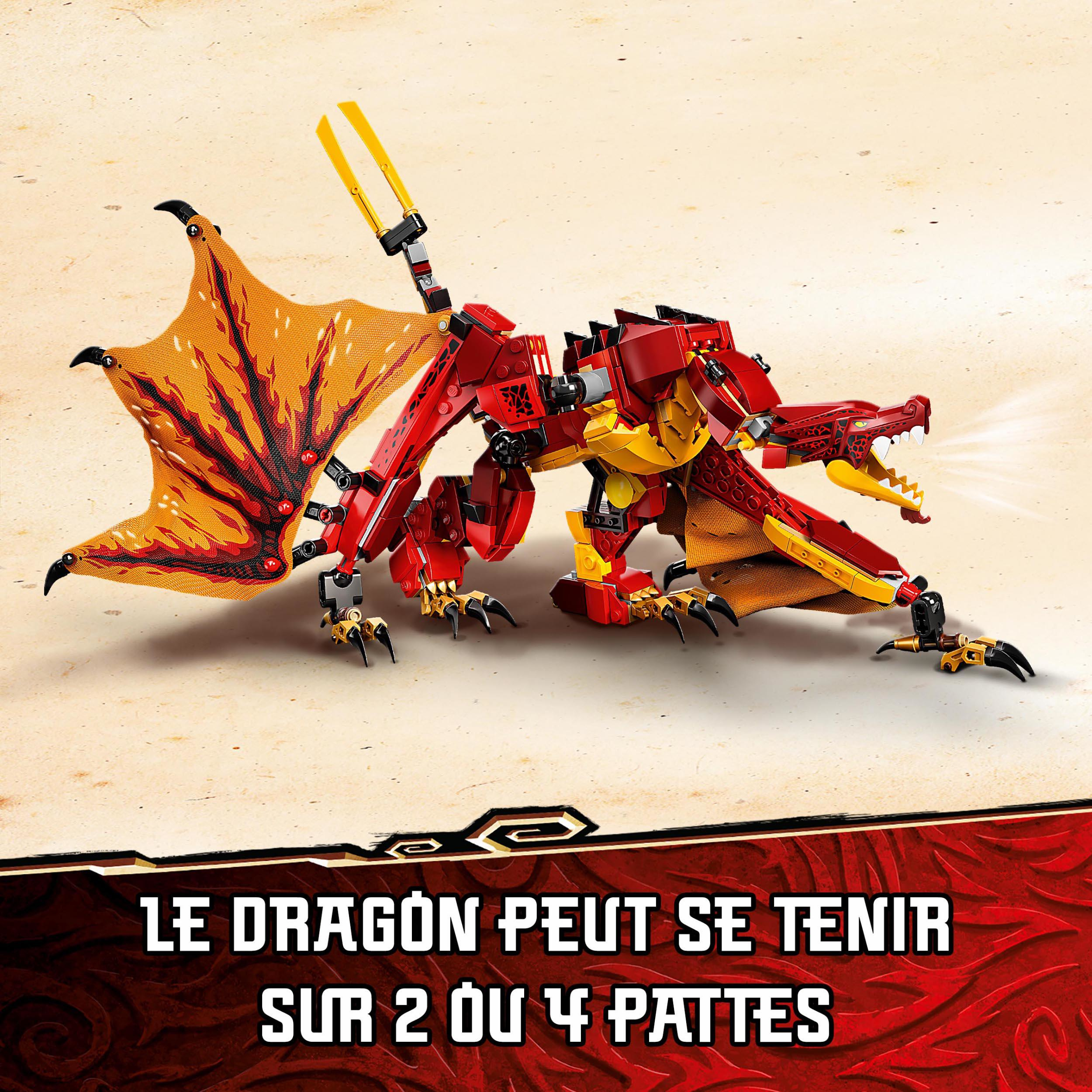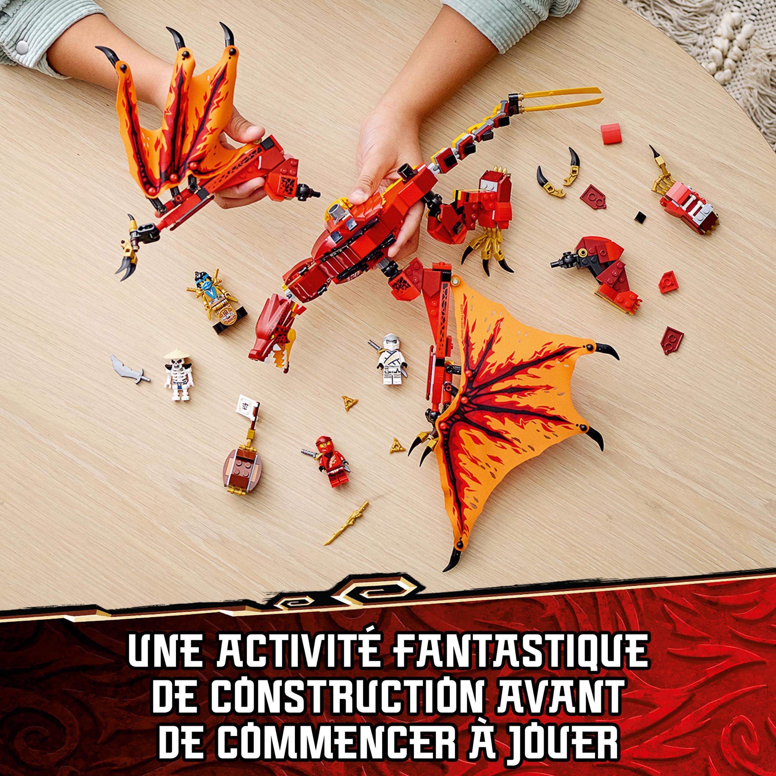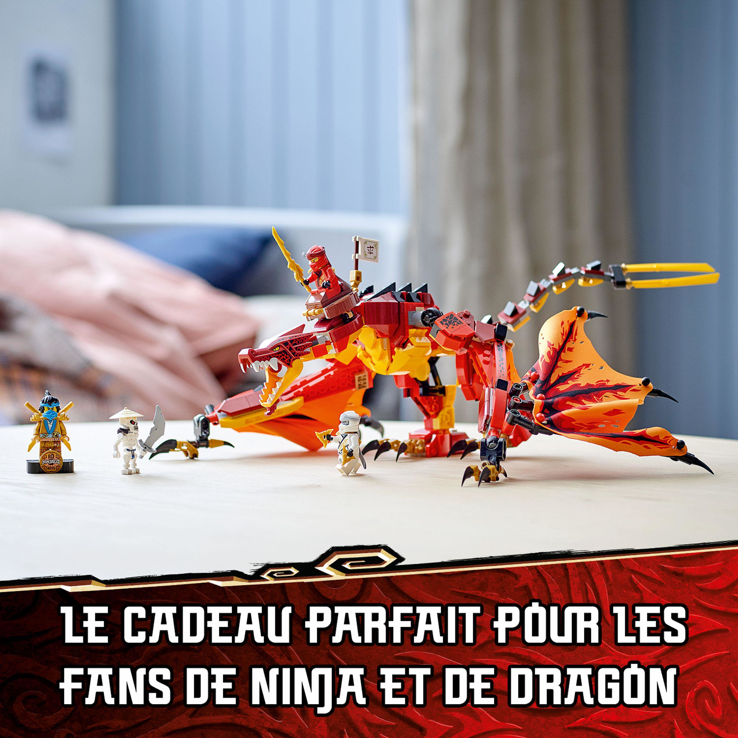 Les fans des ninjas vont adorer recréer les aventures de la saison 1 de la série TV LEGO® NINJAGO®, avec la nouvelle version du set Lattaque du dragon de feu (71753). Avec sa queue, ses pattes, sa mâchoire et ses ailes articulées, ce dragon impressionnant est idéal pour le jeu de rôle et laction.Le plein de frissons pour les fans des ninjasLe set contient 4 incroyables figurines : les ninjas Kai, Zane et Nya Legacy, ainsi que leur redoutable ennemi Wyplash, pour mettre en scène des combats épiques entre le bien et le mal. La figurine de Nya Legacy dorée (nouveauté de juin 2021) à collectionner a été spécialement créée pour célébrer le 10ème anniversaire des sets NINJAGO.Jouets uniques pour constructeurs inventifsLes jouets LEGO NINJAGO permettent aux enfants de sévader vers un monde fantastique et débordant daction. Ils peuvent sallier à leurs héros pour affronter de redoutables méchants, grâce à une formidable collection de robots, motos, dragons et plus encore.