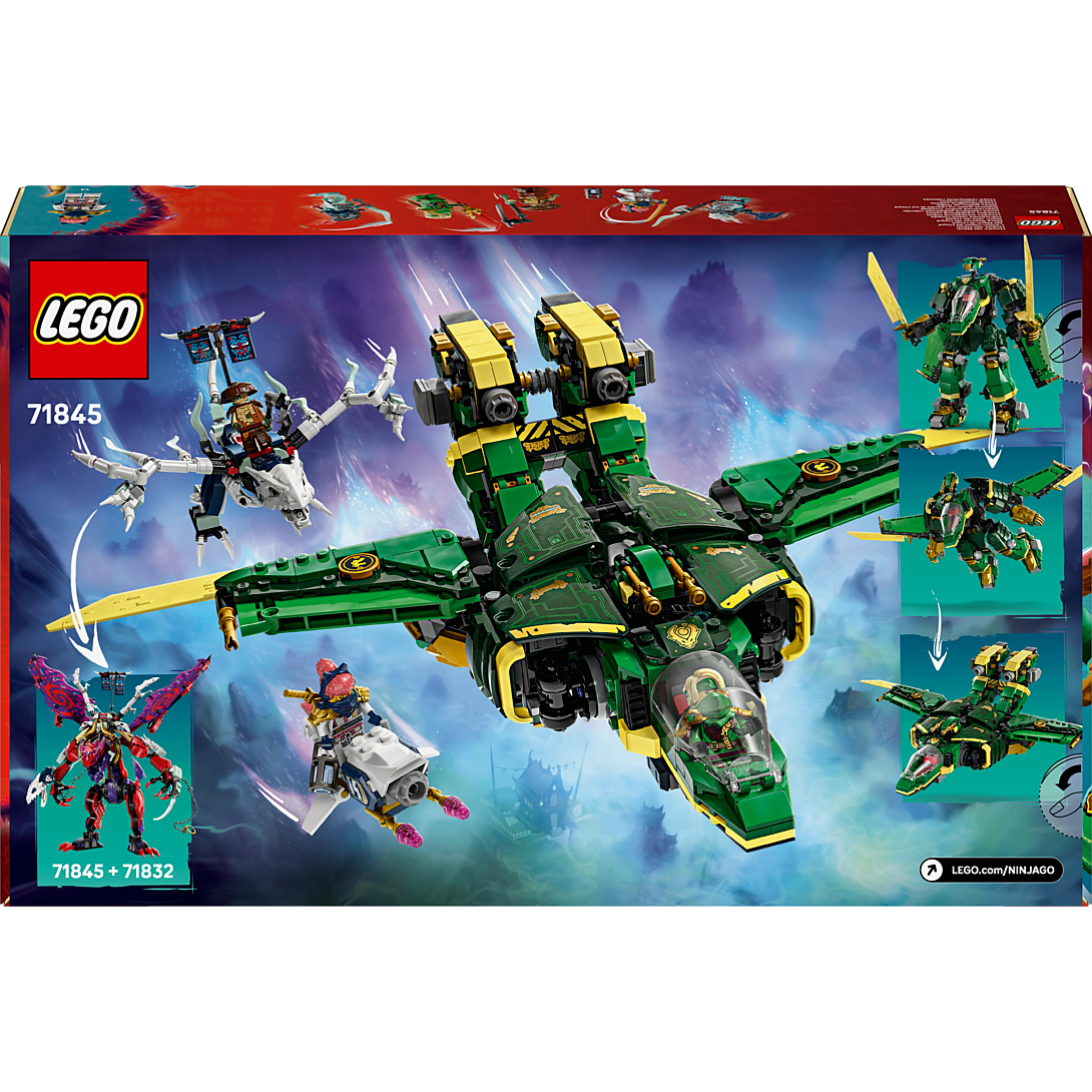 Le set de construction L’avion-robot de Lloyd (71845) permet aux garçons et aux filles dès 9 ans d’imaginer une infinité d’aventures et de batailles ninjas dans les airs et au sol, inspirées de la saison 3 de NINJAGO® Le soulèvement des dragons. Cet impressionnant set de combat invitant à l’action inclut un robot doté de bras et de jambes articulés, d’un cockpit et de 2 grands sabres. Les enfants peuvent le transformer en un fabuleux jet avec cockpit, ailes et propulseurs. Ce set de combat et d’aventure inclut 5 minifigurines : Sora et Lloyd, équipés d’armes ninjas, affrontent un trio de méchants formé de Kur, Try et un Guerrier draconique spectral, avec une bannière cachant un message secret que seule la lame de révélation translucide de Lloyd peut dévoiler. Sora conduit une moto volante et les méchants possèdent un dragon spectral articulé, qui peut être combiné avec les pièces du set Croc-de-tonnerre : le dragon du chaos (71832, vendu séparément). Contient 1 112 pièces.