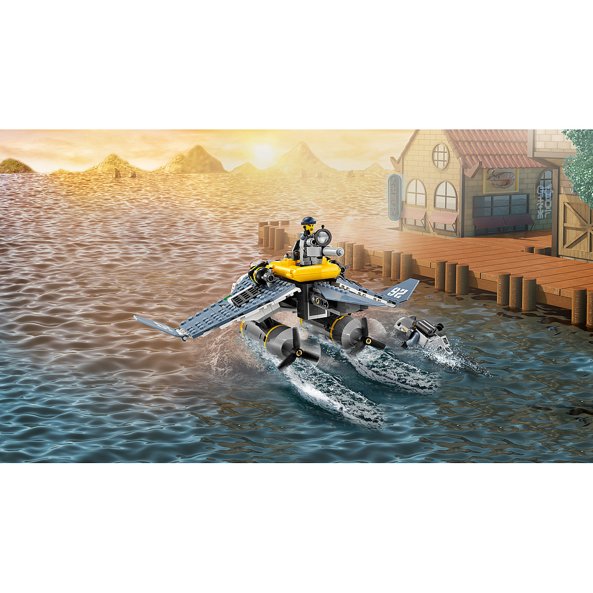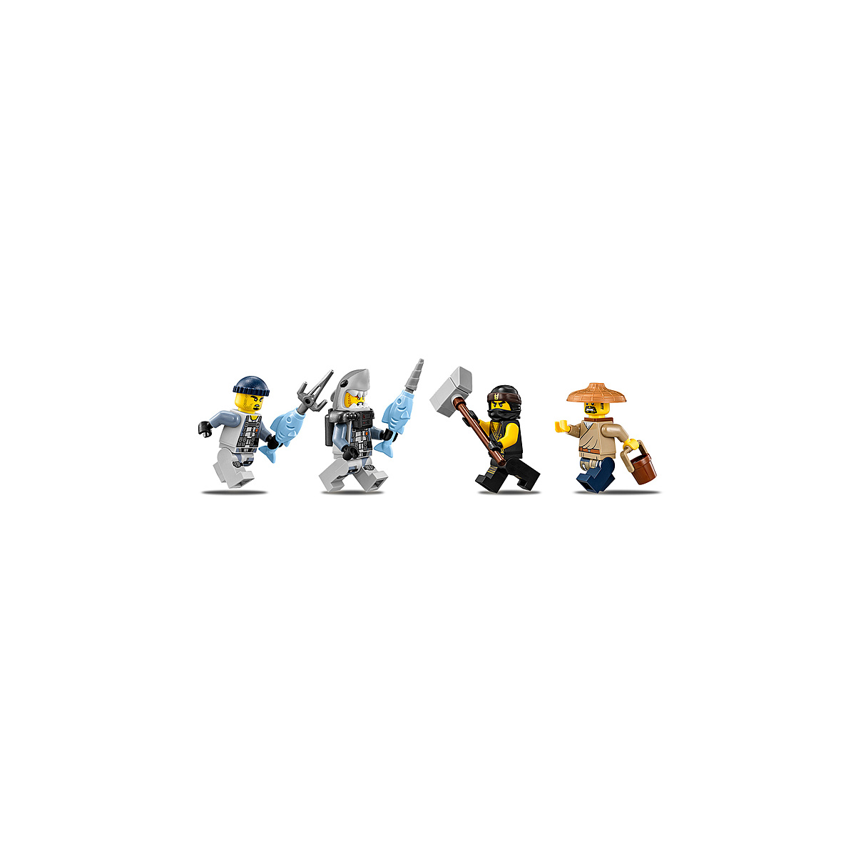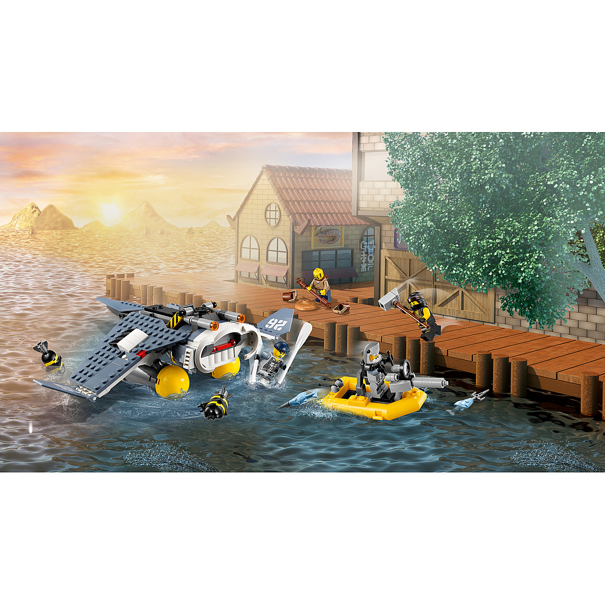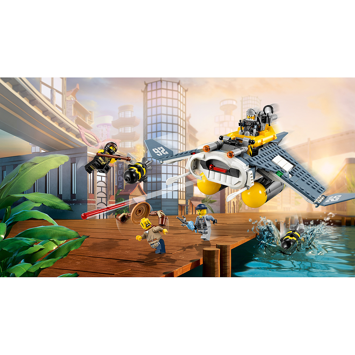 Danger ! Les soldats de l'armée des requins, à bord de leur bombardier Raie Manta, larguent des bombes sur la Ville NINJAGO®. Plonge dans laction avec Cole pour sauver Shen-Li, évite les fusils à ressorts du bombardier Raie Manta et riposte avec le marteau. Mais ce n'est pas fini... le bombardier cache aussi un bâteau qui peut être détaché pour lancer les troupes de l'armée des requins !