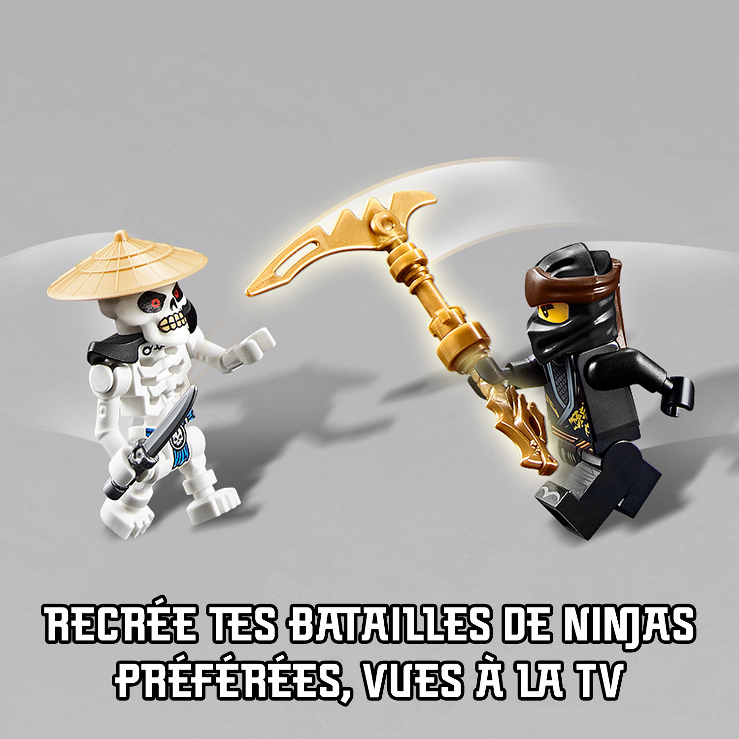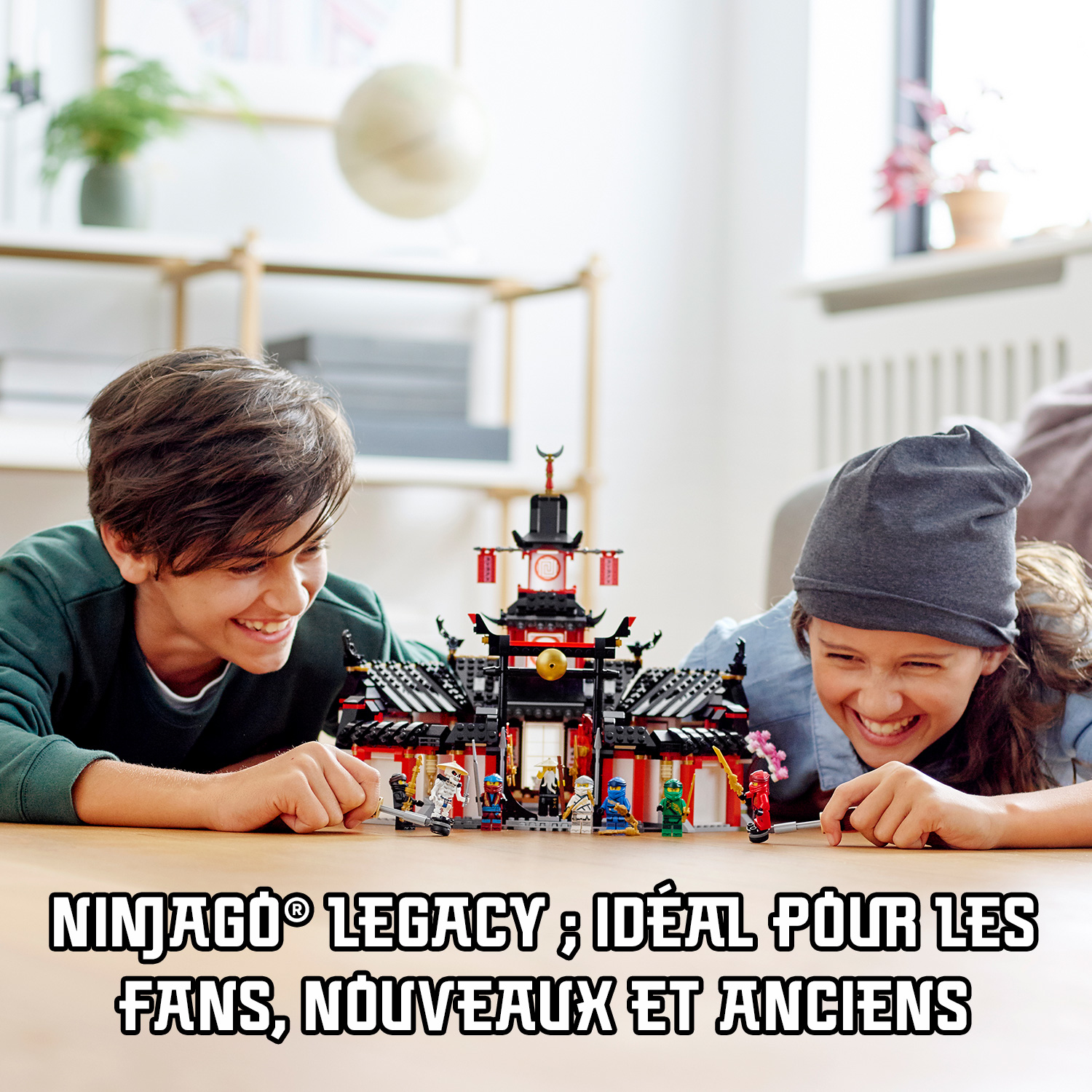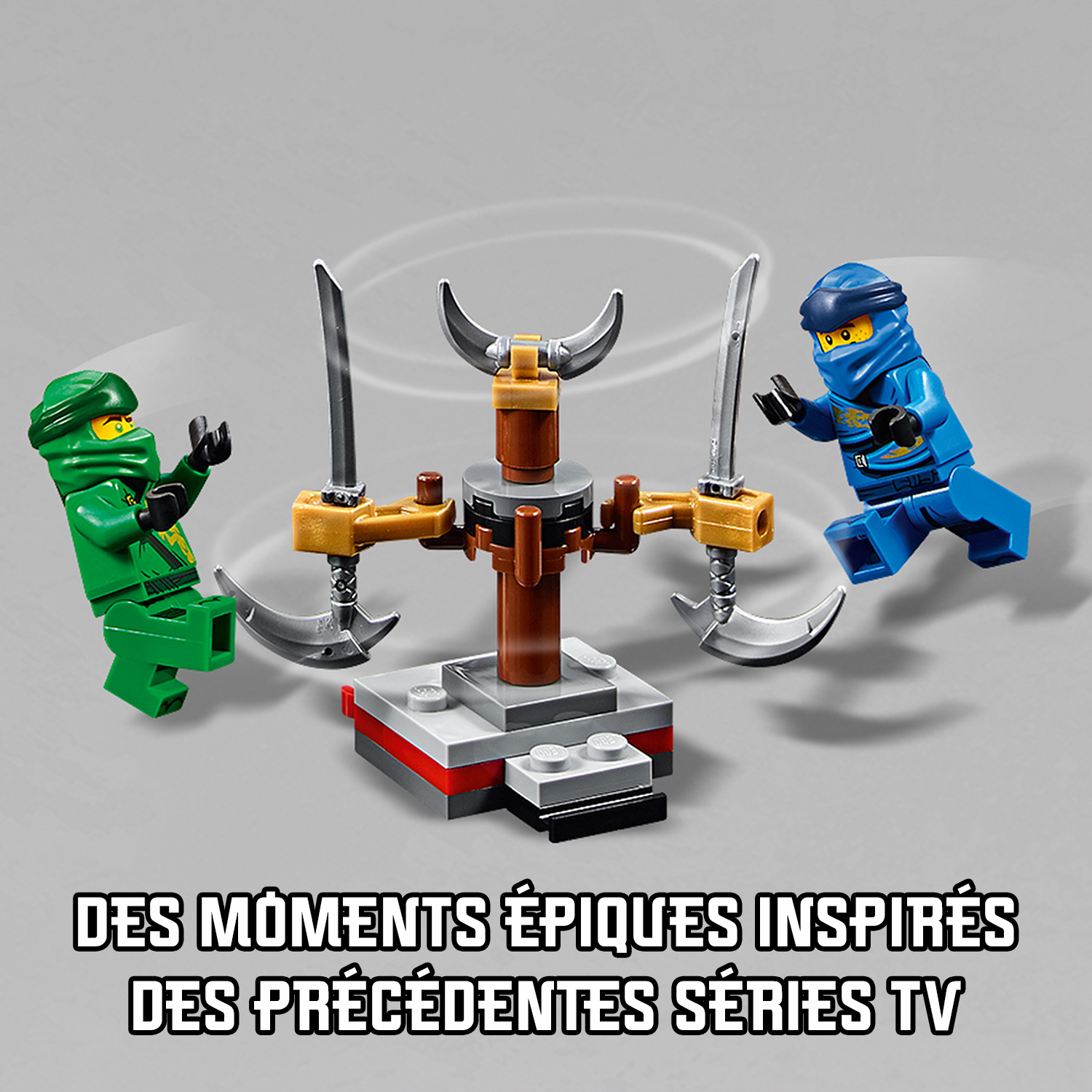 Les enfants peuvent se préparer pour les batailles de ninja au monastère de Spinjitzu LEGO® NINJAGO® 70670 et empêcher Wyplash de voler une arme dor. Le modèle du monastère souvre facilement et comprend une porte qui souvre, un salon de thé avec une fonction de piège avec un couteau, un poste d'entraînement rotatif de ninja, une fonction de piège de poulet et des autocollants muraux avec l'histoire NINJAGO. Les enfants peuvent pratiquer le Spinjitzu dans la cour avec 2 plateformes de combat de ninja portables, un poste dentraînement pour faire tourner les épées et un poste de formation à la découpe de fruits. Cet ensemble de jouet ninja plein daction inclut les 4 armes dor à collectionner : le Sabre de feu, les Ninchakus de foudre, la Faux de terre et les Shurikens de glace, plus 8 figurines pour recréer les actions classiques de la série télévisée NINJAGO, Les maîtres du Spinjitzu.