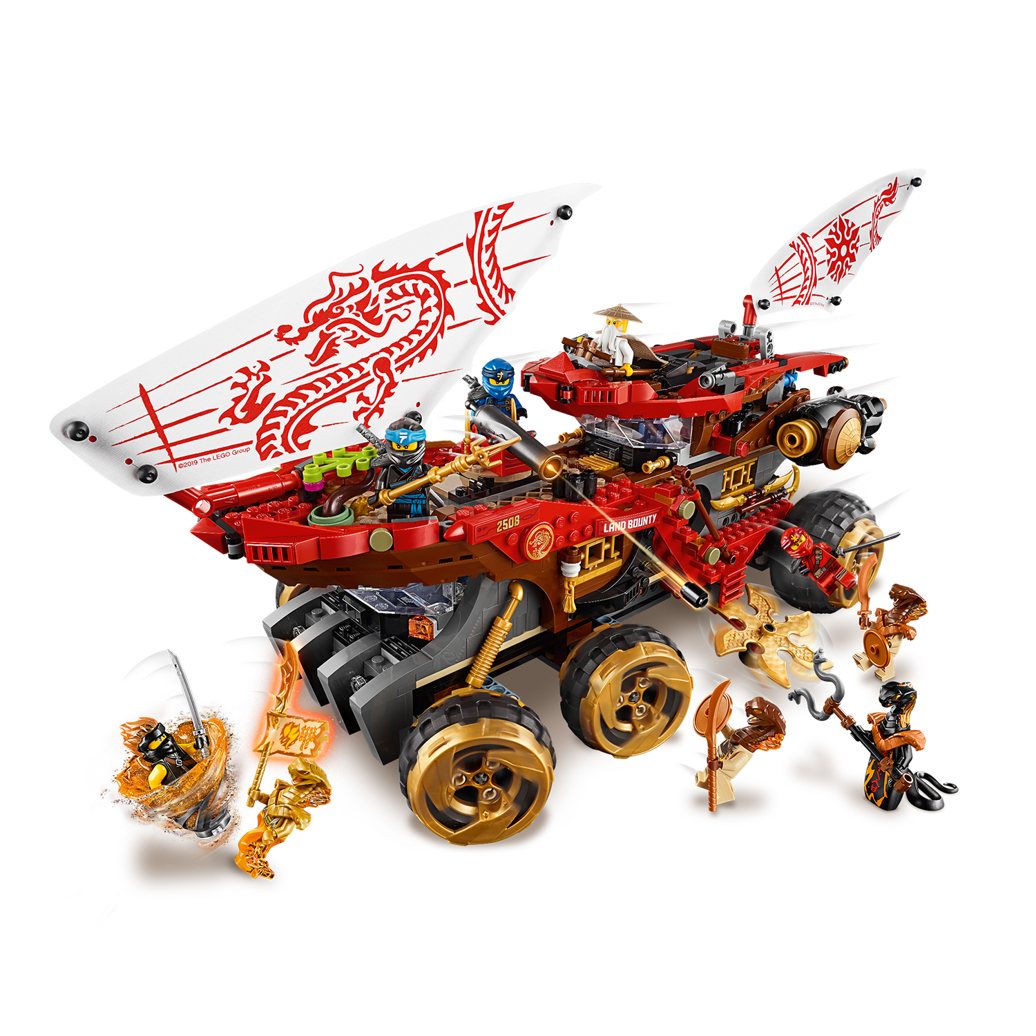 | La boîte contient | • Le set de jeu inclut 9 figurines LEGO® NINJAGO® - nouveautés de juin 2019 : les figurines Wu, Kai, Nya, Jay et Cole FS, Aspheera, Char, le pyro-destructeur et le pyro-chasseur. • Le camion QG des ninjas possède des roues avec des jantes dorées, 2 trancheuses shuriken dorées, un planeur détachable, un canon rotatif, un fusil à ressort rétractable, 2 voiles en tissu décorées, un intérieur avec de multiples détails dont un double poste de pilotage pour figurine, 2 porte-armes, un jeu d'arcade à construire, une théière et un compartiment arrière qui s’ouvre avec un petit quad à l'intérieur. • Le planeur détachable dispose d’un double cockpit, de 2 fusils à tenons et de boosters dépliables. • Le quad dispose d'un siège de figurine. • Il est possible de faire tourner les roues et diriger le Q.G des ninjas. • Les armes sont contituées des katanas argentés et dorés de Kai, du katana argenté et des nunchakus dorés de Jay, du katana argenté et d'une lance dorée de Nya, du sceptre de Wu, du sceptre serpent de Char, du sabre du pyro-destructeur et de l’épée du pyro-chasseur. • Les accessoires sont les suivants : les supports pour le katana de Kai, Jay et Nya, d'une toupie tornade et la cape de Wu - nouveautés de juin 2019 - le Parchemin du Spinjitzu Interdit d'Aspheera, l'armure serpent et le bouclier d'Aspheera et du pyro-destructeur et le bouclier du pyro-chasseur. • Ce véhicule ninja permet aux enfants de rejouer leurs scènes préférées de la série télévisée NINJAGO®. • Le véhicule du Q.G. ninja mesure plus de 22 cm de haut, 50 cm de long et 18 cm de large. • Le planeur détachable mesure plus de 13 cm de haut. 31 cm de long et 30 cm de large. |