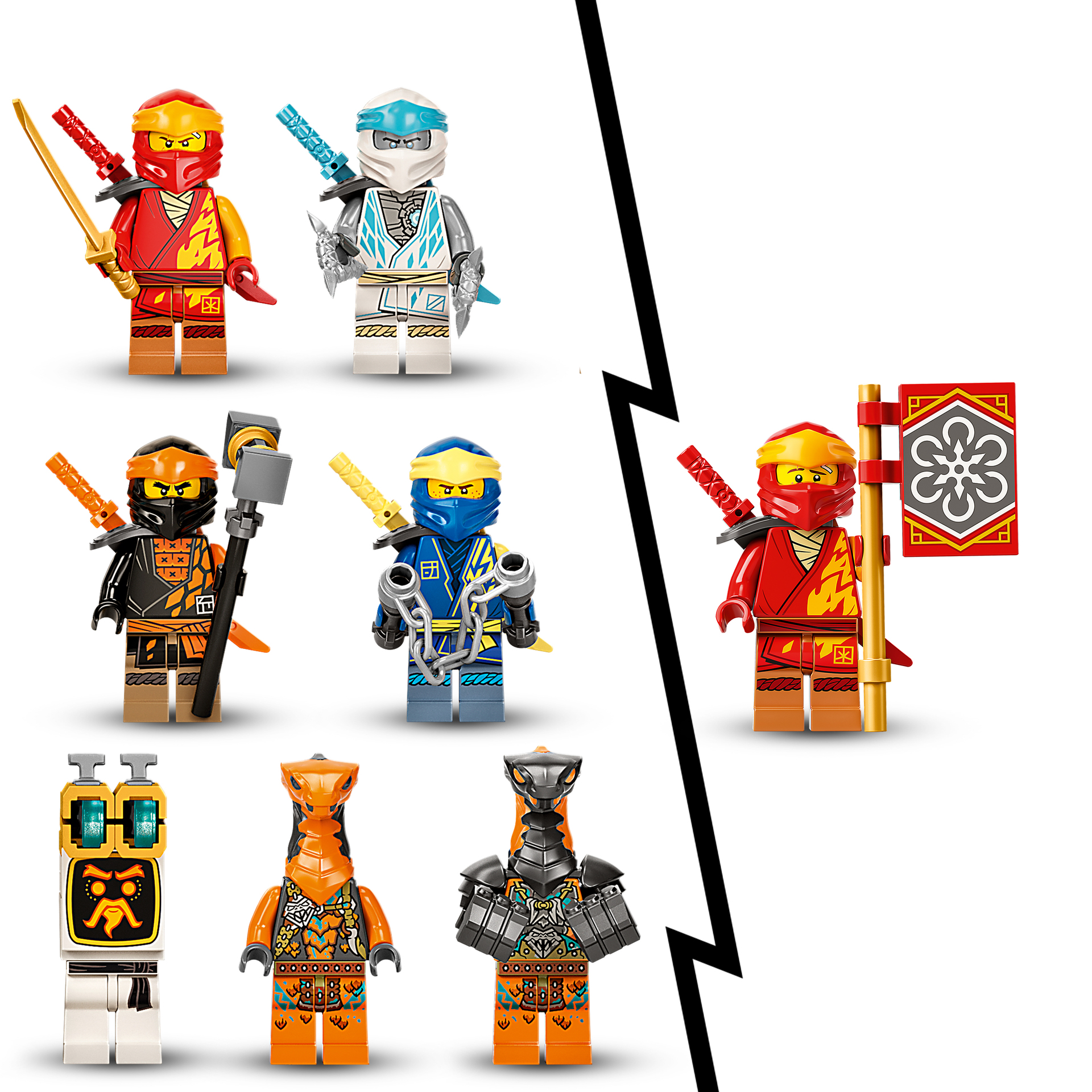 Ce jouet fascinant comprend 7 minifigurines - Kai, Jay, Zane, Cole, Wu Bot, ainsi que les deux effroyables serpents Cobra mécanique et Boa Destructeur, pour créer dincroyables combats. Nouveauté de janvier 2022 : une fois leurs ennemis vaincus et leur mission accomplie, les enfants remportent une bannière à collectionner.
