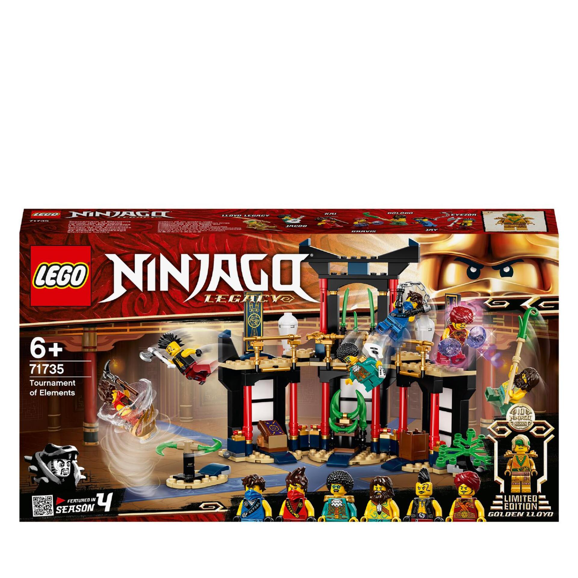 Les enfants peuvent mettre en scène les spectaculaires batailles de la saison 4 de la série TV LEGO® NINJAGO® avec ce set de jeu Le tournoi des éléments (71735). Le temple richement détaillé comprend une plateforme de combat, une plateforme avec une arme tournante, une arme toupie et une collection de lames de jade.Le set ninja idéal pour stimuler limaginationIncluant 7 figurines (les ninjas Kai, Jay et Lloyd Legacy, les maîtres des éléments Bolobo, Jacob et Gravis et le méchant Eyezor) ce set de jeu donne aux enfants des possibilités illimités de mettre en scène des batailles et des exercices dentraînement. Nouveauté de janvier 2021 : Lloyd Legacy, un personnage doré spécial monté sur un support, célèbre les 10 ans des sets de construction NINJAGO. Les meilleures idées de cadeaux pour enfants créatifsLes jouets de combat LEGO NINJAGO permettent aux enfants de séchapper dans un monde daction et de fantaisie. Ils y apprennent les compétences essentielles et font équipe avec leurs héros pour combattre les méchants, en jouant avec une incroyable collection de jouets ninjas dont des dragons, des robots et des temples.