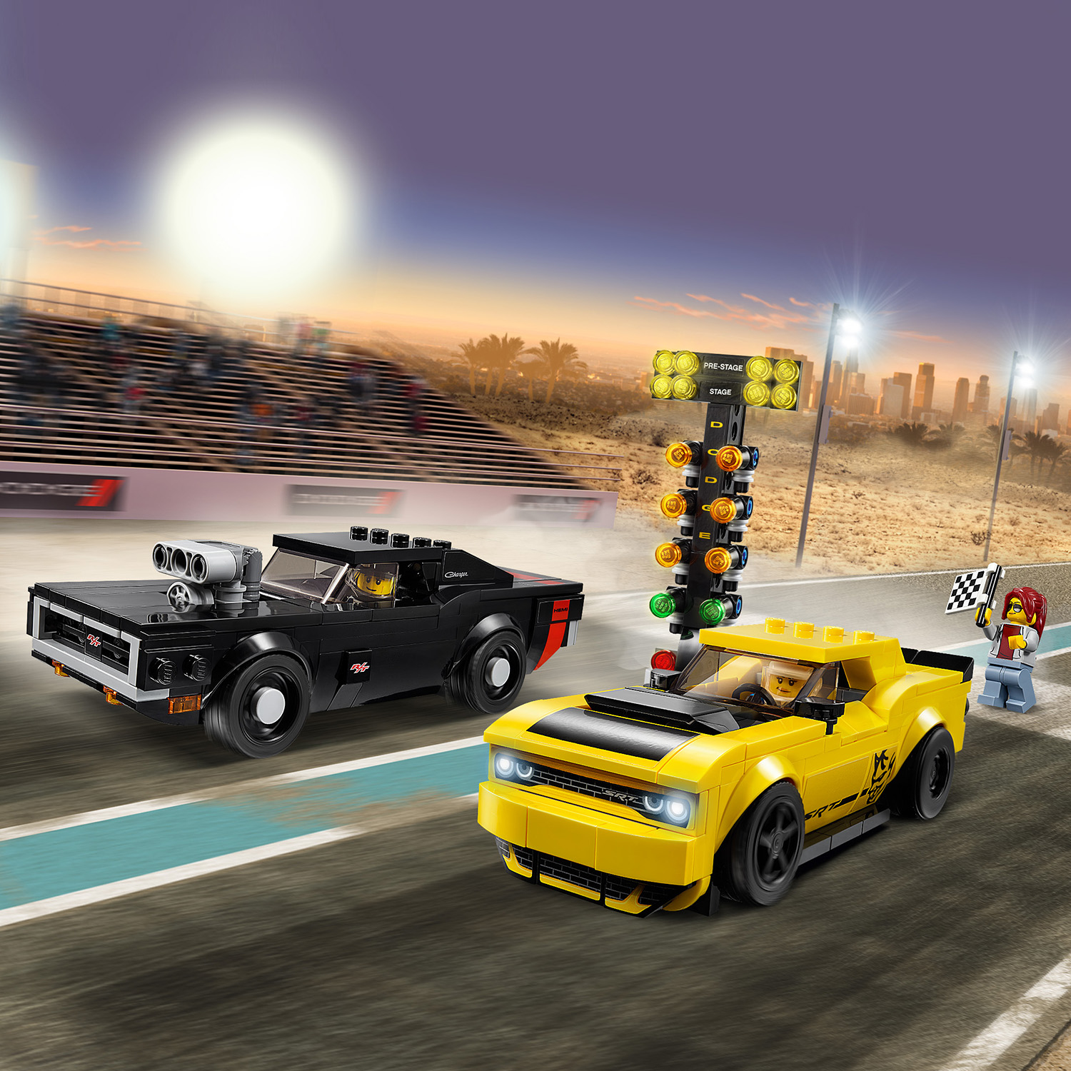 Une course de voitures palpitante est recréée avec cet ensemble Dodge Challenger SRT Demon de 2018 et Dodge Charger R/T de 1970 de LEGO® Speed Champions 75893 ! La Dodge Challenger comprend 2 ensembles de jantes, des détails de design réalistes et des autocollants décoratifs tandis que la version LEGO de la Dodge Charger, une voiture américaine emblématique, a un compresseur amovible et un capot alternatif. La course peut démarrer avec le signal lumineux, comprend également un contrôleur de course avec un drapeau à damiers et 2 figurines de pilote.