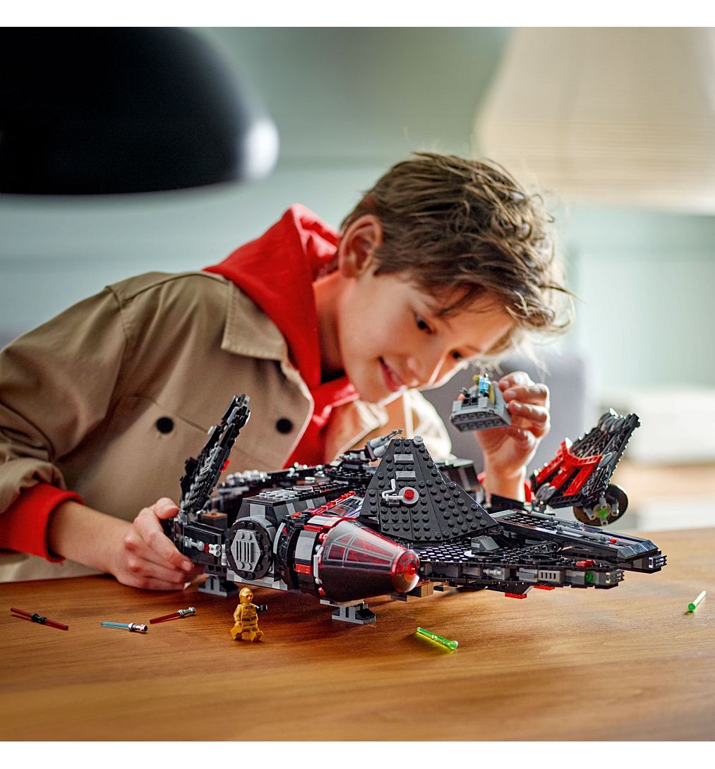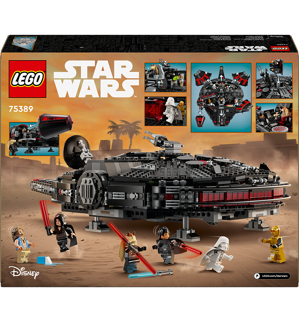 Transformez l’univers LEGO Star Wars avec Le Faucon Noir à construire (75389), qui inclut une version sombre du Faucon Millennium, inspirée de la série Disney+ LEGO Star Wars : Reconstruire la Galaxie. Ce jouet Star Wars est une belle idée cadeau à offrir à un enfant dès 10 ans pour son anniversaire. Ce vaisseau spatial en briques LEGO Star Wars dispose de panneaux qui se relèvent pour accéder à l’intérieur détaillé, où se trouvent le trône de Dark Jar Jar Binks, le centre de commandes, l’hyperdrive, la salle de divertissement et la cellule de prison. Des fusils à ressort, des canons rotatifs et un poste de tireur amovible multiplient les possibilités de jeu. Le vaisseau contient également 6 minifigurines LEGO Star Wars inédites, dont Dark Jar Jar Binks, Luke en mode plage et Jedi Vador. Ce modèle de vaisseau Star Wars peut être associé aux sets 75388 Le chasseur stellaire de Jedi Bob et 75393 TIE Fighter et X-Wing à combiner (vendus séparément), qui incluent des véhicules et des personnages de la série LEGO Star Wars : Reconstruire la Galaxie.