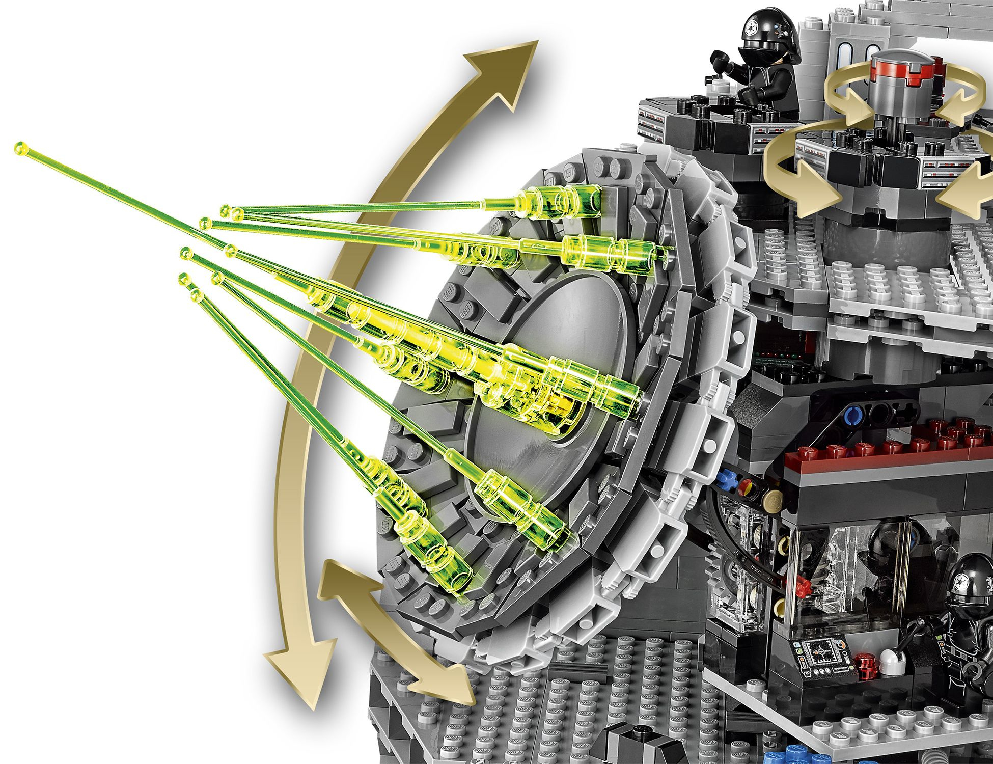 Rejouez des scènes spectaculaires de la saga Star Wars avec l'arme suprême de l'Empire pour supprimer les planètes : l'Étoile de la Mort ! Avec plus de 4000 pièces, ce modèle génial a une galaxie d'environnements élaborés et authentiques, notamment une salle de contrôle superlaser, une salle de conférence impériale, un hangar avec une rampe de lancement, et le TIE Advanced de Lord Vador avec de la place pour Dark Vador à l'intérieur, la salle du trône de l'Empereur Palpatine, la salle de maintenance des droïdes, le bloc de détention, le compacteur d'ordures, le rayon tracteur, la zone cargo, le turbolaser avec des fusils à ressorts et des sièges pour les 2 artilleurs de l'Étoile de la Mort et 2 tours turbolaser mobiles. Cet ensemble spectaculaire inclut aussi 23 figurines célèbres et 2 droïdes pour assurer des heures de combat Star Wars.