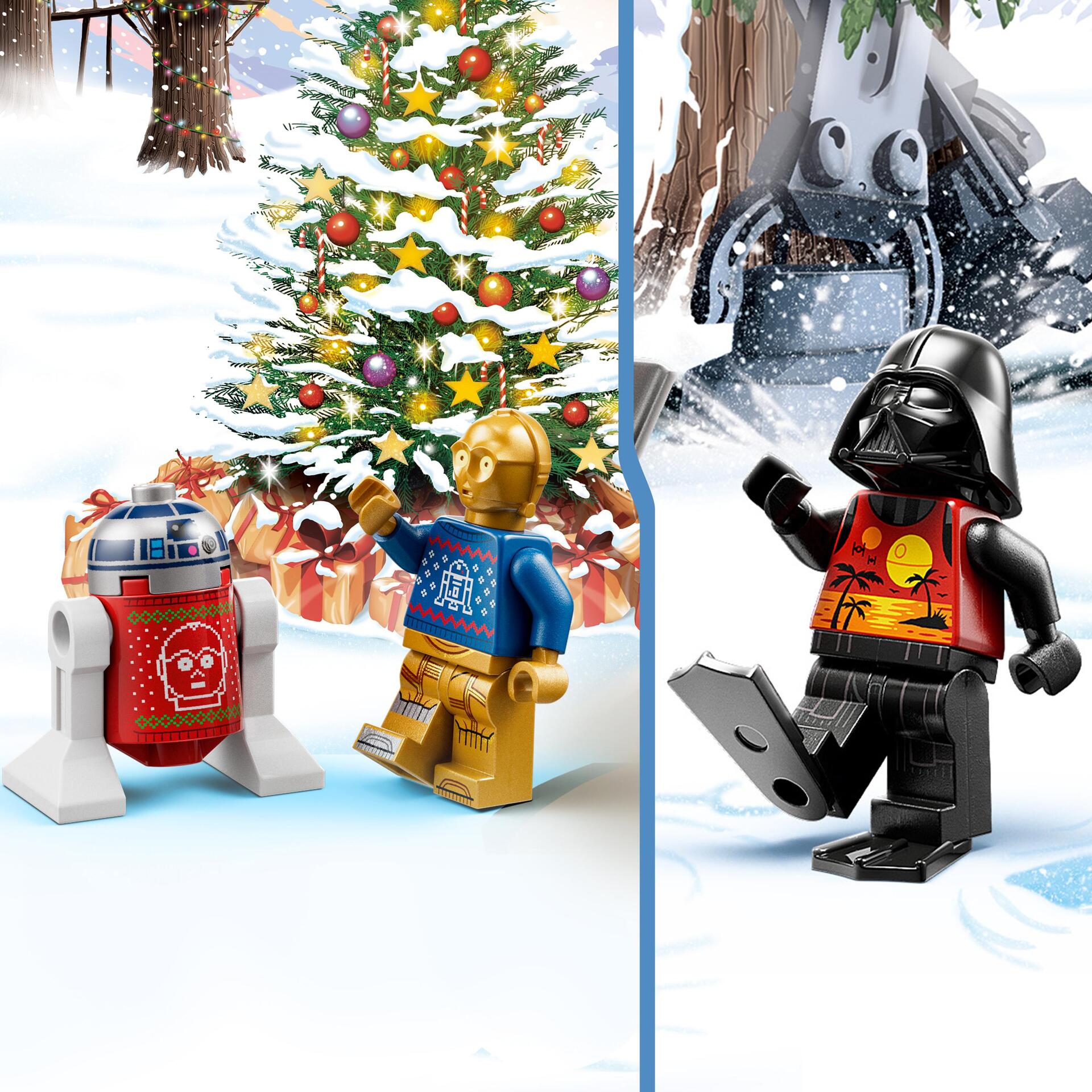 Jusquà Noël, les fans vont découvrir un jouet en briques derrière chaque fenêtre du calendrier de l'Avent 2022 LEGO® Star Wars (75340). Il inclut 8 personnages LEGO Star Wars, dont C-3PO et R2-D2 vêtus de pulls de fêtes décorés de leurs portraits respectifs, un droïde Gonk habillé en Père Noël, et Dark Vador en tenue dété inspiré de LEGO Star Wars Summer Vacation sur Disney+.