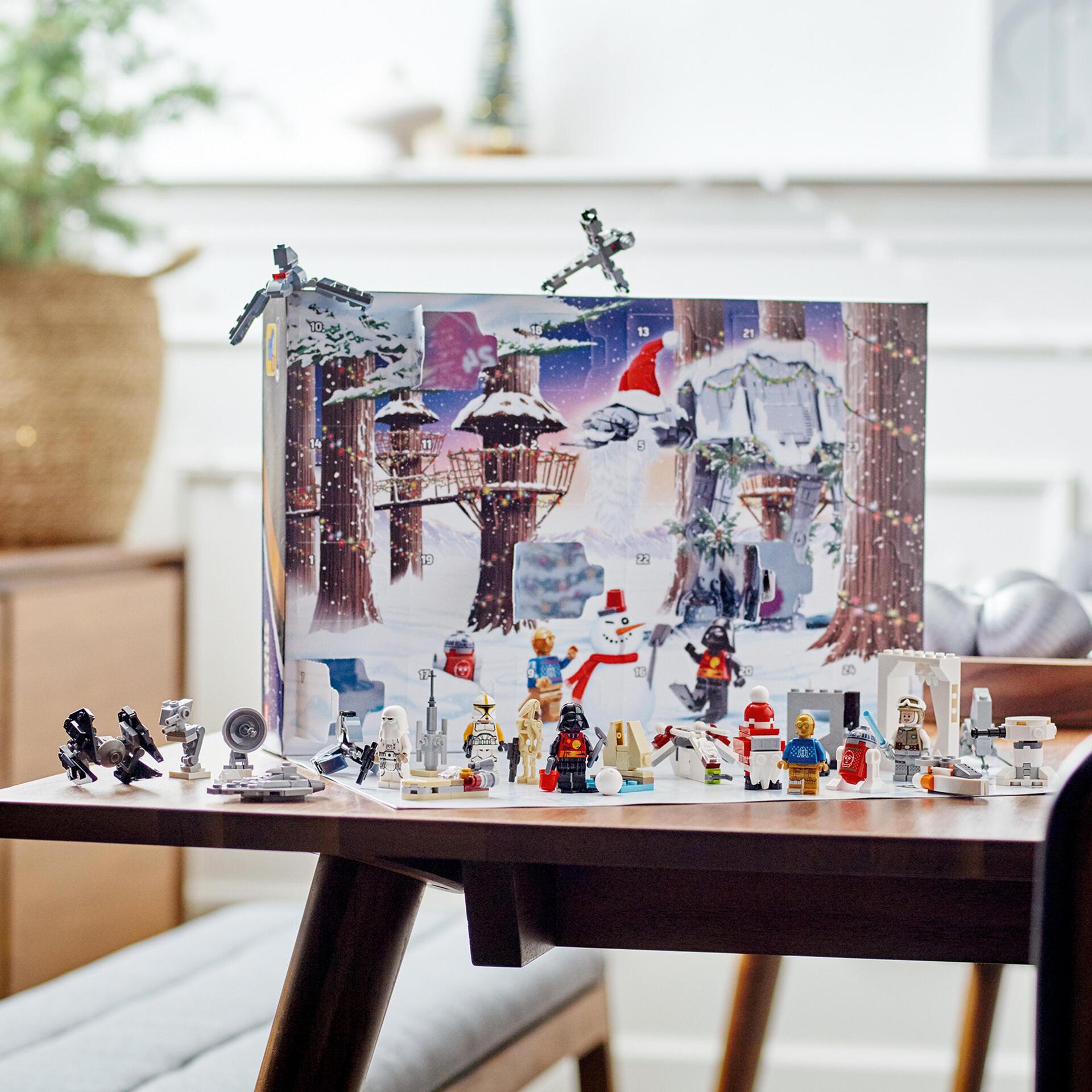 Le calendrier contient 16 mini-constructions dont un transport d'assaut de classe Acclamator, la navette du Bad Batch et un Landspeeder V-35. Les enfants de 6 ans et plus trouveront des modèles et accessoires pour rejouer la bataille de Hoth, une grotte de Wampa dans laquelle la minifigurine LEGO de Luke Skywalker peut être suspendue, et un décor de plage pour les vacances de Dark Vador.