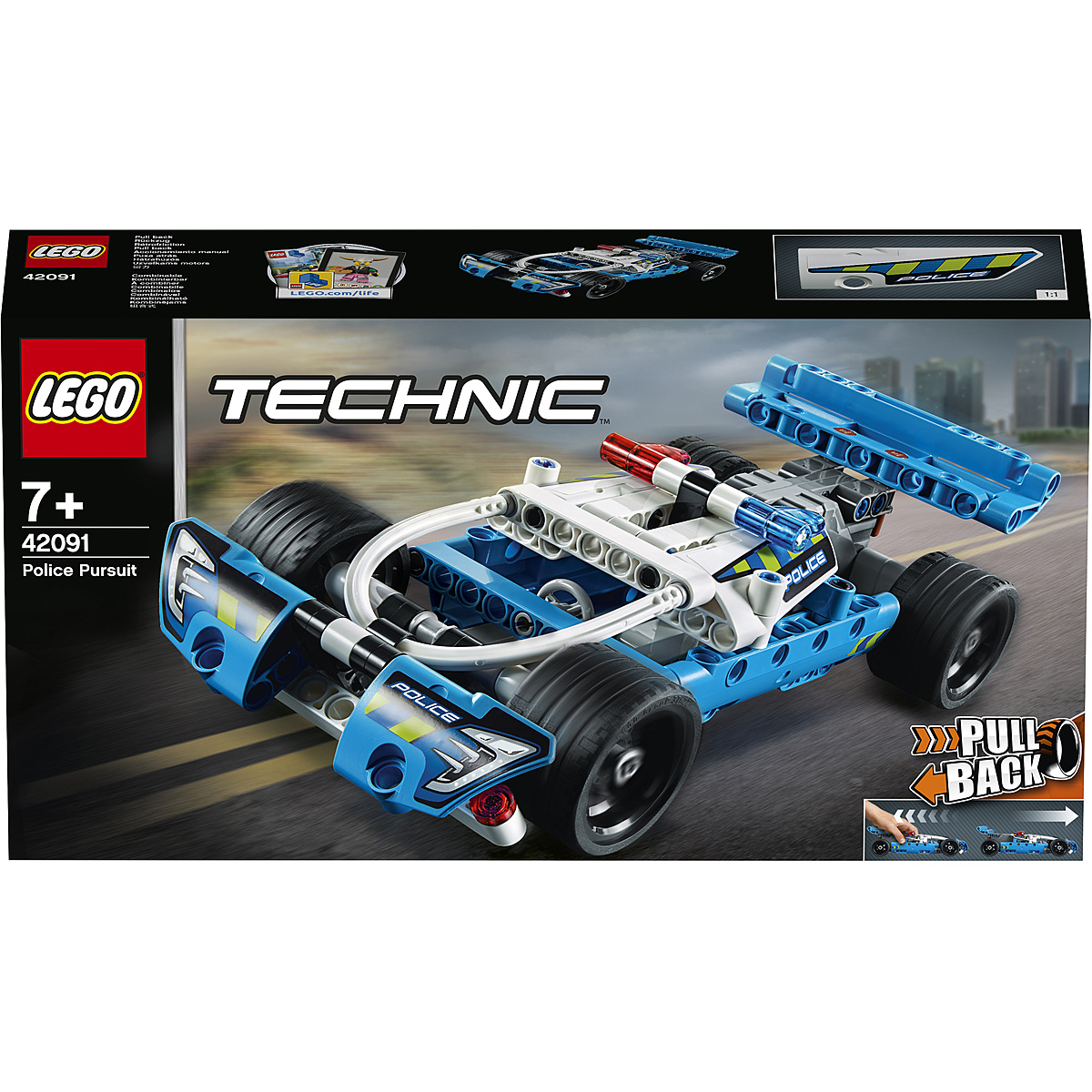 Utilisez le moteur à rétrofriction et commencez une poursuite à grande vitesse avec la voiture de police robuste LEGO® Technic 42091 ! Cette voiture de police est agrementé de bleu, de blanc et de noir avec des autocollants de police, des avertisseurs lumineux rouges et bleus, un pare-chocs avant aérodynamique, un grand aileron arrière et de larges jantes noires avec des pneus à profil bas. Combinez-la avec le pick-up d'évasion à rétrofriction 42090 pour des poursuites en voiture pleines d'action, ou pour créer le modèle combiné, le 4x4 Ultime.
