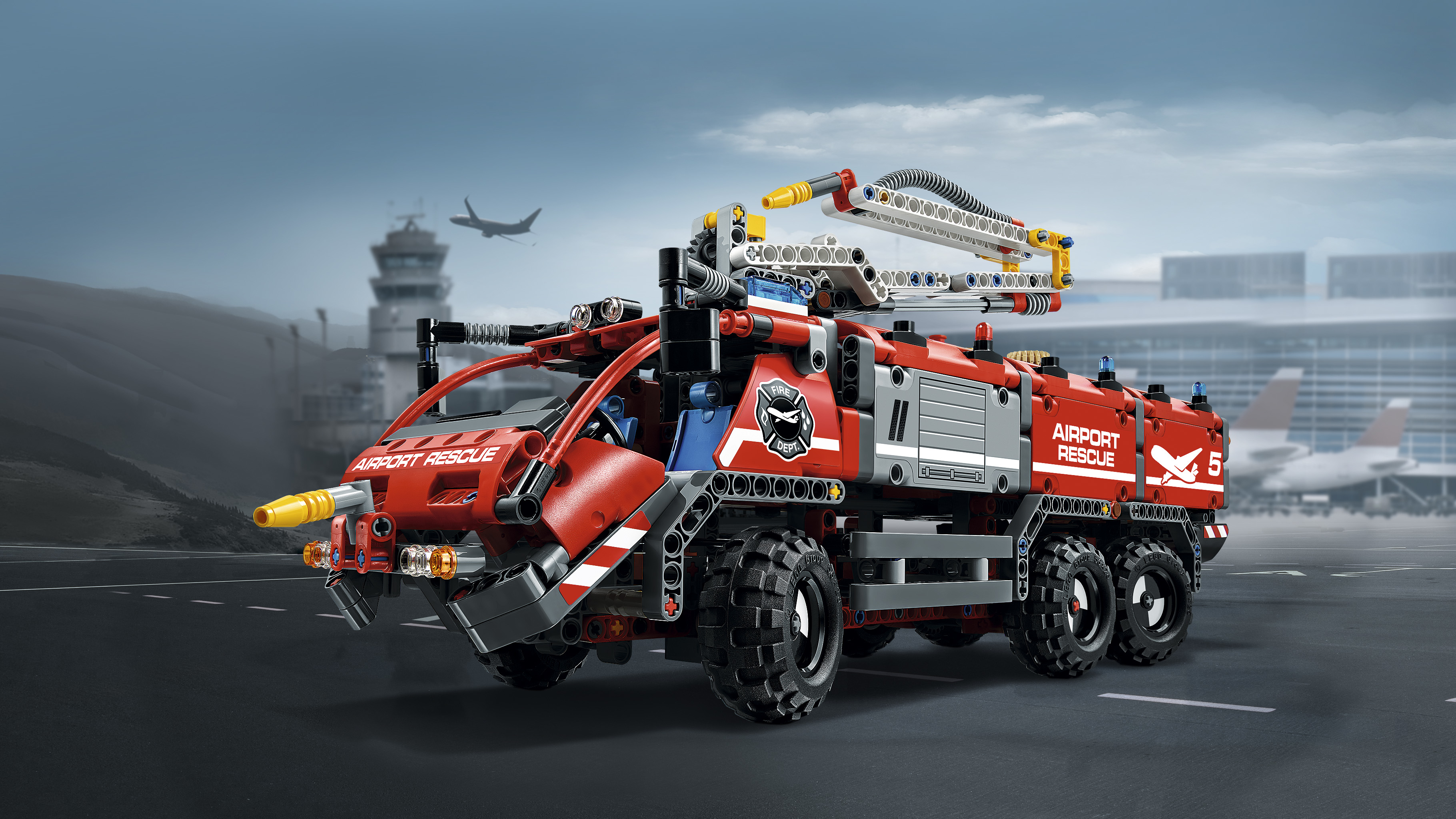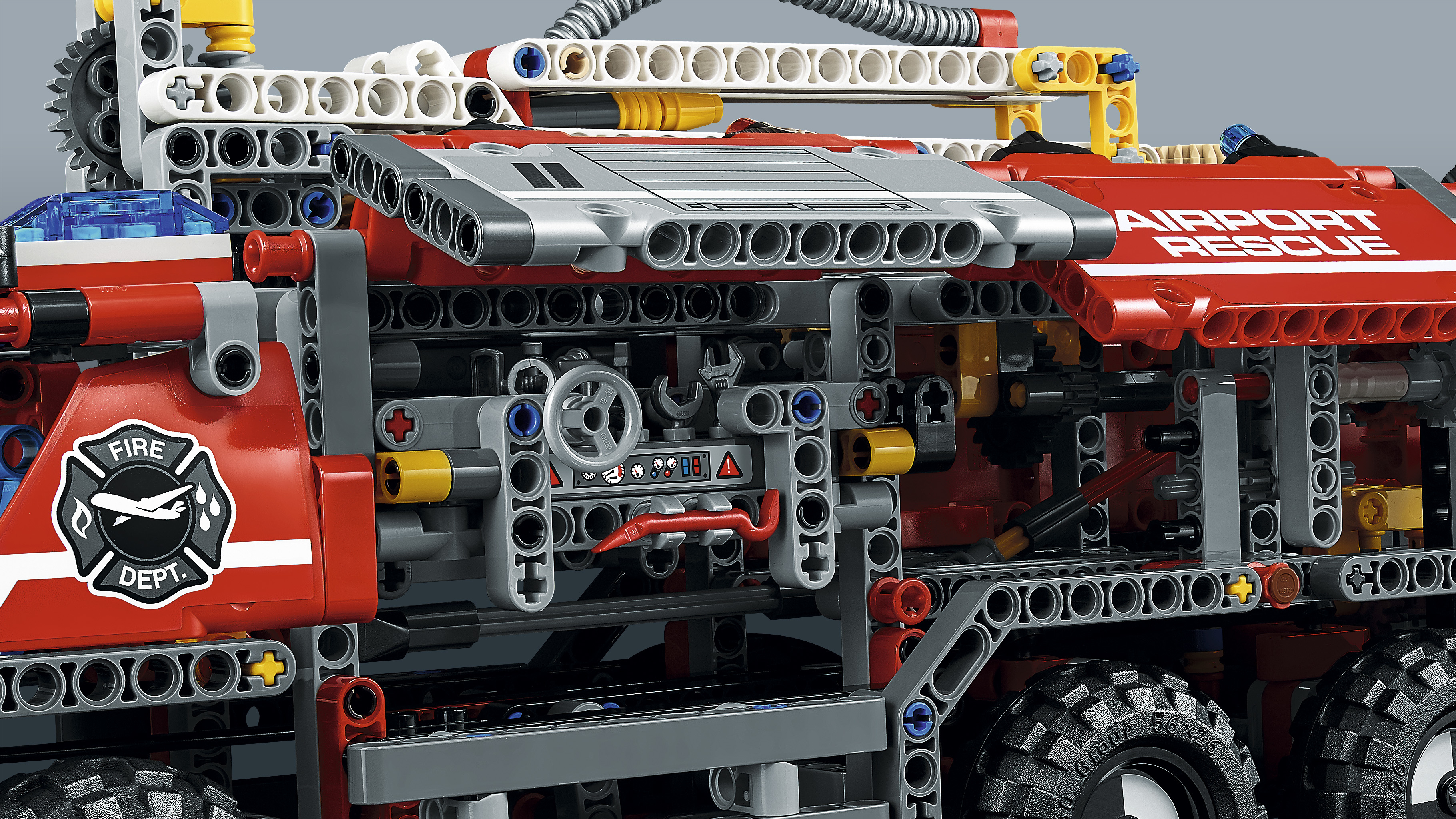 Fonce porter secours avec cette spectaculaire réplique high-tech 2-en-1 dun véritable véhicule de secours daéroport. Ce modèle détaillé comprend des coloris rouge, noir et gris, une grande cabine de chauffeur avec un tableau de bord détaillé, des rétroviseurs, un compartiment de rangement d'outils qui souvre, un moteur quatre cylindres avec des pistons mobiles, deux essieux directeurs, un essieu arrière double et de gros pneus. Active le bras pour positionner le canon à eau et éteindre les flammes ! Ce modèle, où il est possible d'installer un moteur Power Functions, peut être transformé pour créer un autre véhicule de pompiers !