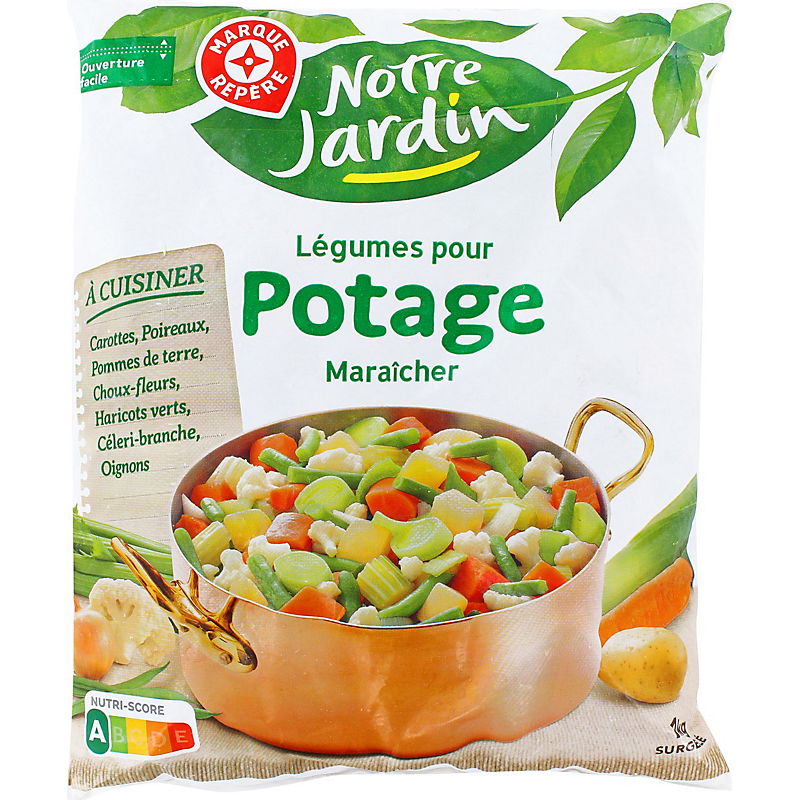 Ingrédients : Carottes 30 %, poireaux 20 %, pommes de terre 15 %, choux-fleurs 12 %, haricots verts 11 %, céleri branche 7 %, oignon 5 %.
