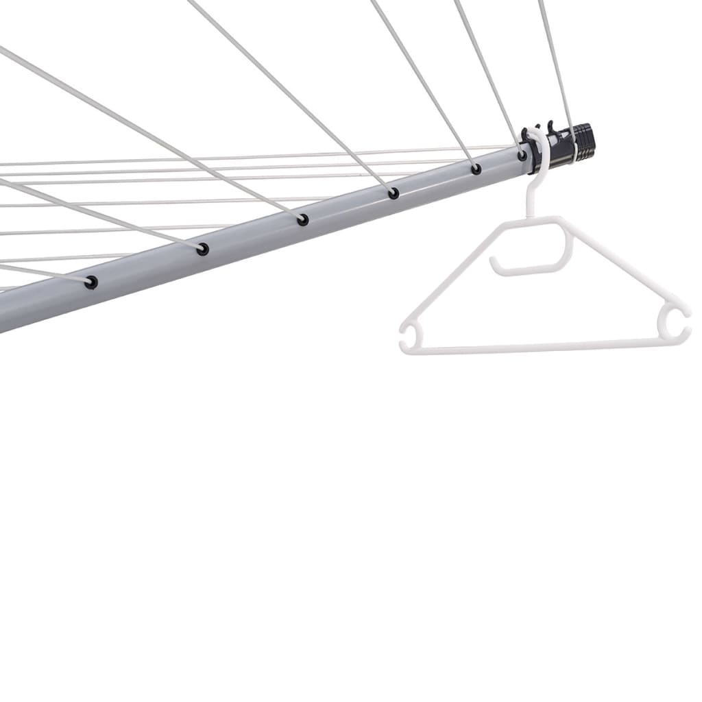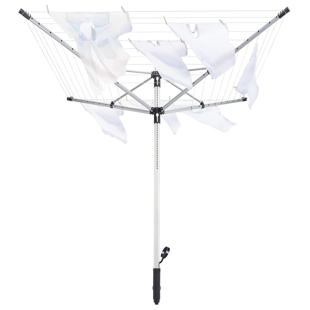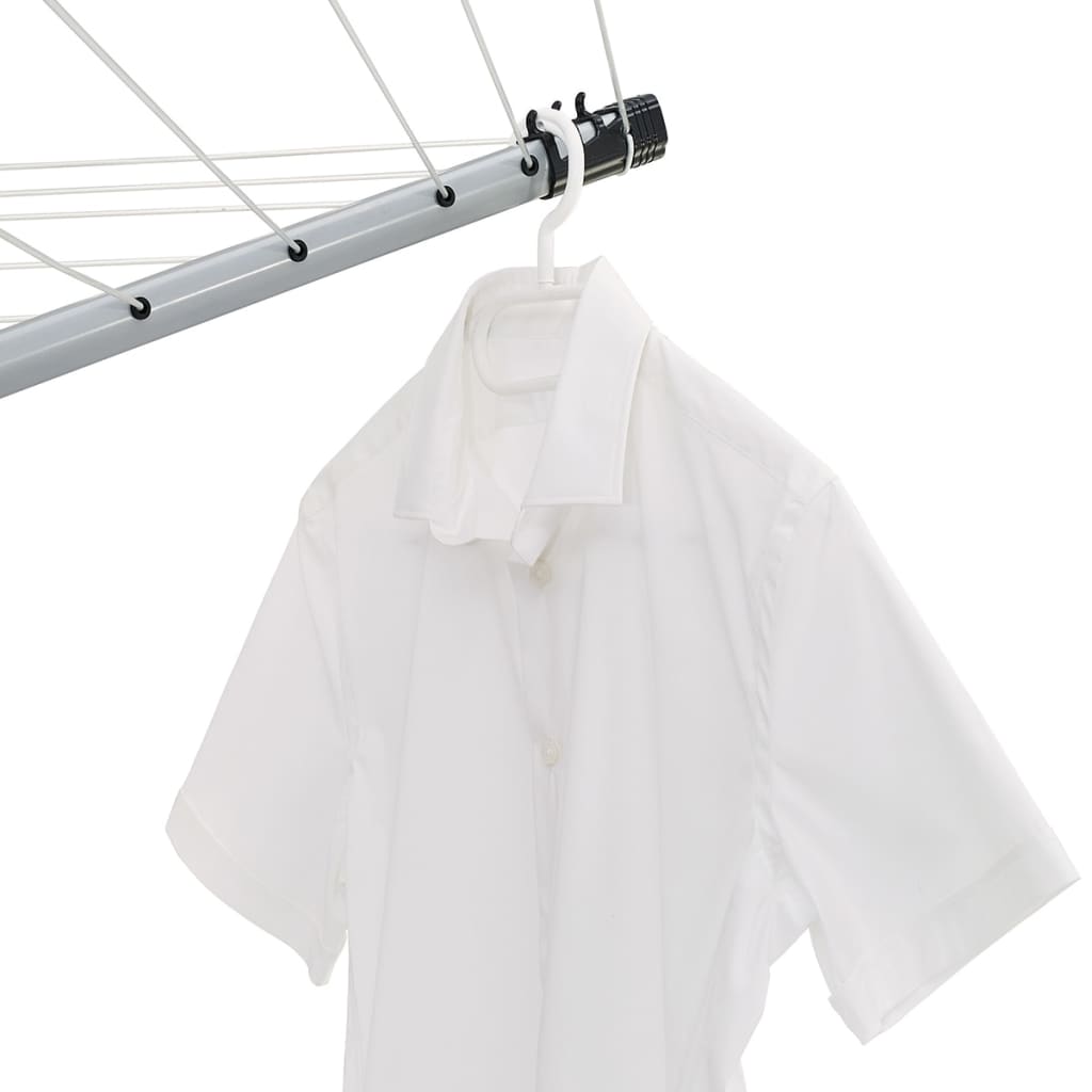 Le fil à linge du sèche-linge en forme de parapluie dispose d'un espace pour cinq charges de lessiveuse et il est prêt à être utilisé d'un seul geste. Les quatre bras du sèche-linge peuvent être ouverts facilement sans que les fils s'emmêlent grâce au système d'ouverture sophistiqué. La hauteur du fil peut varier facultativement entre 1,35 et 1,8 mètres. Un total de 12 crochets pour les portes-cintre sont distribués à travers les quatre bras rotatifs, tout en offrant un espace supplémentaire pour un séchage rapide et sans pli des chemisiers, des chemises et des T-shirts. Les bras de support en acier et le poteau central solide garantissent la robustesse du rotatif, même lorsqu'il est bien rempli de lessives.
