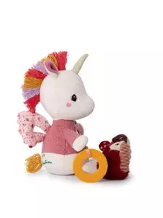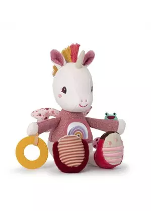 Peluche d'activités Lena la licorne, idéale pour l'éveil des bébés dès 9 mois.