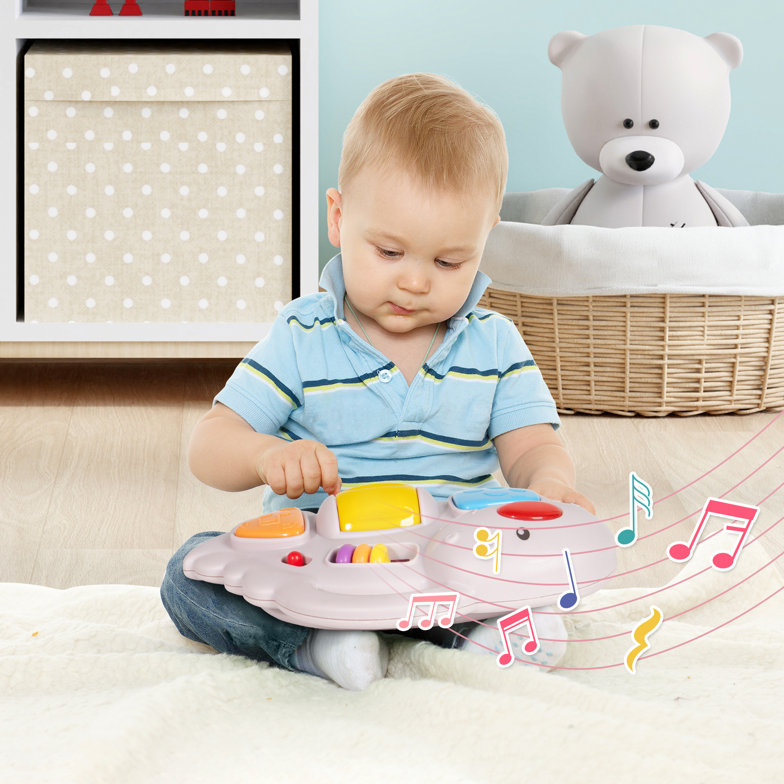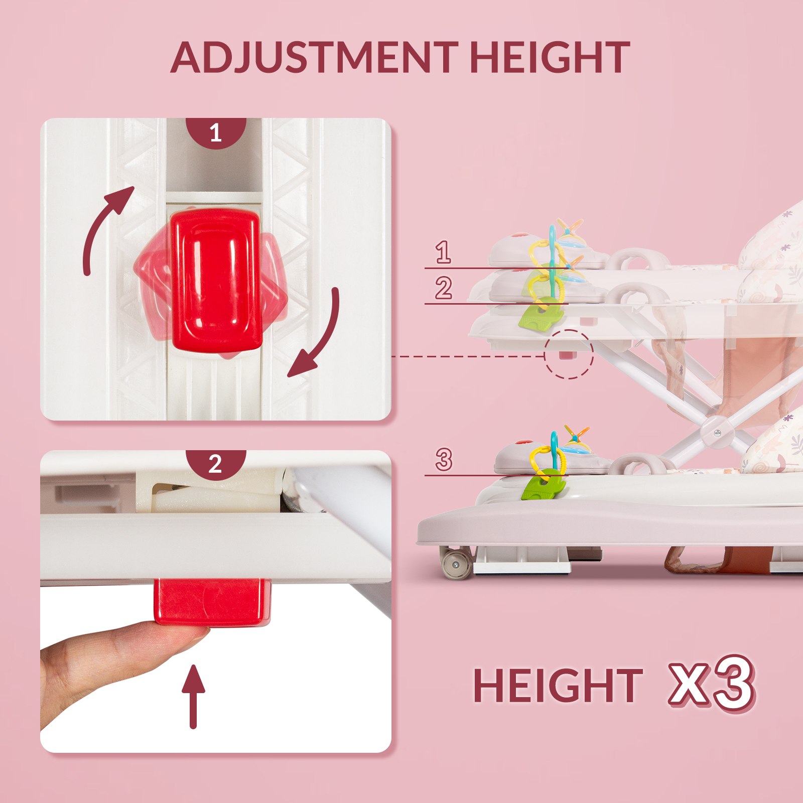 Conception de trotteur 3-en-1 - Le trotteur propose trois modes : Marche, Poussée et Alimentation. Le siège et la boîte à musique sont facilement amovibles, ce qui permet de passer librement d'un mode à l'autre. Les parents peuvent choisir le mode en fonction des besoins de votre bébé. Ce trotteur répond aux besoins des bébés à chaque étape, de 6 mois à 18 mois.Hauteur réglable et pliable - Le trotteur dispose de trois positions de hauteur réglables, ce qui vous permet de maintenir facilement votre enfant à la bonne hauteur au fur et à mesure de sa croissance. Le trotteur peut être facilement plié et déplié sans aucun outil, et il peut être commodément rangé et transporté après pliage.Solide, stable et doux pour la peau - Les trotteurs sont fabriqués en matériau PP de haute qualité et sûr, et le cadre est un tube d'aluminium épaissi, qui a une bonne capacité de charge. Le corps lisse et arrondi est exempt de bords tranchants et de bavures, assurant la tranquillité d'esprit à chaque toucher. La housse de siège respirante garantit le confort de votre bébé. La structure de support à quatre coins et le grand châssis assurent une stabilité accrue du centre de gravité.Vitesse contrôlable - Équipé de 2 roues en PU, 2 roues arrière de préhension et 6 plaquettes de frein. Les roues arrière de préhension peuvent être ajustées en desserrant et en serrant les vis pour réguler leur adhérence, agissant ainsi comme un régulateur de vitesse. En même temps, la bande de roulement douce en PU est plus résistante à l'usure que les roues ordinaires. Notre trotteur avec roues peut être silencieux, sans endommager le sol ou déranger le sommeil des voisins.Centre d'activités interactif - Le trotteur est équipé de musique et de jouets, y compris une boîte à musique, une balle tournante et un pendentif de dessin animé. Ce centre offre un temps de jeu amusant pour vos enfants. Remarque : Nécessite 3 piles AA (non incluses).