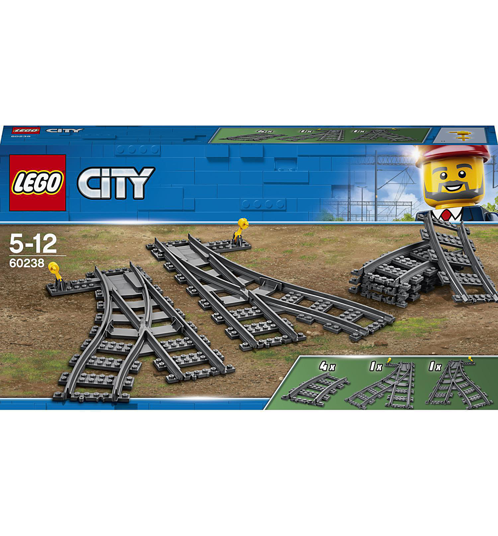 Les rails des trains LEGO City peuvent être rajoutés avec les pièces du set Les aiguillages LEGO City 60238 pour s’amuser encore plus à transporter des passagers ou des marchandises. Cet ensemble, qui comprend 4 rails courbés, un aiguillage orienté vers la droite et un aiguillage orienté vers la gauche, est compatible avec tous les ensembles de train LEGO City.Contient 8 piècesComprend 4 rails courbés, 1 aiguillage orienté vers la droite et un aiguillage orienté vers la gauche. Les rails peuvent être rajoutés aux ensembles de train LEGO City dont le Train de marchandises télécommandé 60198 LEGO pour encore plus de fun !Nombre de pièces : 8 piècesÂge : 5-12 • Comprend 4 rails courbés, 1 aiguillage orienté vers la droite et un aiguillage orienté vers la gauche. • Les rails peuvent être rajoutés aux ensembles de train LEGO City dont le Train de marchandises télécommandé 60198 LEGO pour encore plus de fun !