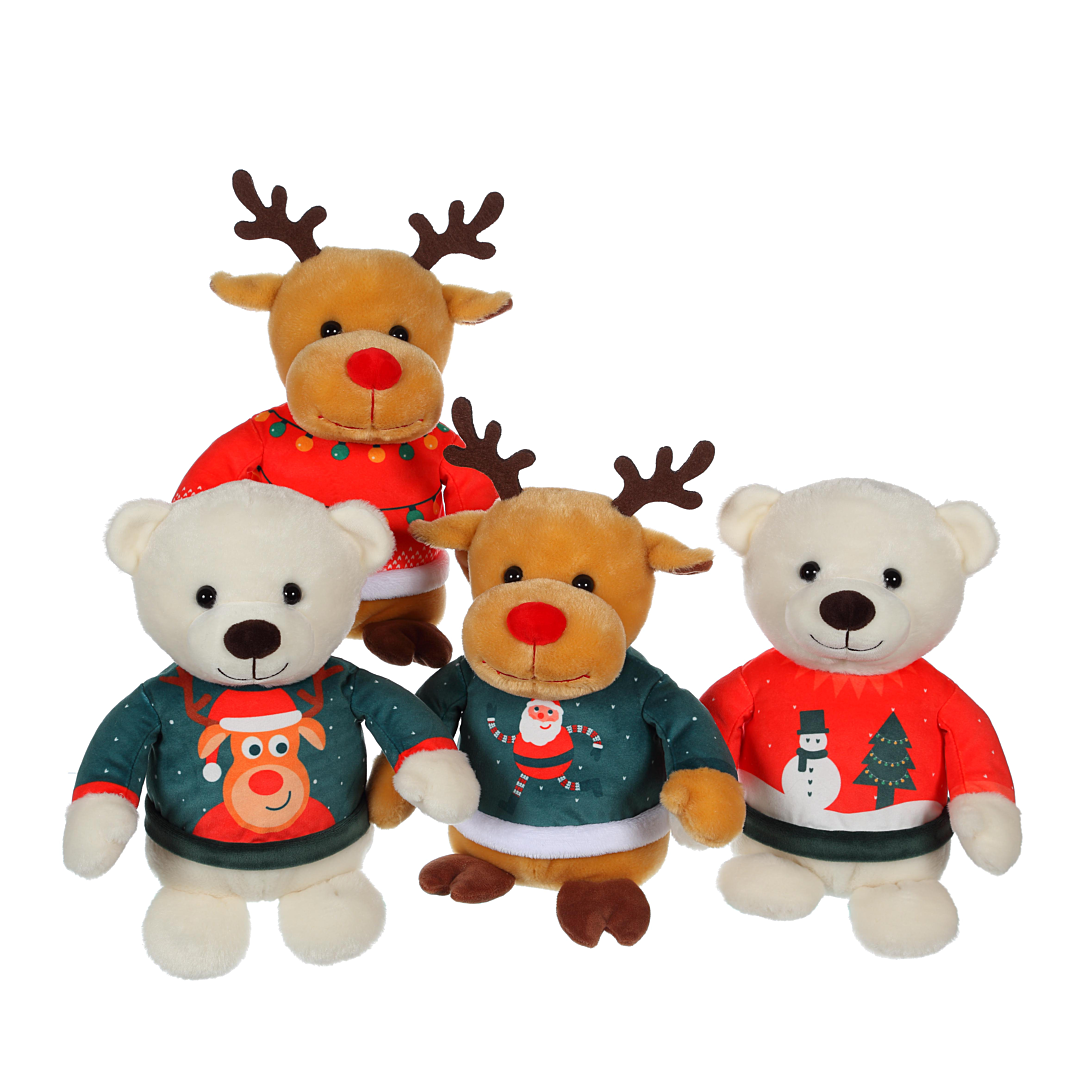 Craquez pour ces adorables ours et rennes de 24 cm en peluche portant fièrement leur « pull moche » de Noël... Des peluches extra douces à câliner pendant la période de Noël !