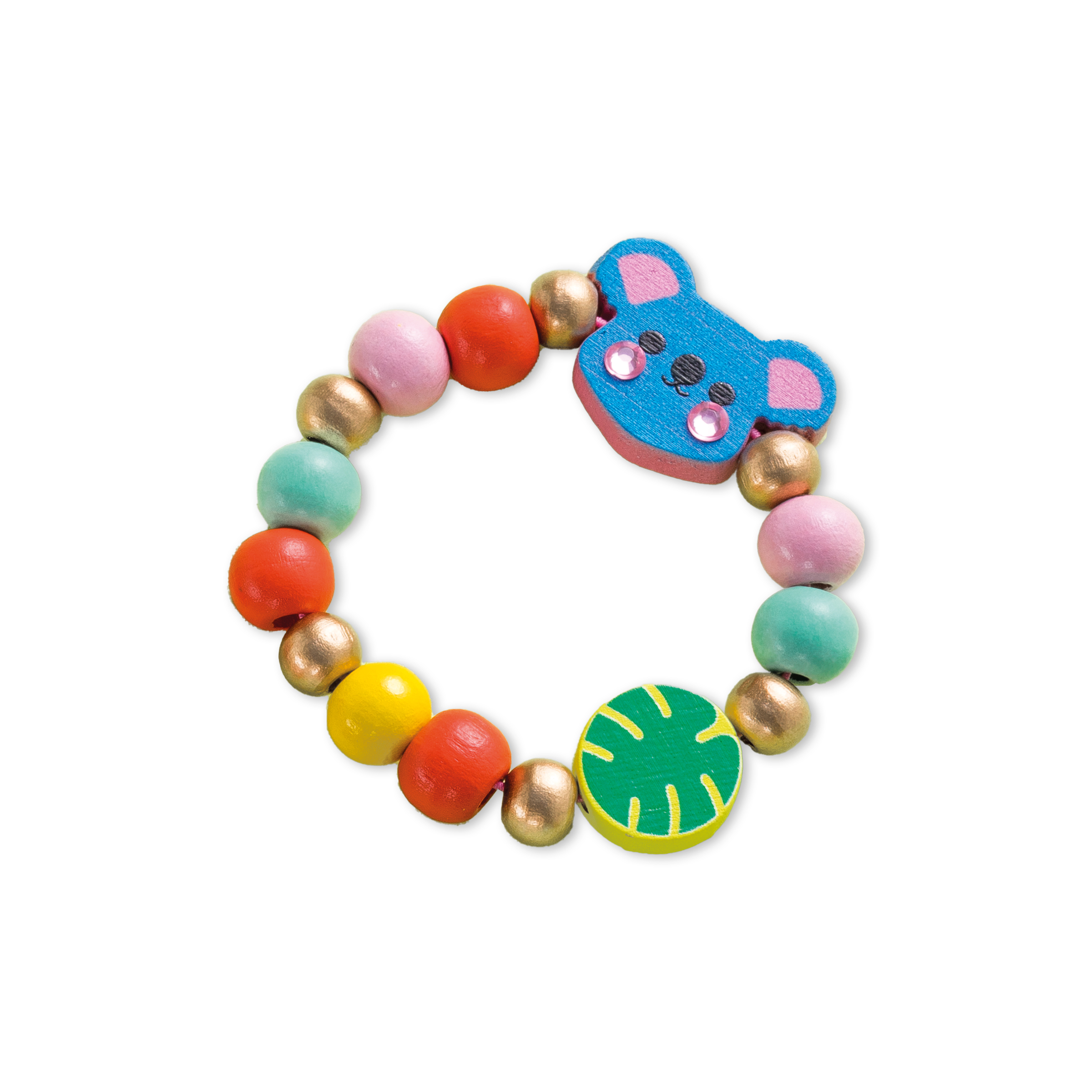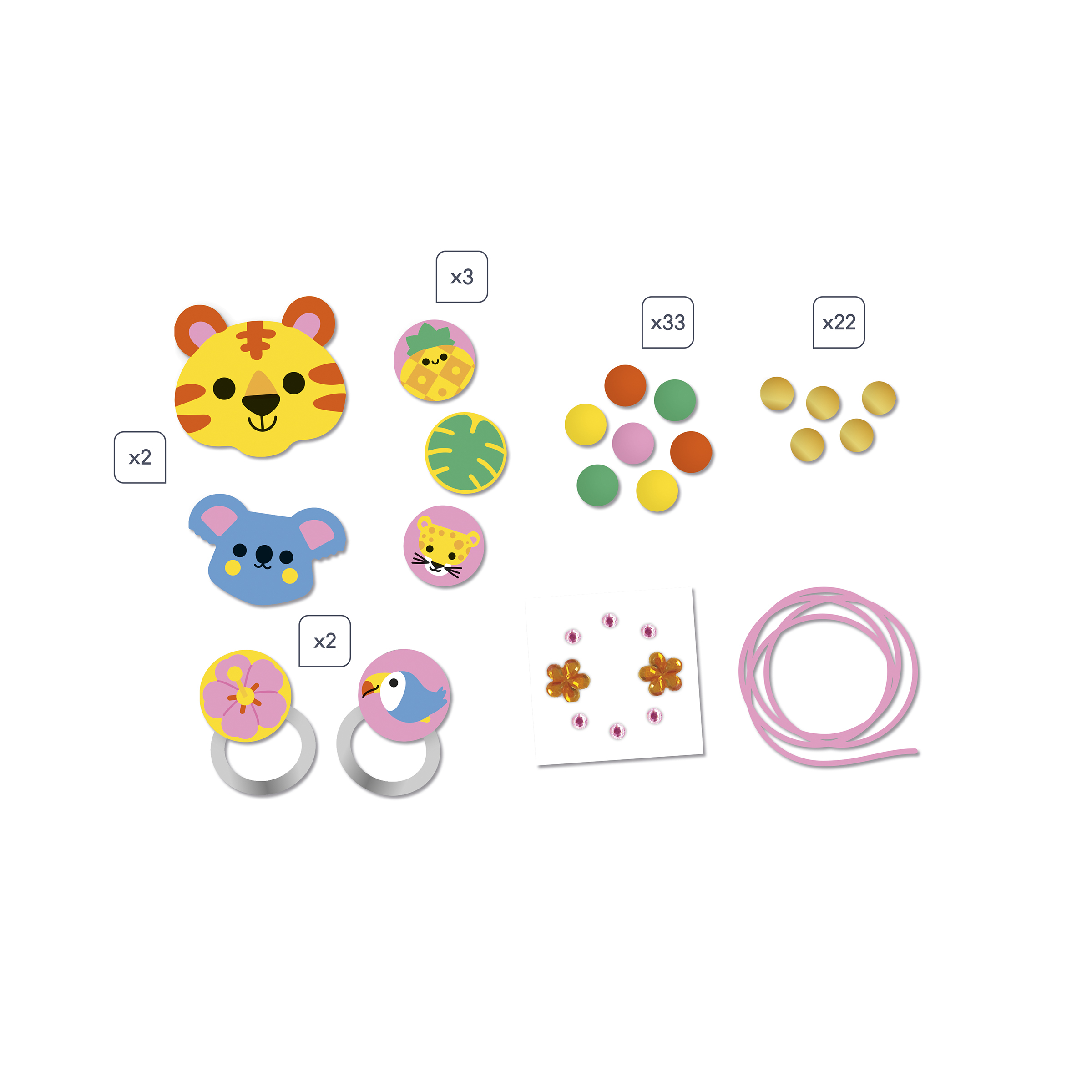 Créé ta parure de bijoux en bois ! Ce coffret permet de réaliser 1 collier, 1 bracelet et 2 bagues sur le thème de la jungle grâce à un contenu complet : 2 perles en bois sillhouettées et imprimées, 3 perles rondes imprimées en bois, 33 perles rondes colorées, 22 perles dorées, 2 bagues avec perles en bois plates imprimées, 1 planche de 8 strass, 1 fil élastique et 1 livret avec les instructions et les modèles. La boîte devient un sac à main tout mignon dans lequel on peut ranger ses bijoux et autres petits secrets. Cette activité permet de développer sa créativité et sa motricité et convient aux enfants à partir de 4 ans.