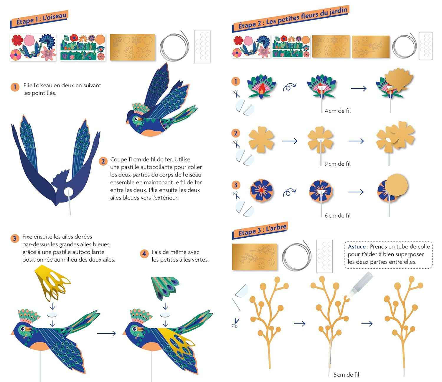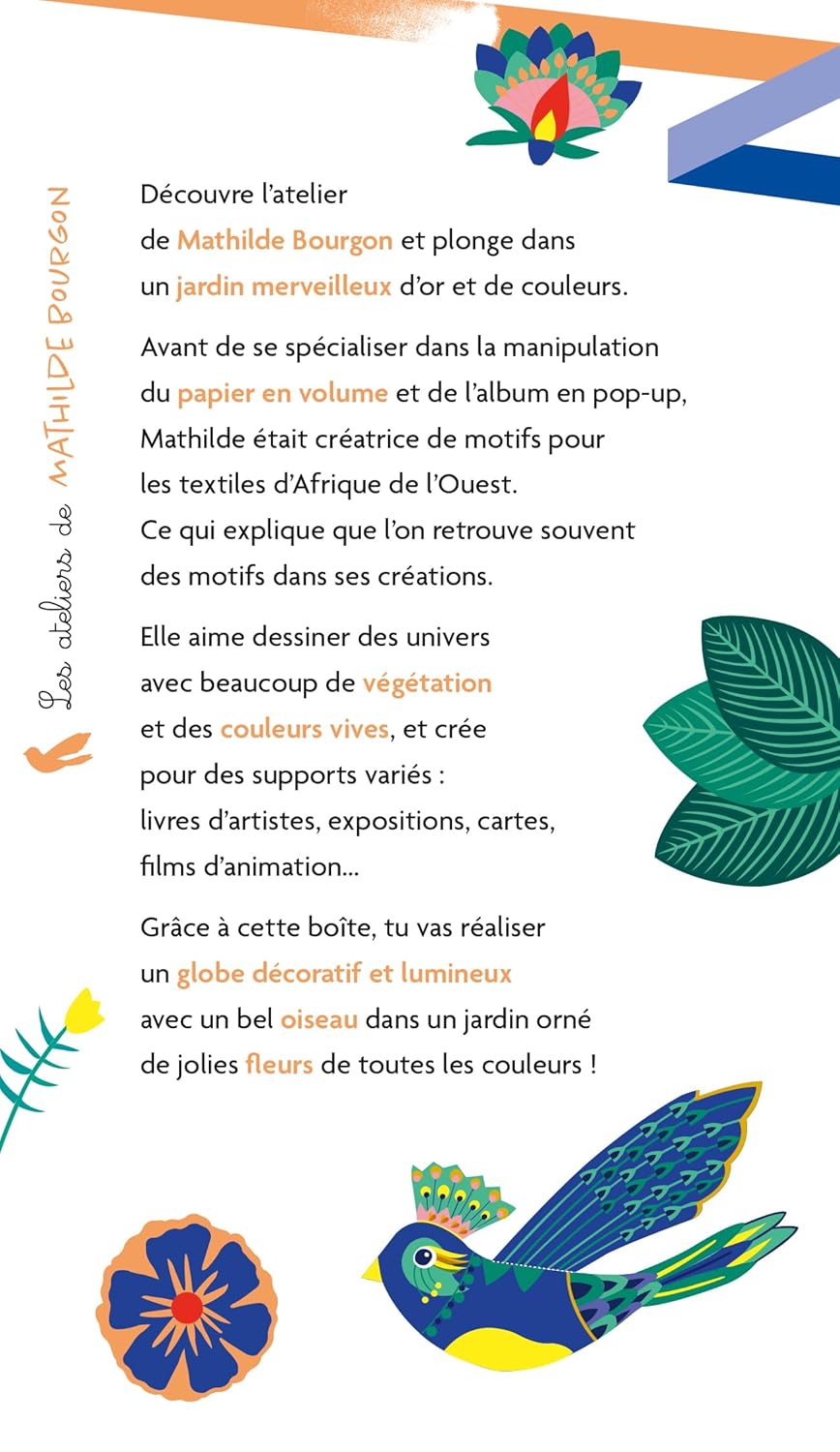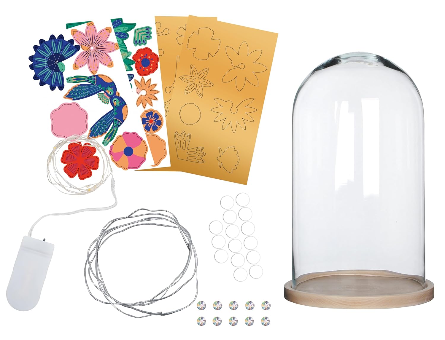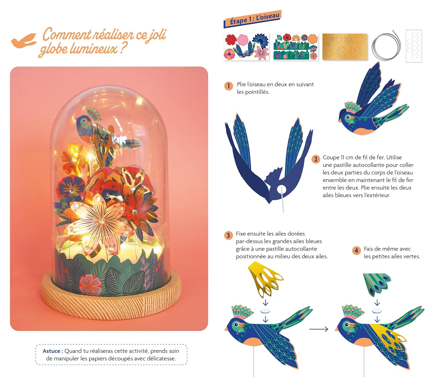 Une boîte contenant tout le matériel pour réaliser une décoration lumineuse sous globe représentant un oiseau et un jardin merveilleux. Accessoires : des planches imprimées prédécoupées avec des touches de dorure et de pantone fluo, des feuilles dorées, des strass, une base en mousse, des fils de fer souples, une guirlande lumineuse de 10 leds, 1 globe en plastique avec socle en bois et 1 pas à pas de 8 pages. Oiseau et fleurs sont à assembler et à accrocher sur des fils d'aluminium plantés dans une base en mousse. La création est finalisée par la guirlande lumineuse et transforme le globe en lampe.