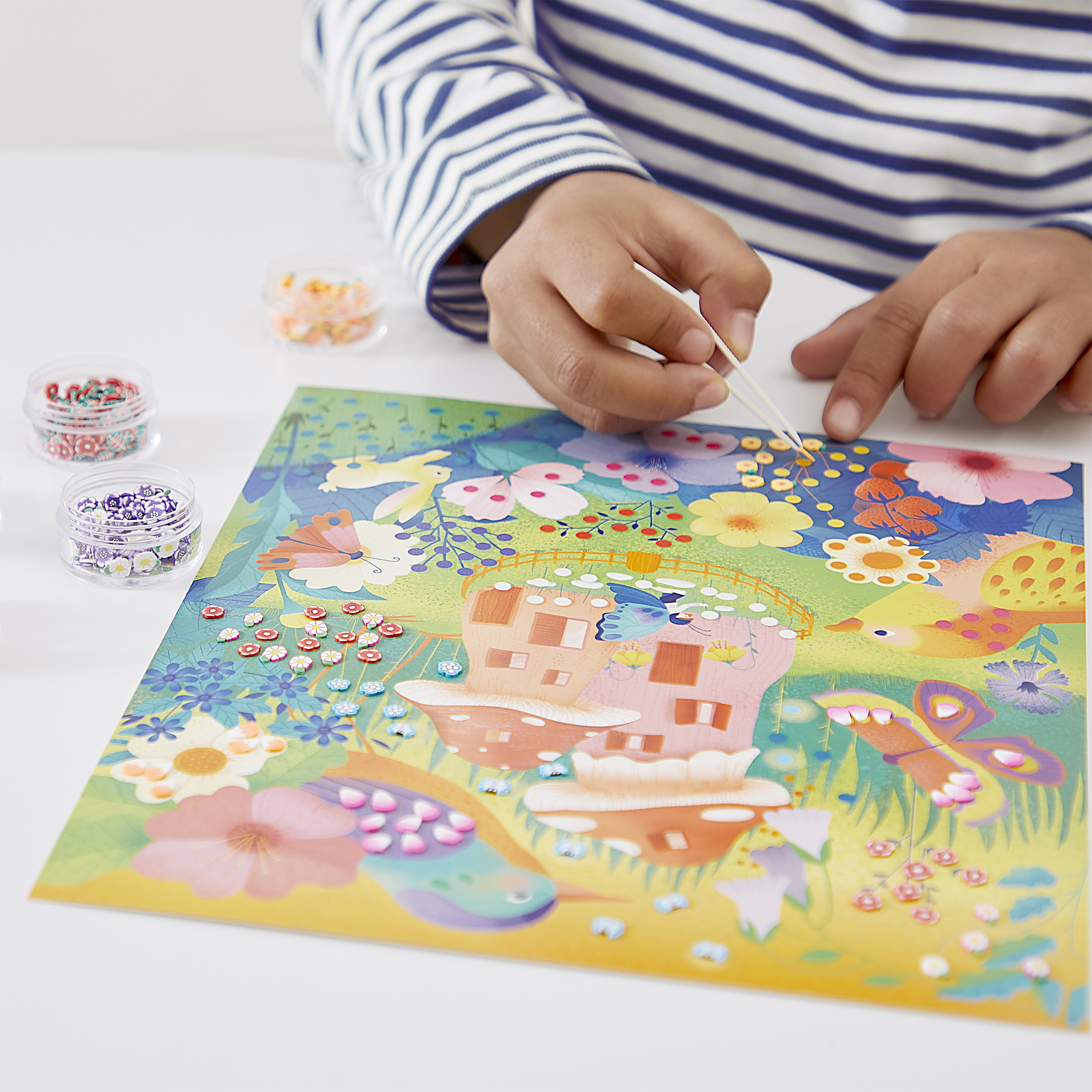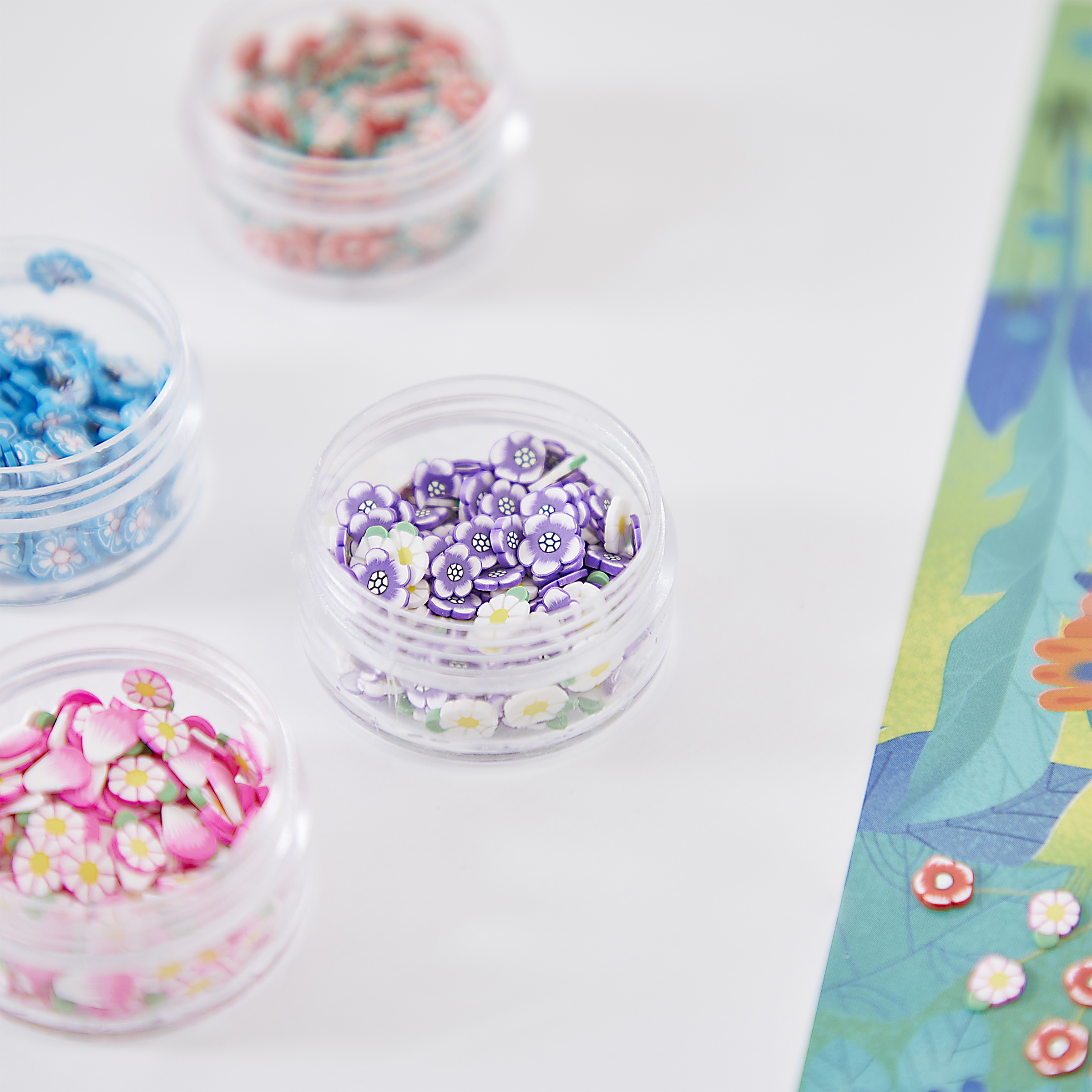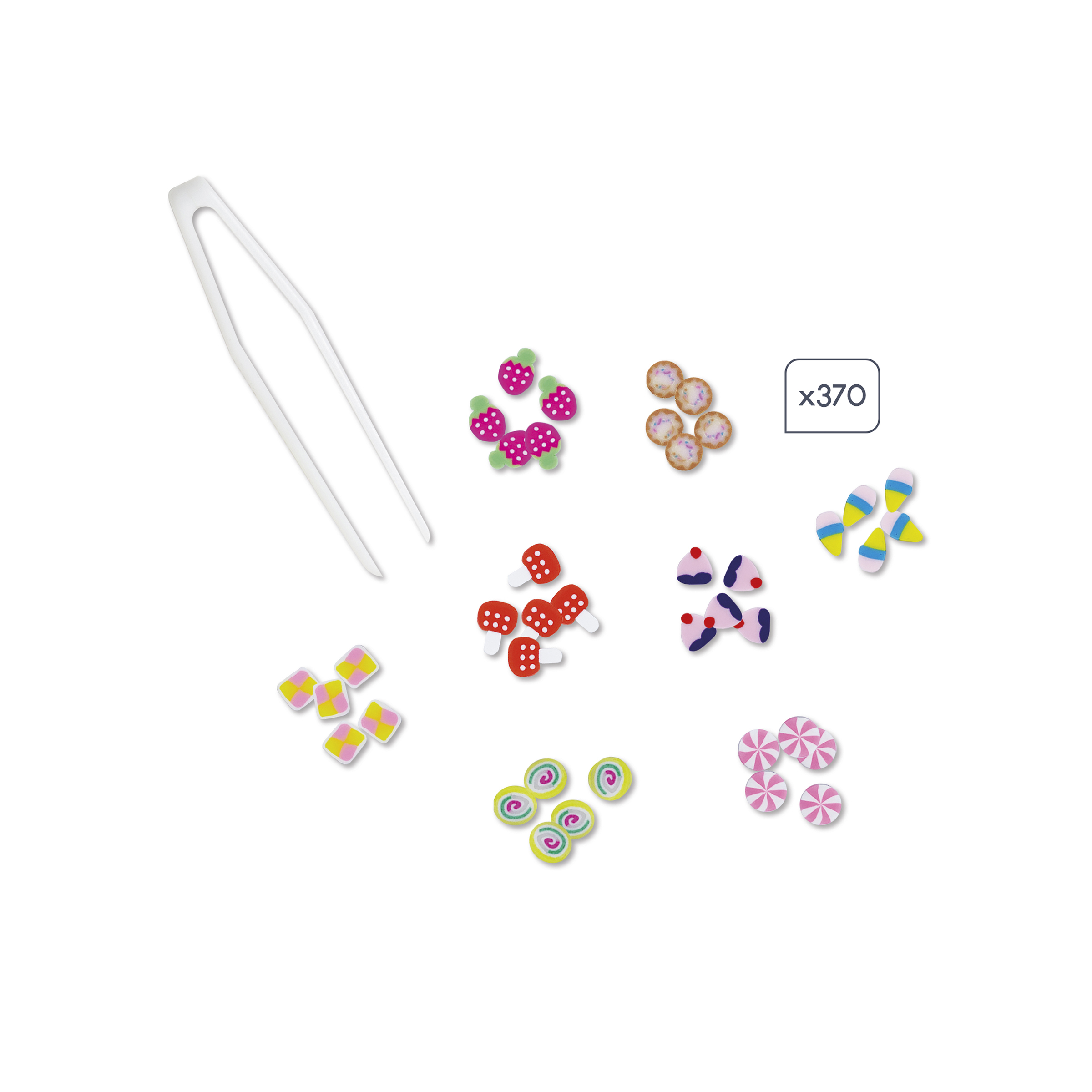 | La boîte contient | 5 tableaux autocollants, 870 mini-canes en pâte polymère rangées dans 5 petites boîtes rondes transparentes, 1 pince, 1 livret avec modèles et instructions |
