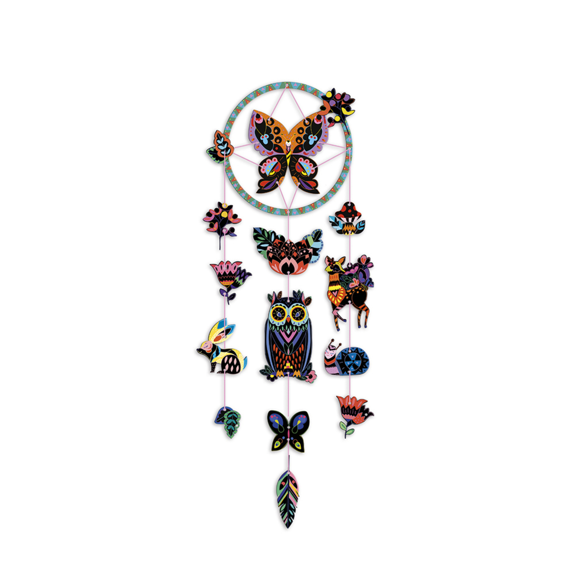 La boîte contient 2 tableaux à gratter, 2 masques à gratter, 2 élastiques, 1 moulin à gratter avec son set, 2 porte-clefs à gratter, 1 attrape-rêve à gratter, du fil, 1 outil en bois, 1 livret avec les modèles et les instructions