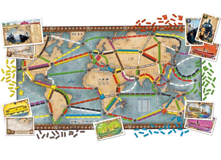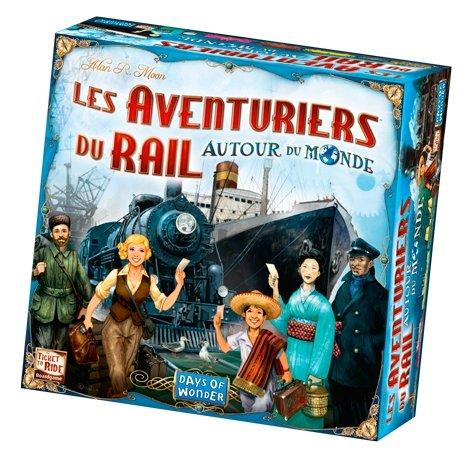à partir de 8 ans 30 min à 1 heure 2 à 5 joueur(s) Les Aventuriers du Rail Autour du monde est une nouvelle version du célèbre jeu d'aventures ferroviaires.Les joueurs rassemblent des cartes de différents types (trains et bateaux) pour s'emparer des voies ferrées et maritimes sur un plateau double-face richement illustré représentant la carte du monde d'un côté et celle des Grands Lacs d'Amérique du Nord de l'autre.La série des Aventuriers du Rail passe à la vitesse supérieure avec ces deux nouveaux plateaux, qui conviendront aussi bien aux familles qu'aux vétérans du jeu.Mettez les voiles vers de nouveaux horizons ! MATÉRIEL 1 plateau de jeu double-face (le monde / les grands lacs)165 wagons en plastique (33 bleus, rouges, verts, jaunes et noirs)250 bateaux en plastique (50 de chaque couleur)140 cartes Transport (80 cartes Wagon et 60 cartes Bateau)120 cartes Destination (65 pour le monde, 55 pour les Grands Lacs)15 ports (3 de chaque couleur)5 marqueurs de score