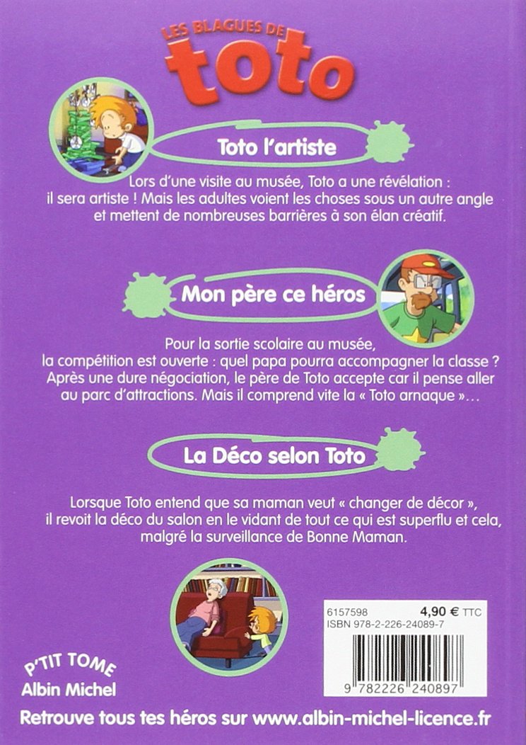 Les blagues de Toto Toto l'artiste Lors d'une visite au musée, Toto a une révélation : il sera artiste ! Mais les adultes voient les choses sous un autre angle et mettent de nombreuses barrières à son élan créatif. Mon père ce héros Pour la sortie scolaire au musée, la compétition est ouverte : quel papa pourra accompagner la classe ? Après une dure négociation, le père de Toto accepte car il pense aller au parc d'attractions. Mais il comprend vite la « Toto arnaque »... La Déco selon Toto Lorsque Toto entend que sa maman veut « changer de décor », il revoit la déco du salon en le vidant de tout ce qui est superflu et cela, malgré la surveillance de Bonne Maman.