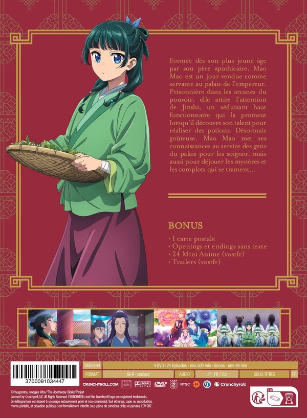 Formée dès son plus jeune âge par son père apothicaire, Mao Mao est un jour vendue comme servante au palais de l'empereur. Prisonnière dans les arcanes du pouvoir, elle attire l'attention de Jinshi, un séduisant haut fonctionnaire qui la promeut lorsqu'il découvre son talent pour confectionner des potions. Désormais goûteuse, Mao Mao met ses connaissances au service des gens du palais pour les soigner, mais aussi pour déjouer les mystères et les complots qui se trament...