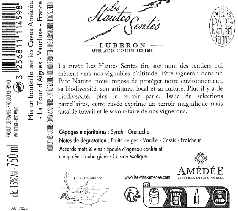 | Libellé | Les Caves AMEDEE Les Hautes Sentes, 2022 - Luberon AOP - Rouge - 75 cl |